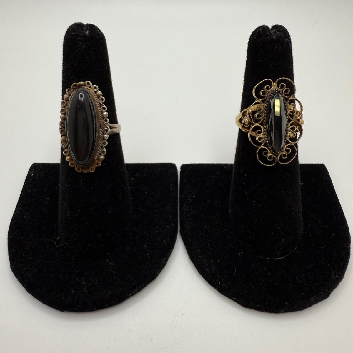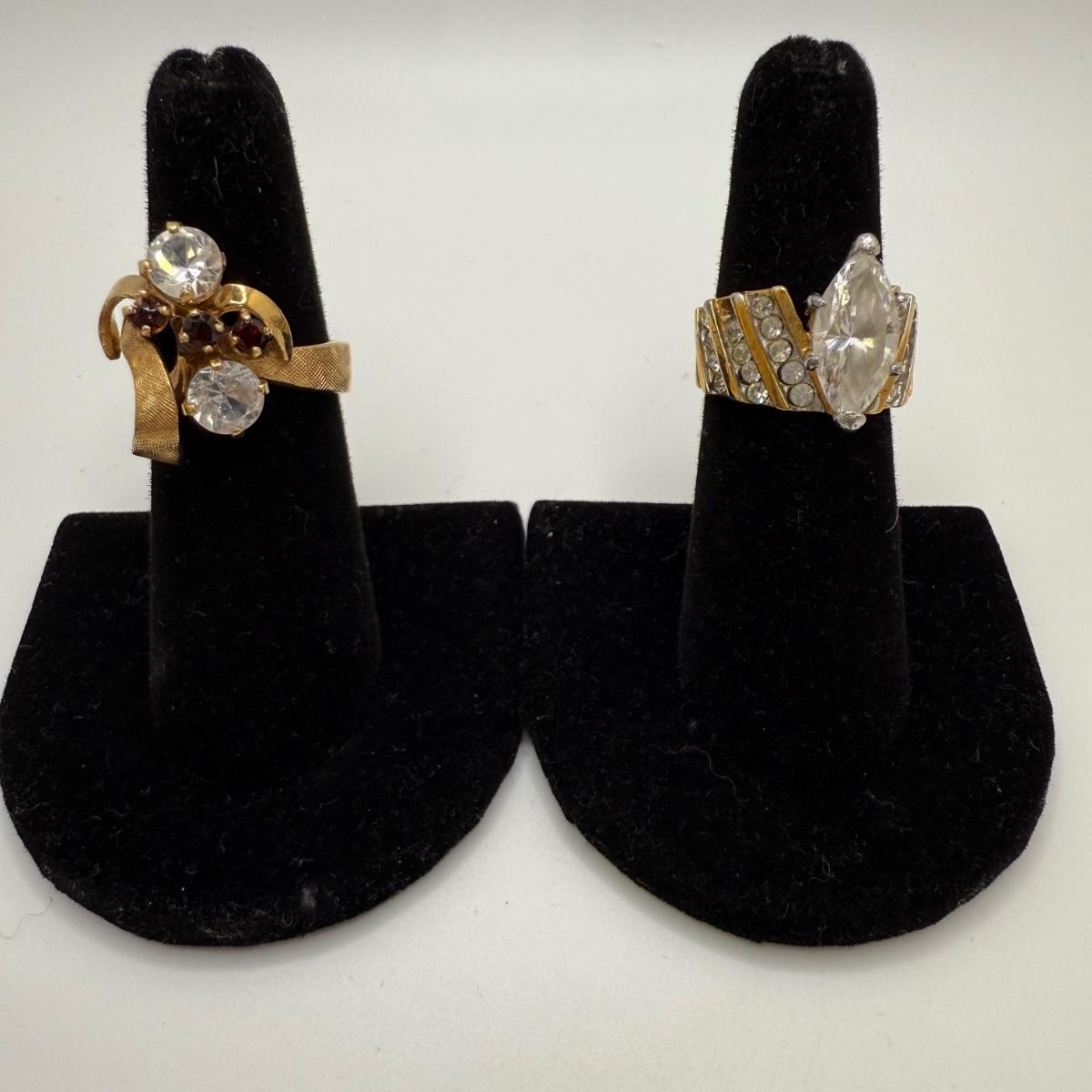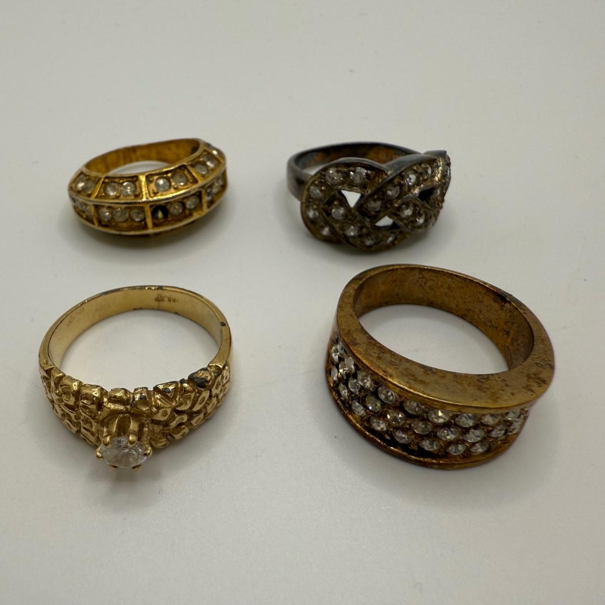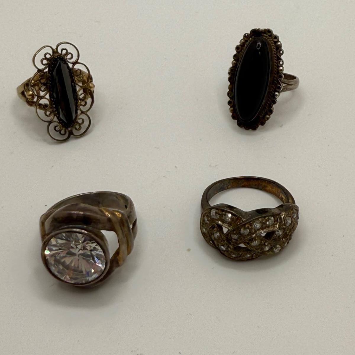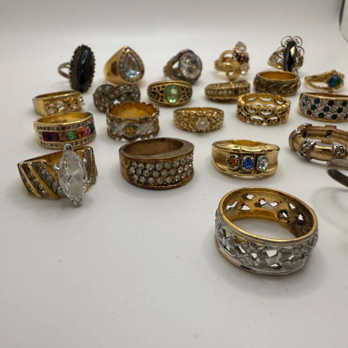 Large ring collection with 25+ rings. The two rings with the long black stones, as well as the ring with the large sparkly round gemstone and the one with a knot design, are marked as 925/Sterling (all shown together in the last photo). Many others have marks. Some overall wear and condition issues. Please see photos for inventory and details. If no picture is shown inside the band, no marking was found. Most rings are around size 6/7/8.