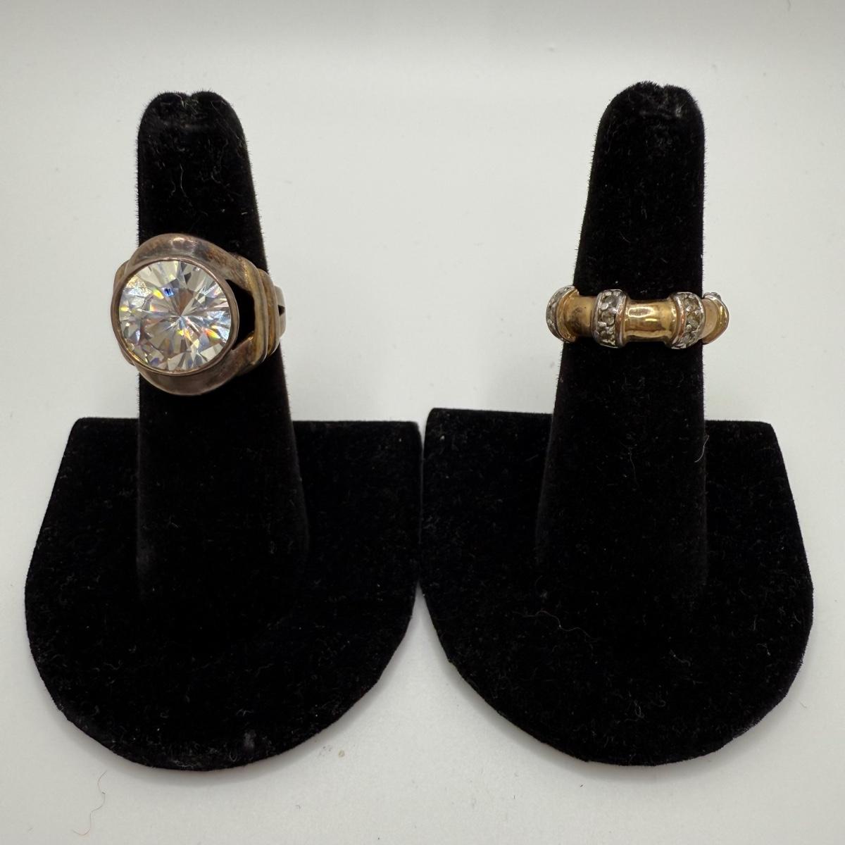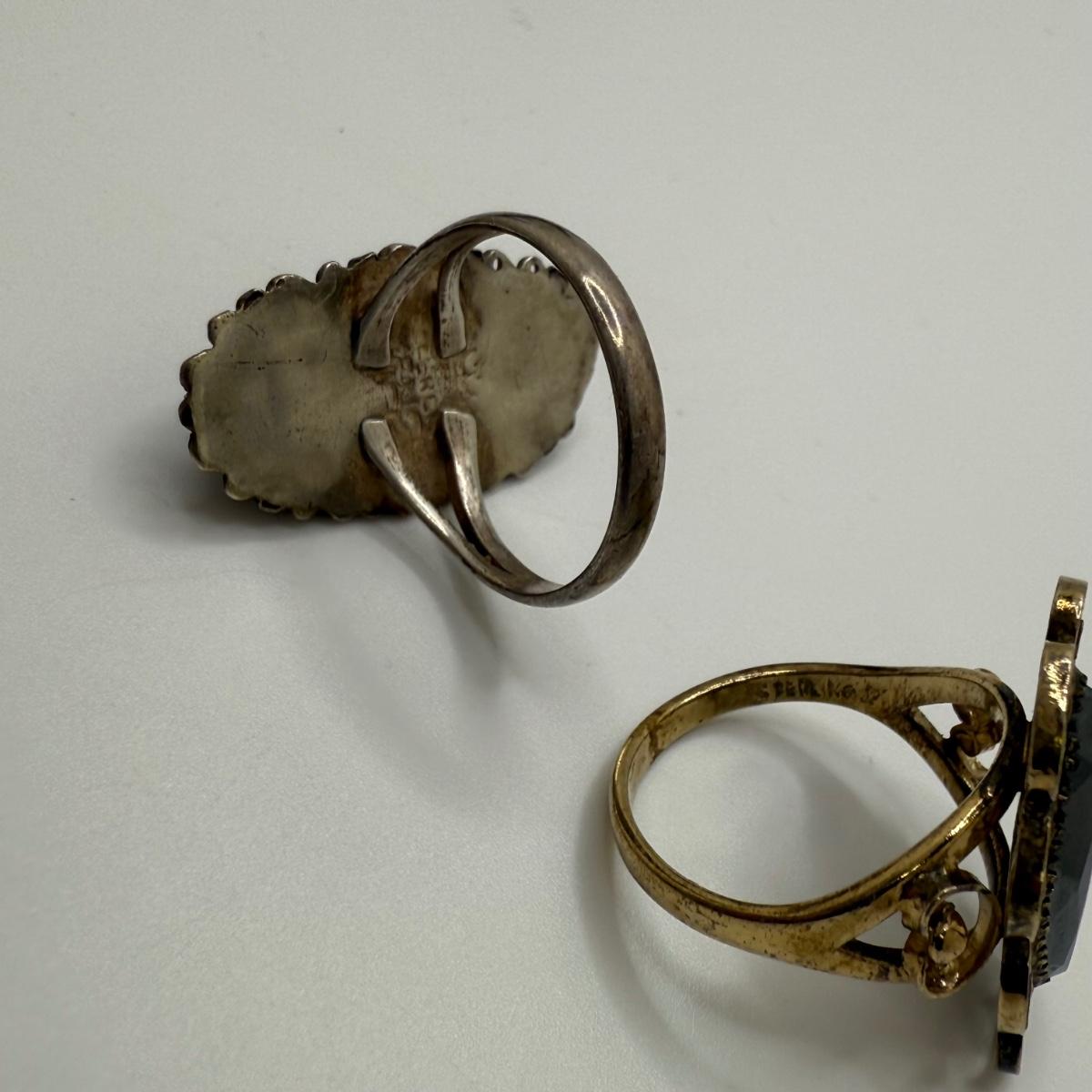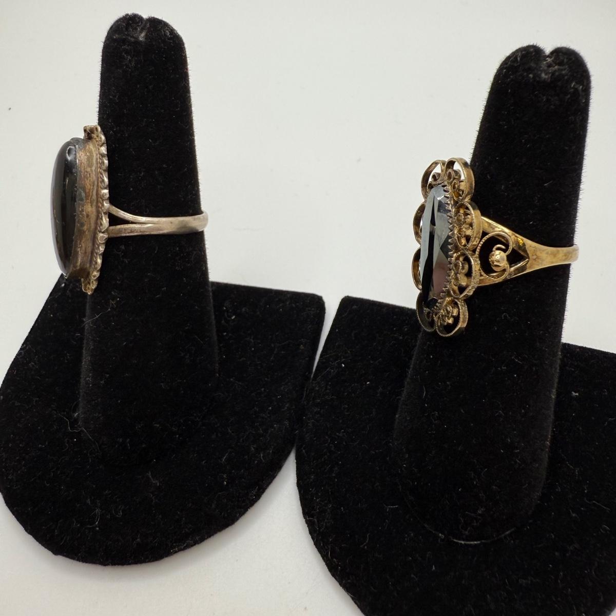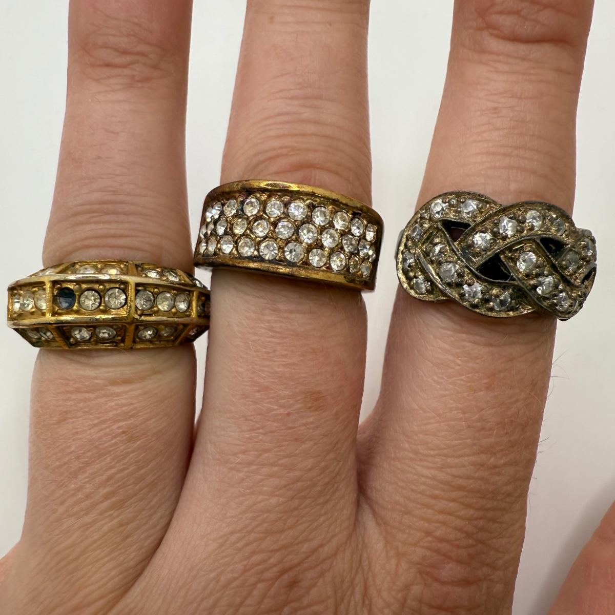 Large ring collection with 25+ rings. The two rings with the long black stones, as well as the ring with the large sparkly round gemstone and the one with a knot design, are marked as 925/Sterling (all shown together in the last photo). Many others have marks. Some overall wear and condition issues. Please see photos for inventory and details. If no picture is shown inside the band, no marking was found. Most rings are around size 6/7/8.