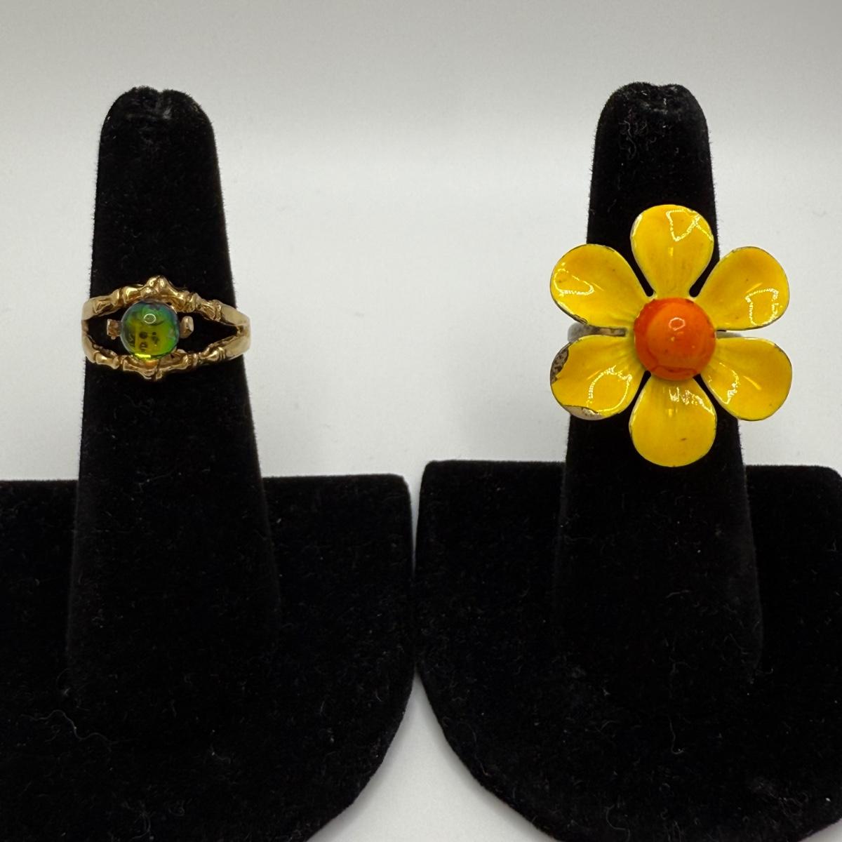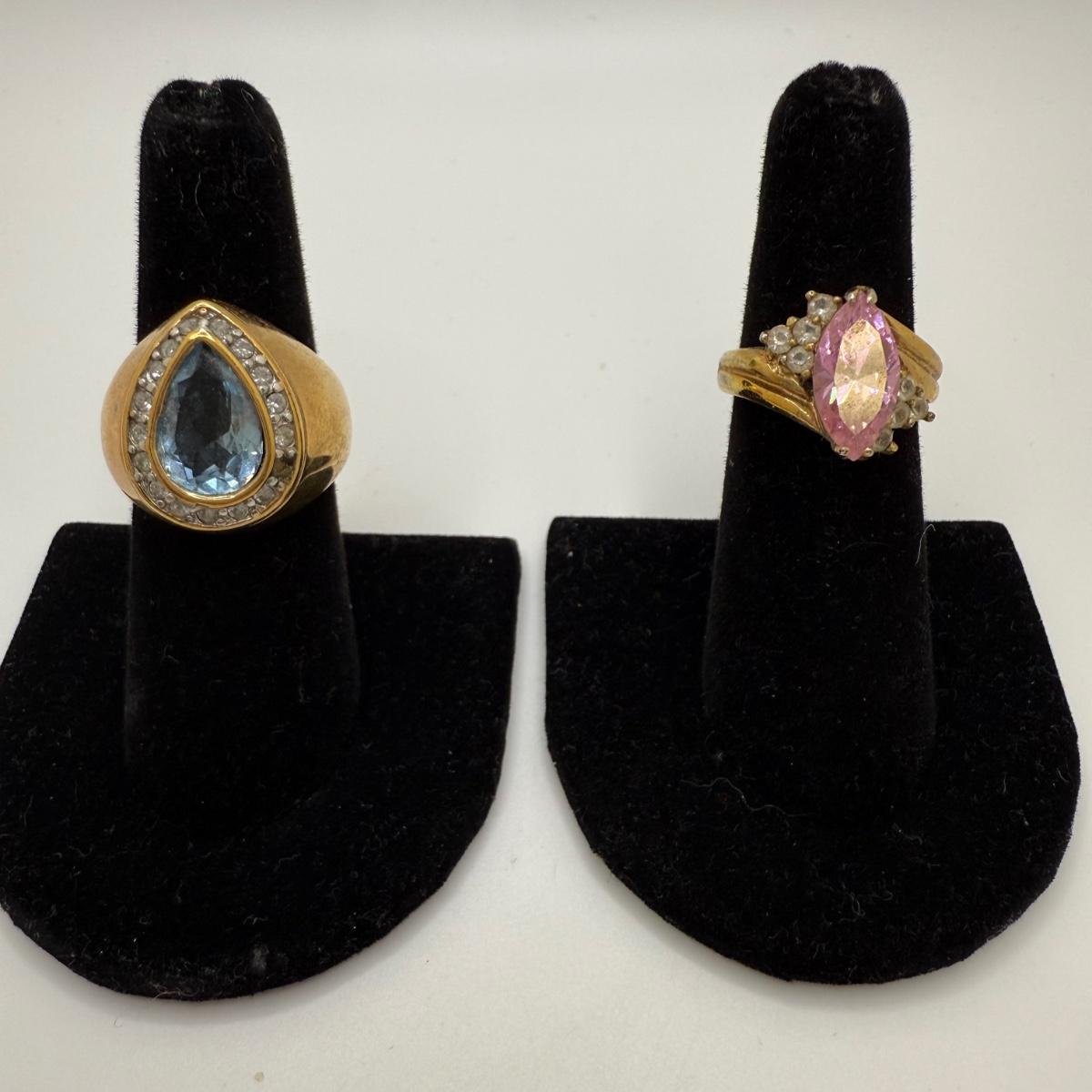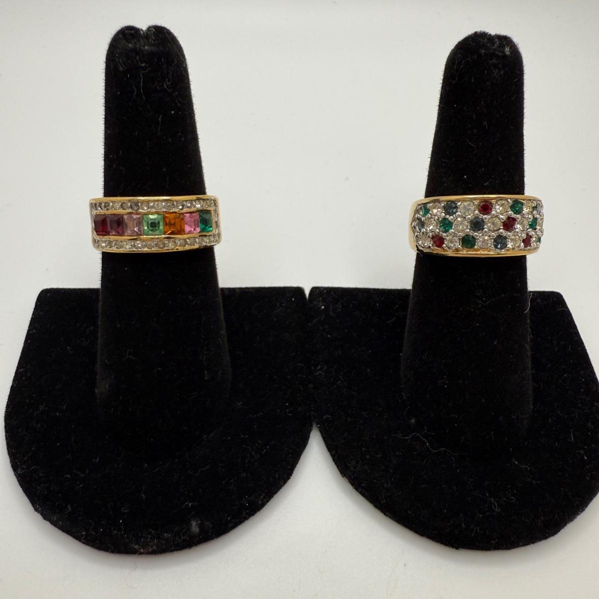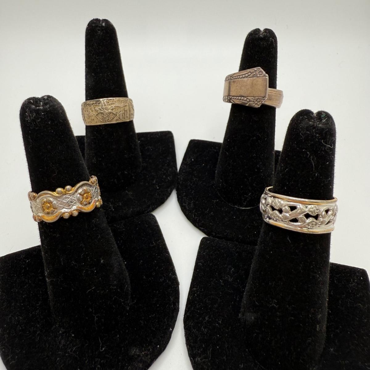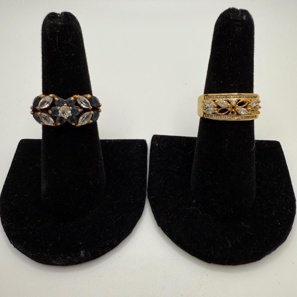 Large ring collection with 25+ rings. The two rings with the long black stones, as well as the ring with the large sparkly round gemstone and the one with a knot design, are marked as 925/Sterling (all shown together in the last photo). Many others have marks. Some overall wear and condition issues. Please see photos for inventory and details. If no picture is shown inside the band, no marking was found. Most rings are around size 6/7/8.