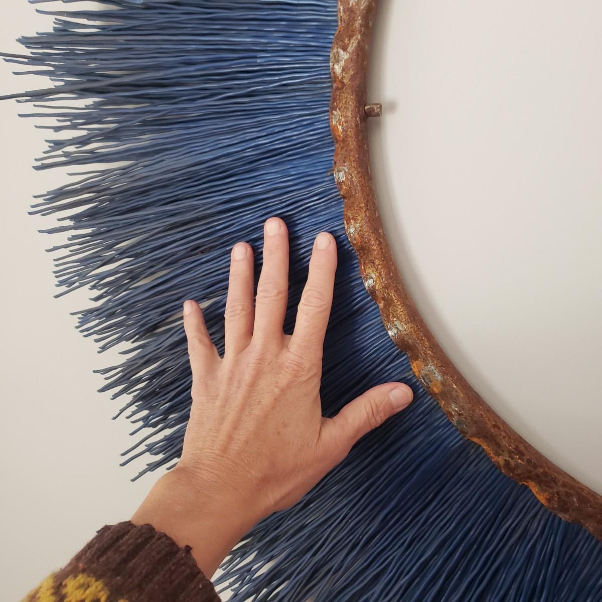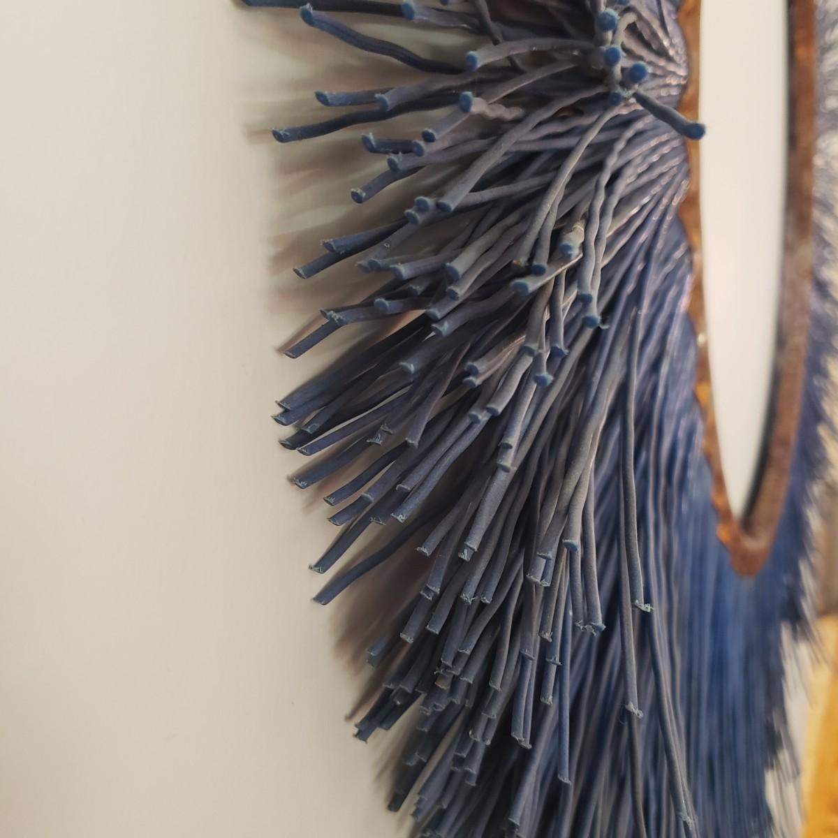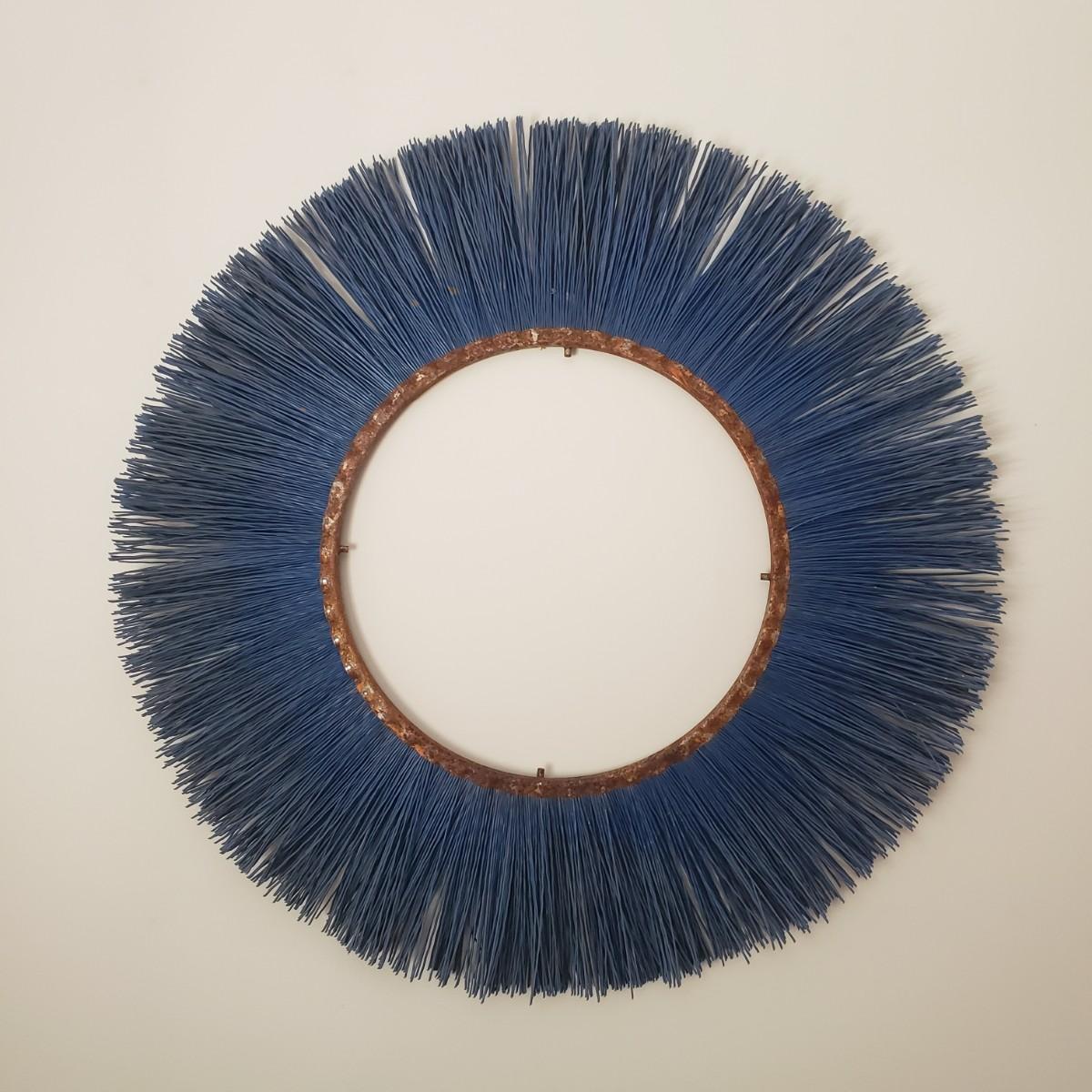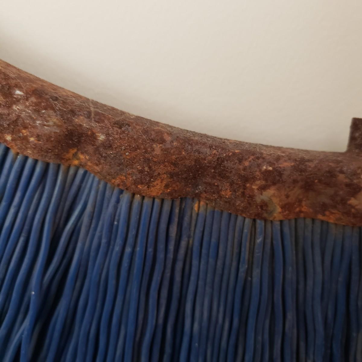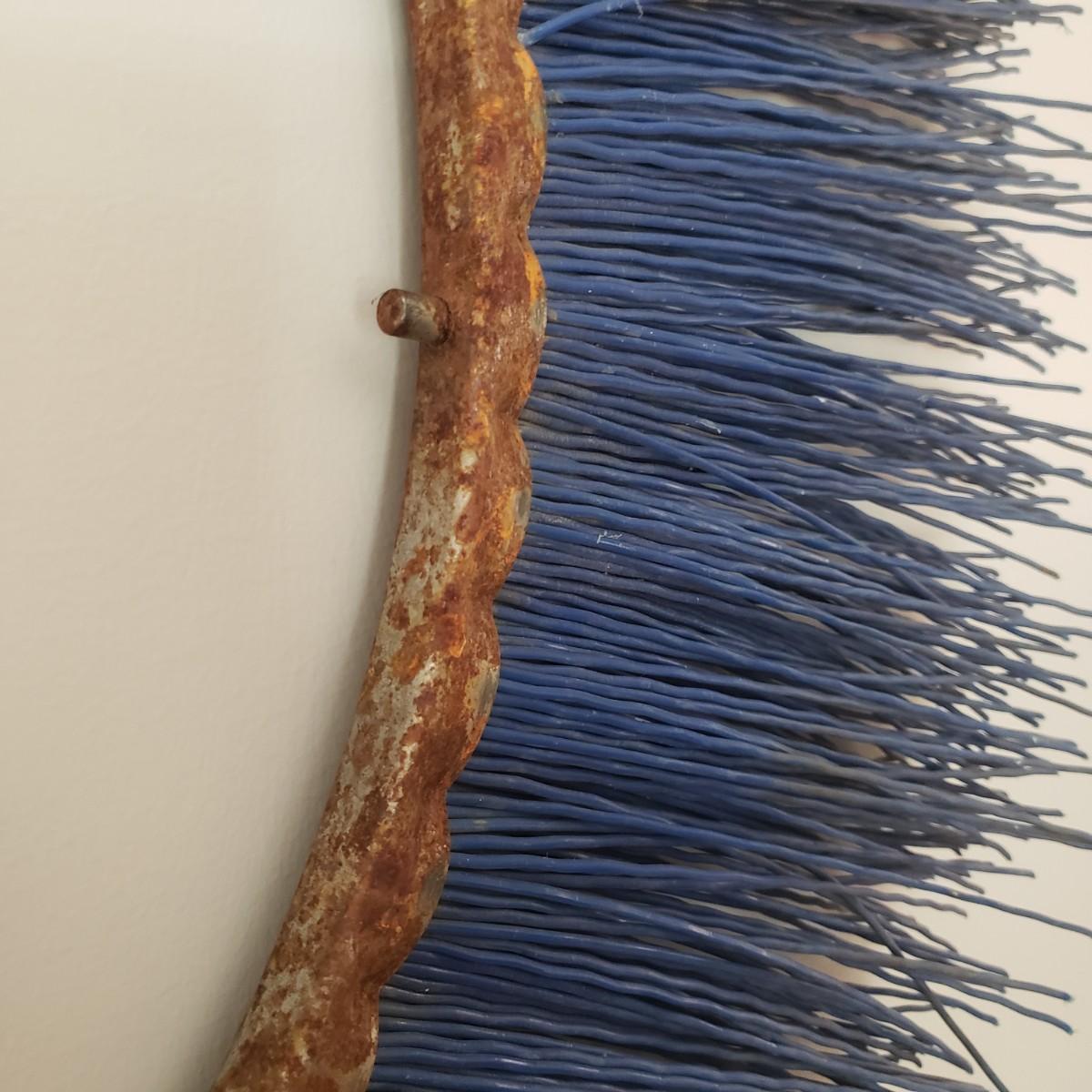 This large bristled road sweeper makes some cool, interesting art! This piece has a rustic metal rim with blue plastic bristles and measures 39"D.