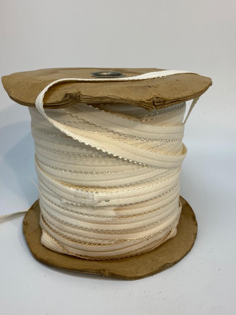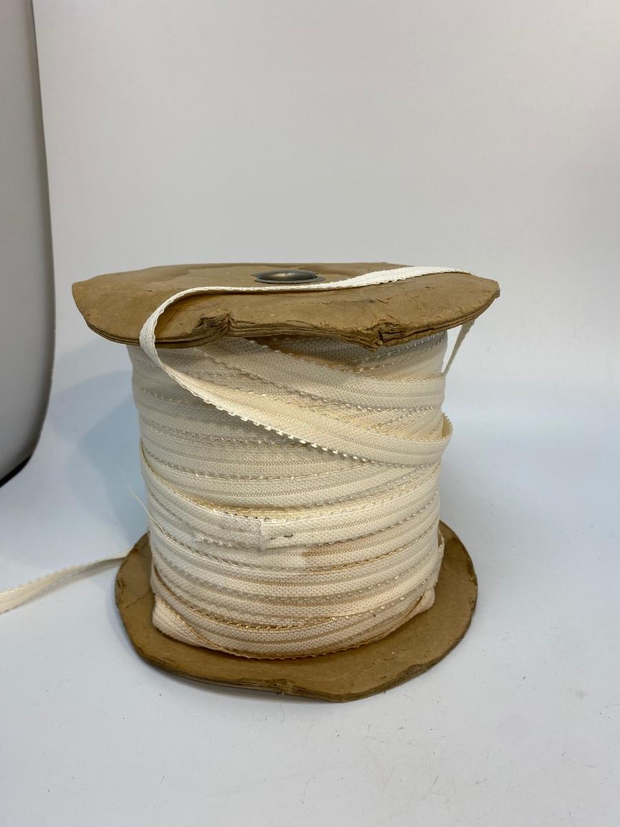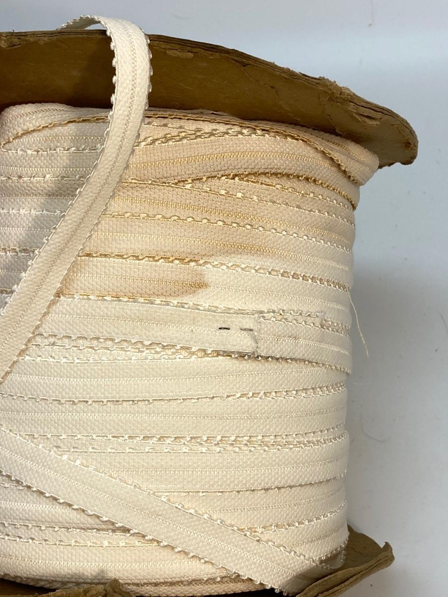 Large roll of 1/2" lightweight elastic. Soft elastic, good for clothing and other sewing projects. Not sure exactly how much is on the roll, but it is more than half full and large. There is some discolor or staining, and the cardboard is weathered like it got wet possibly from being improperly stored.