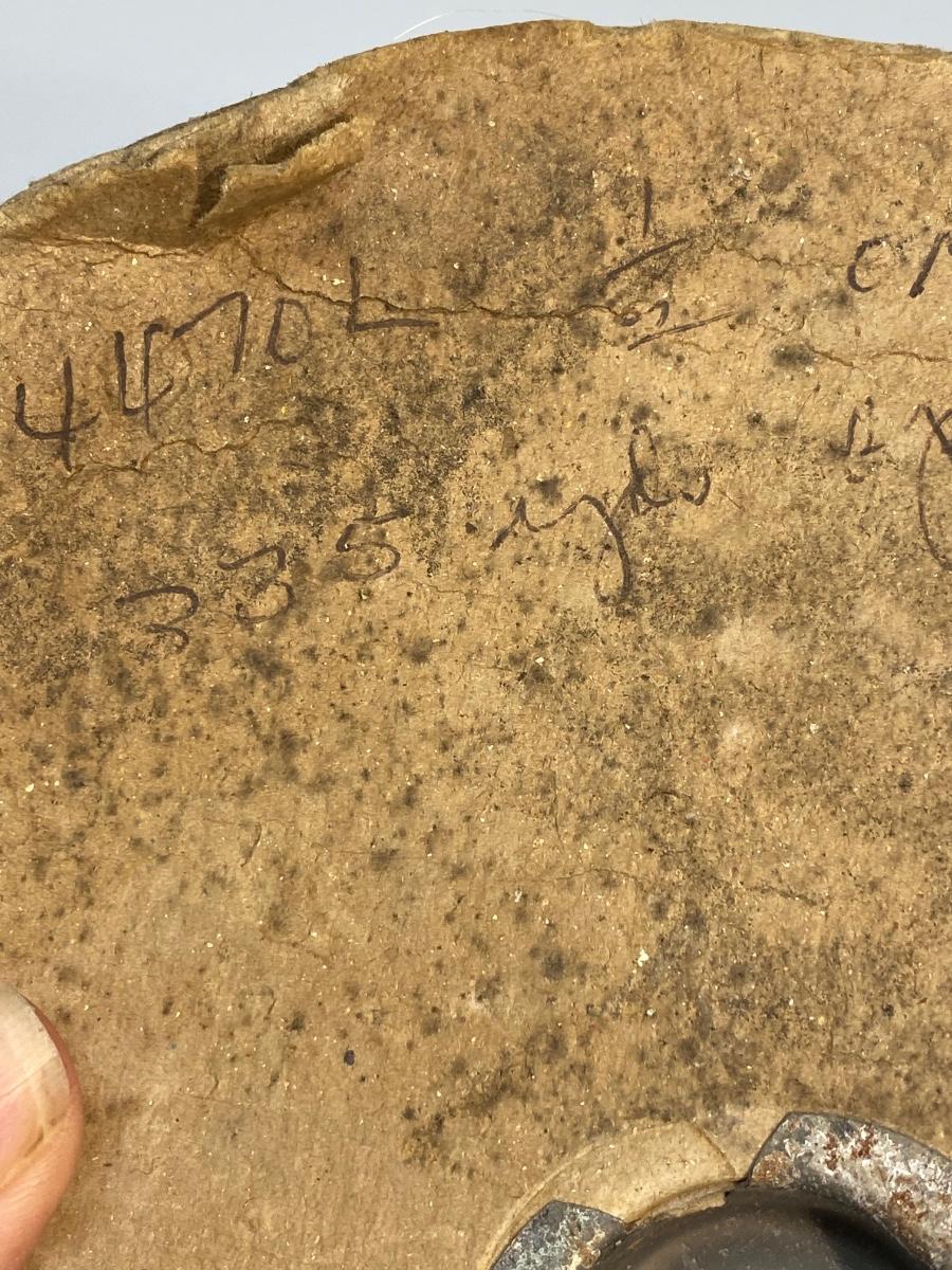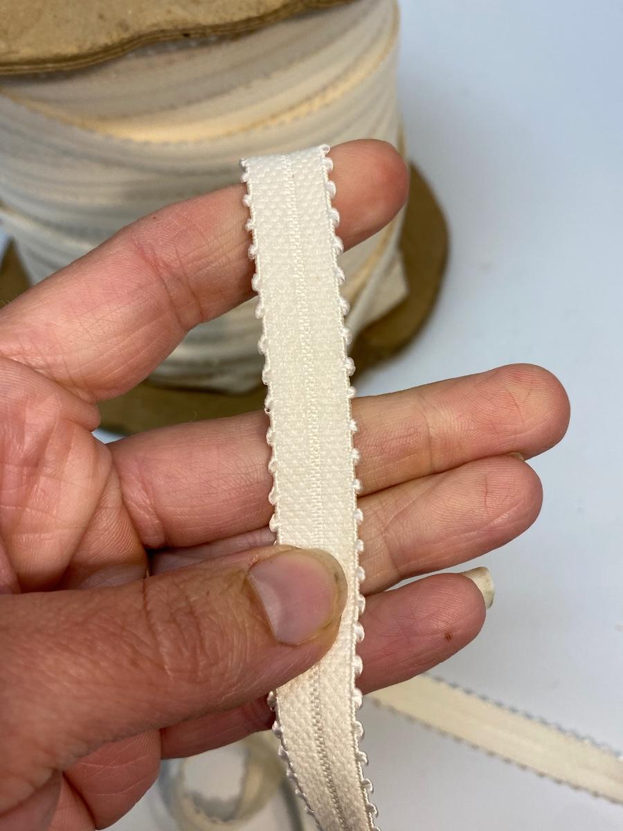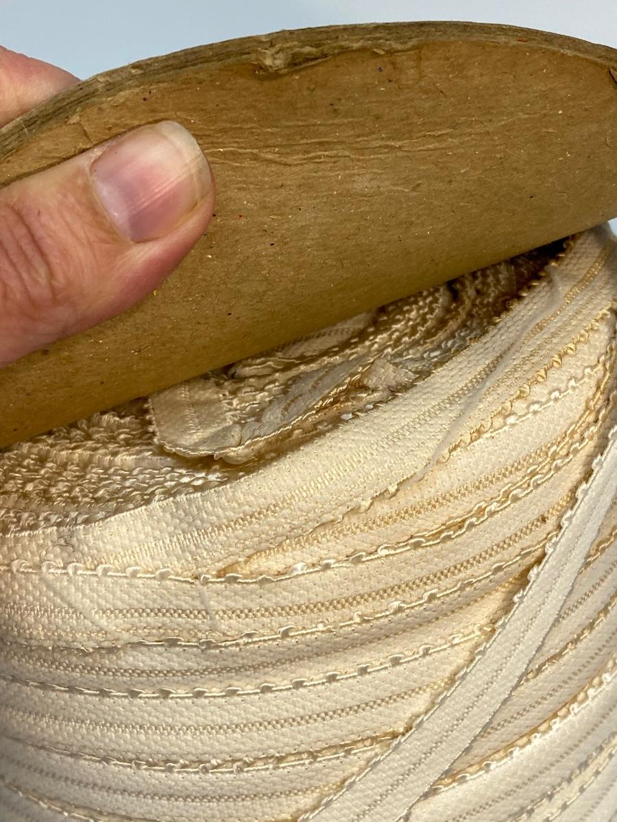 Large roll of 1/2" lightweight elastic. Soft elastic, good for clothing and other sewing projects. Not sure exactly how much is on the roll, but it is more than half full and large. There is some discolor or staining, and the cardboard is weathered like it got wet possibly from being improperly stored.