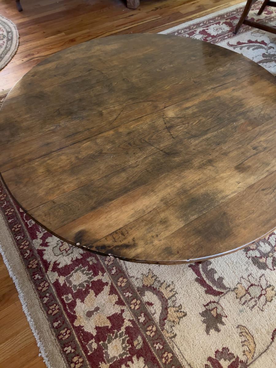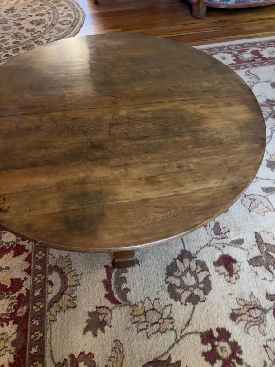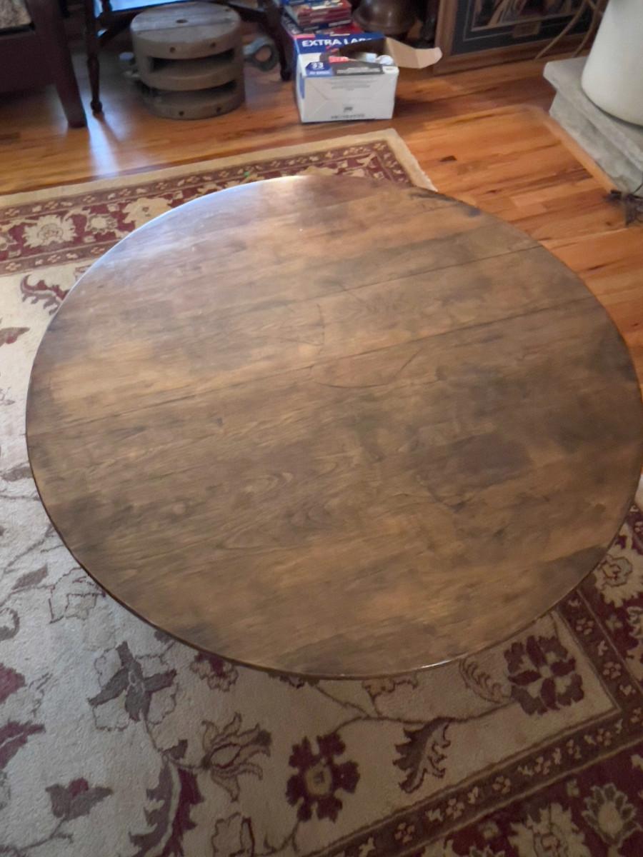 42" Diameter stands 15" Tall. Its been refinished and its actually an old dining table that’s been converted to a coffee table.