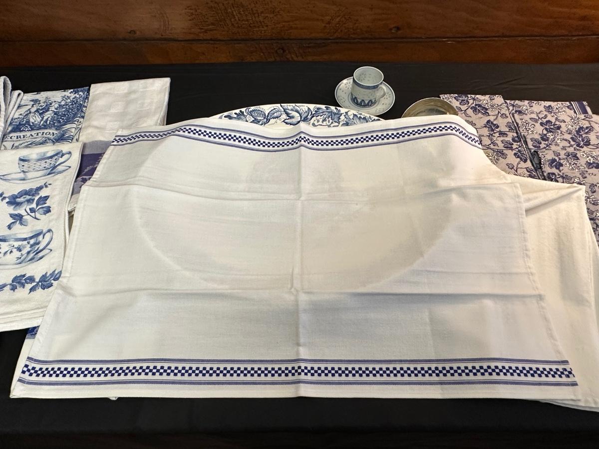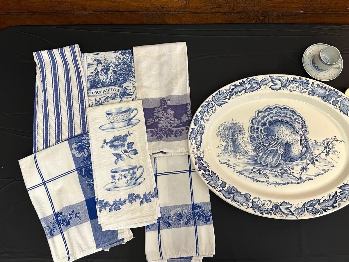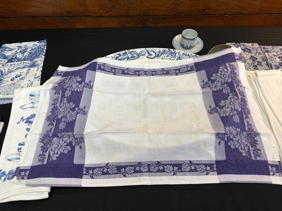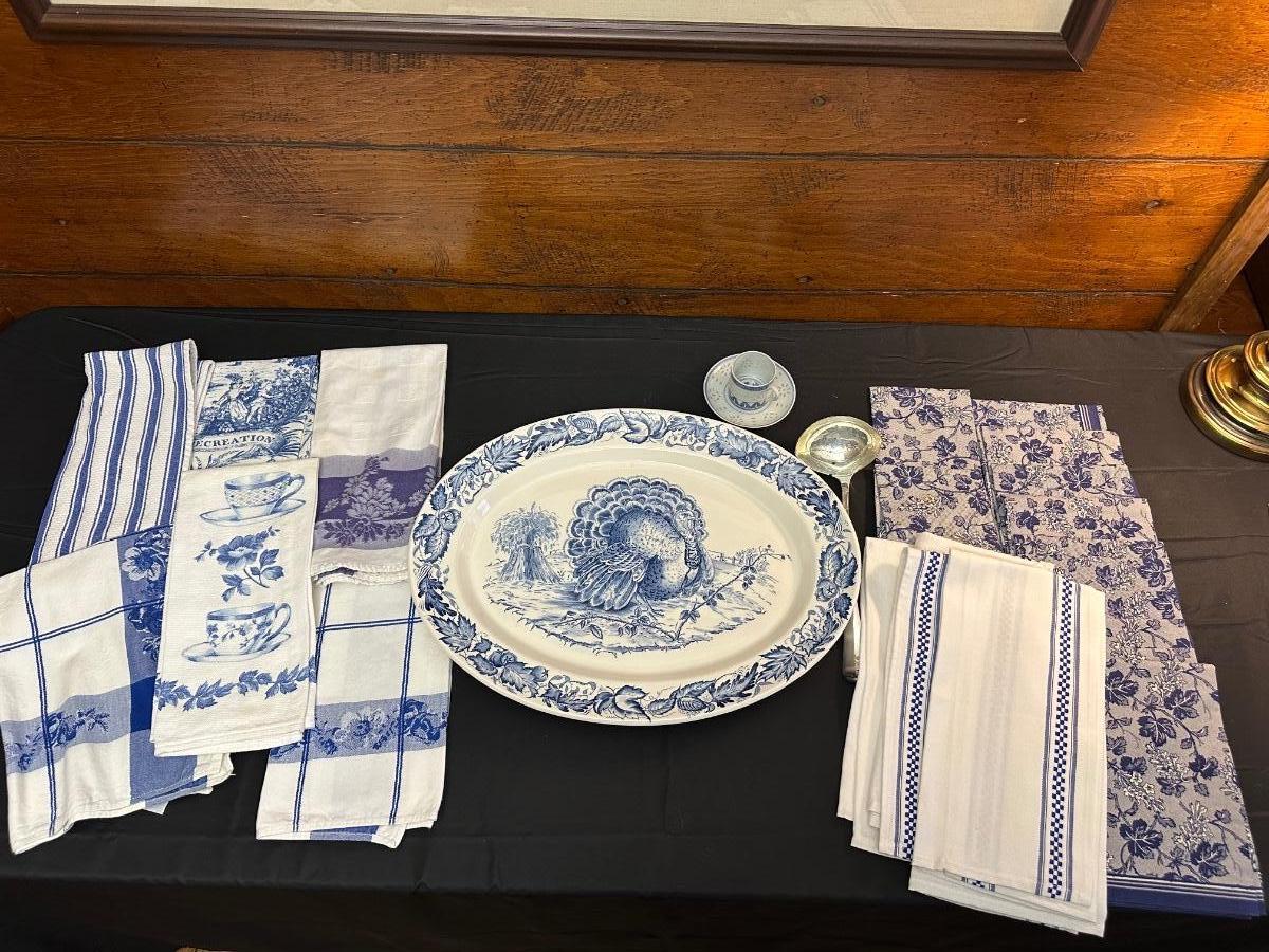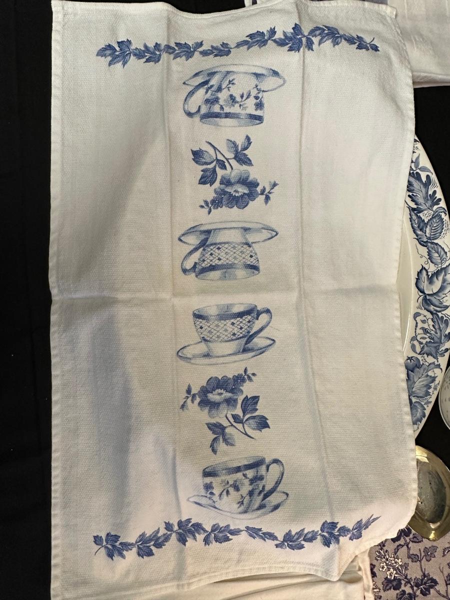 A collection of items with crisp blue classic patterns, including a silver plated ladle of Georgian Design by Hall Mark SG and a tea cup and small plate! Please note, there are a few blemishes on different towels, however overall in great shape. Some of the towels are made by William Sonoma and Martha Stewart.