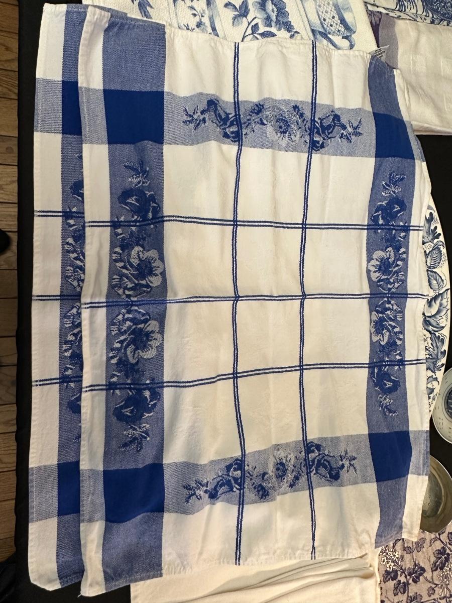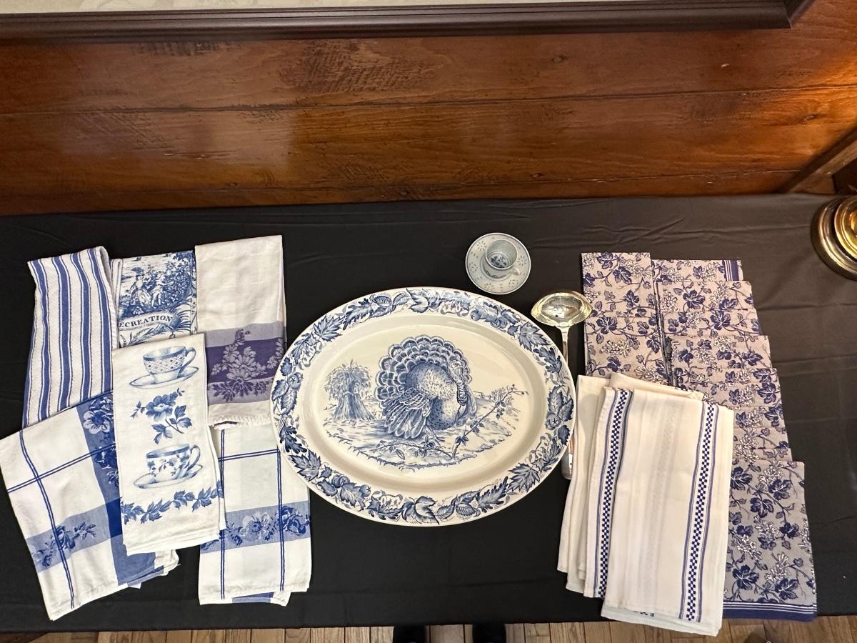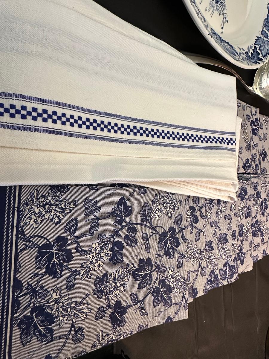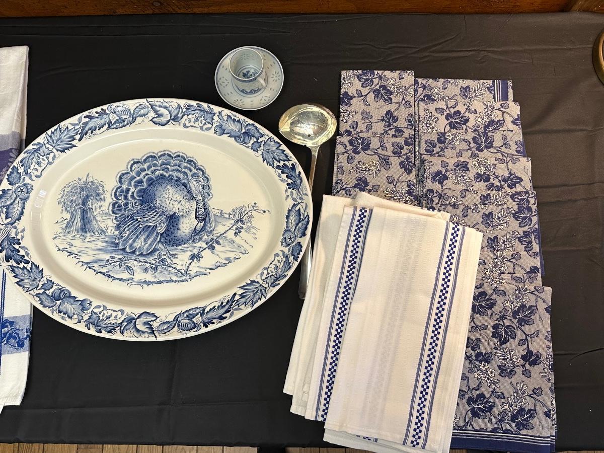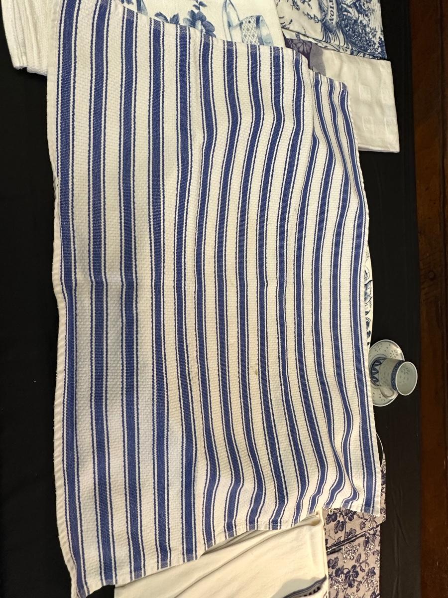 A collection of items with crisp blue classic patterns, including a silver plated ladle of Georgian Design by Hall Mark SG and a tea cup and small plate! Please note, there are a few blemishes on different towels, however overall in great shape. Some of the towels are made by William Sonoma and Martha Stewart.