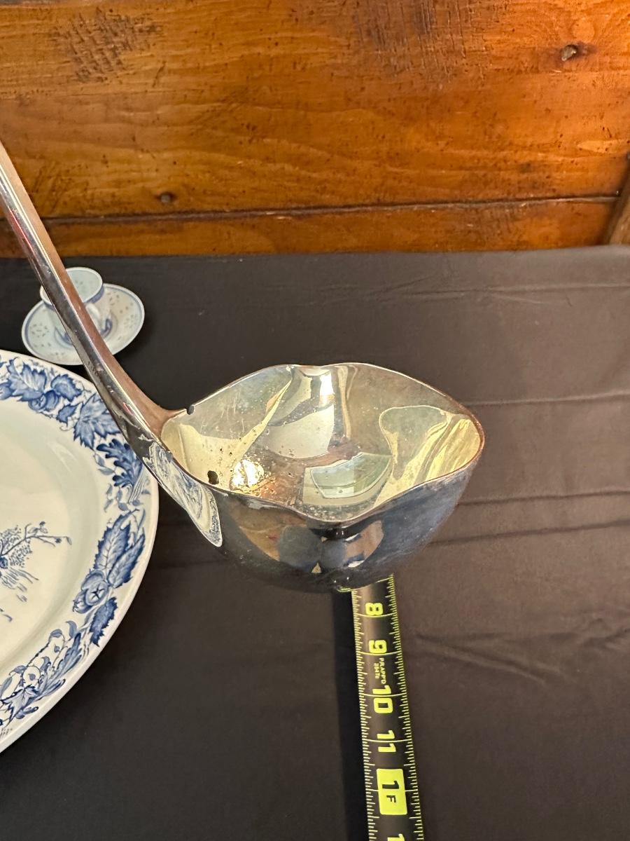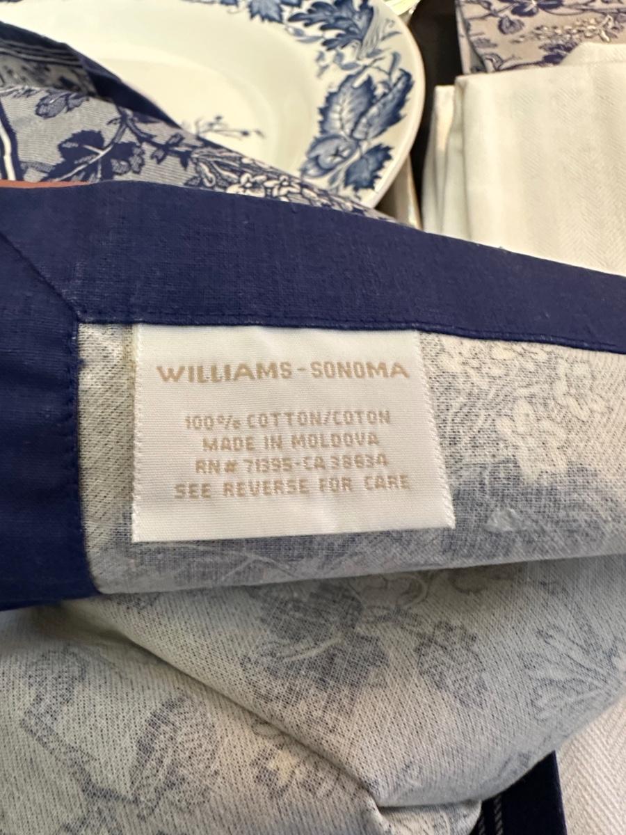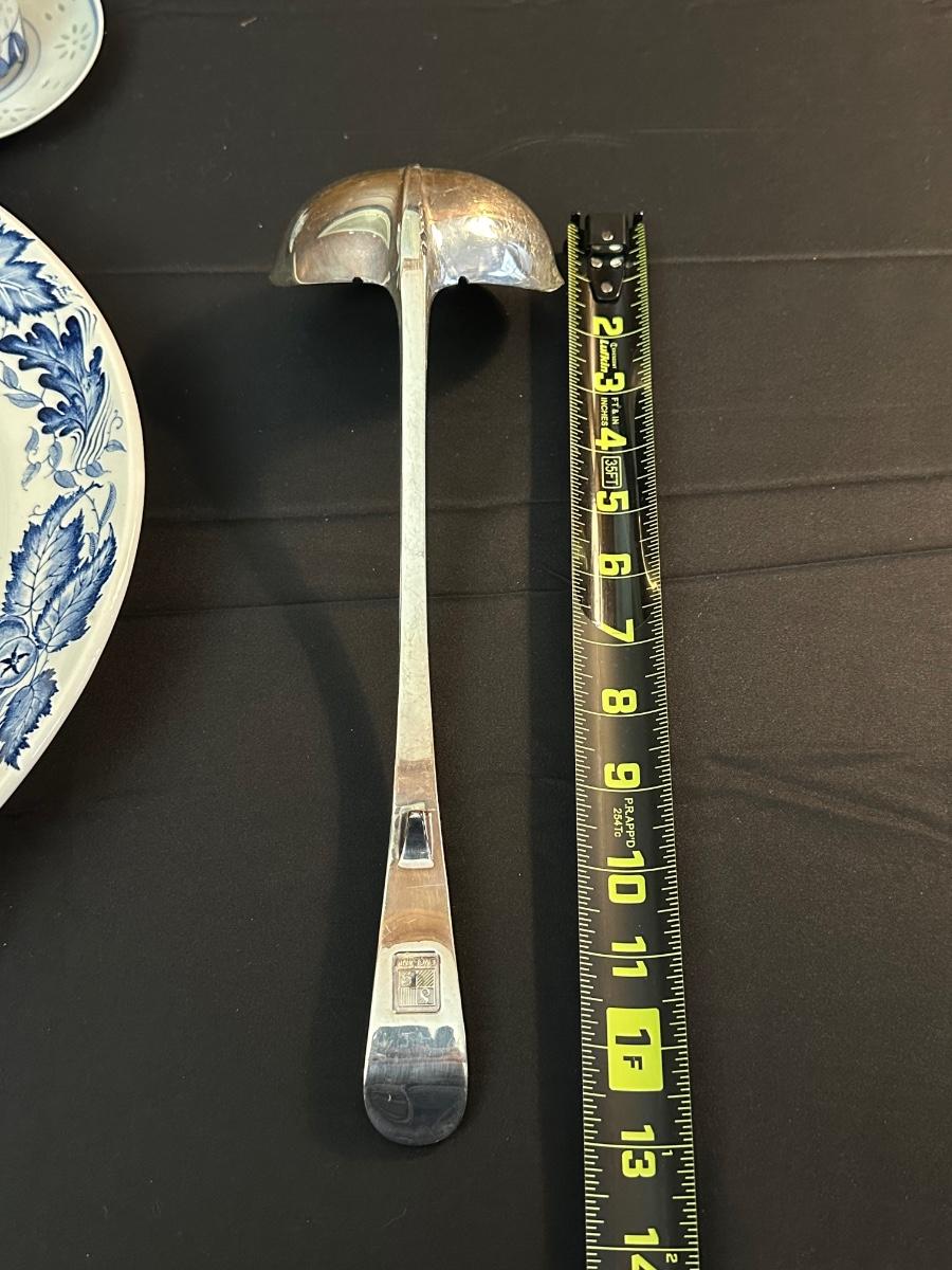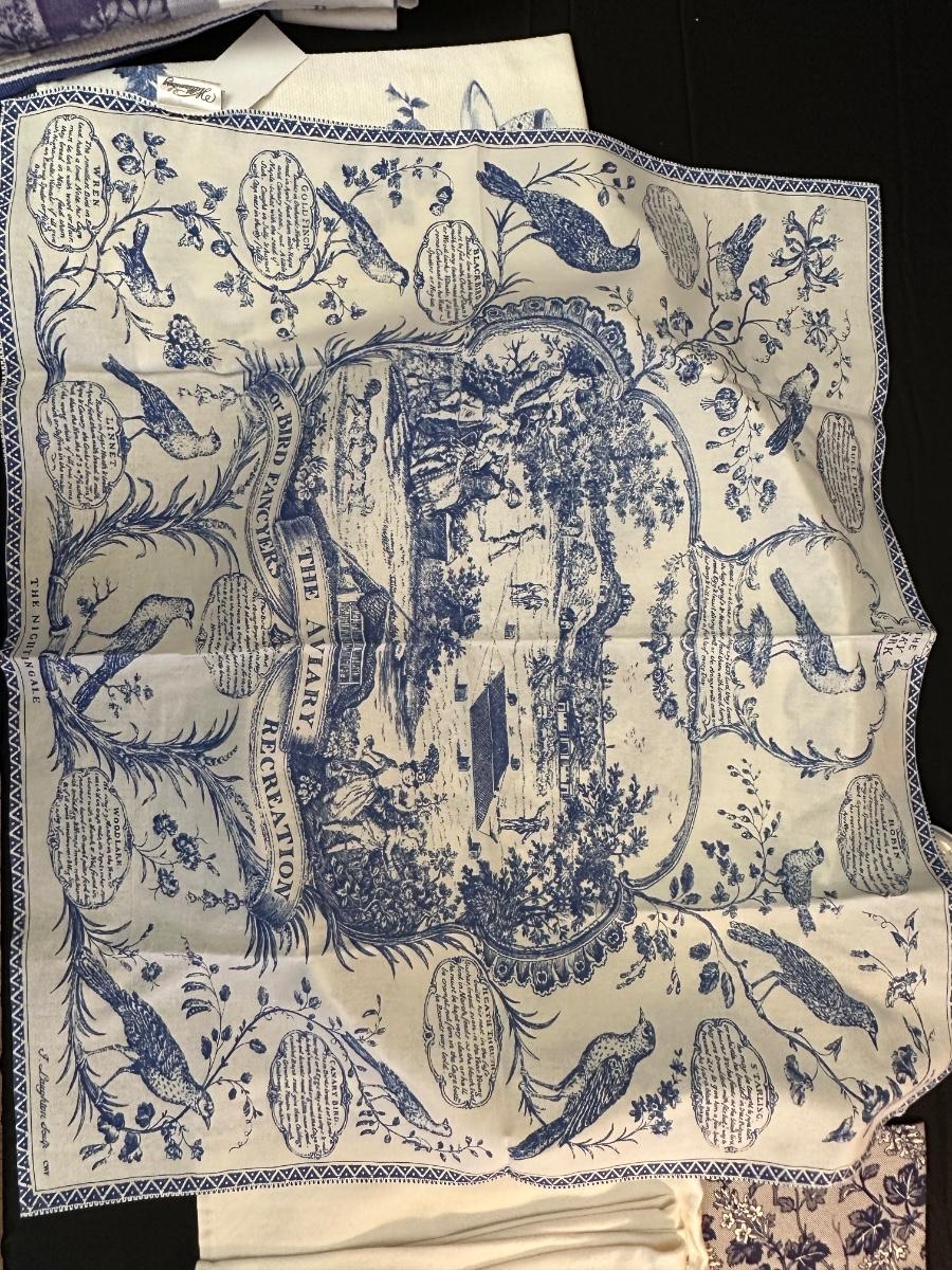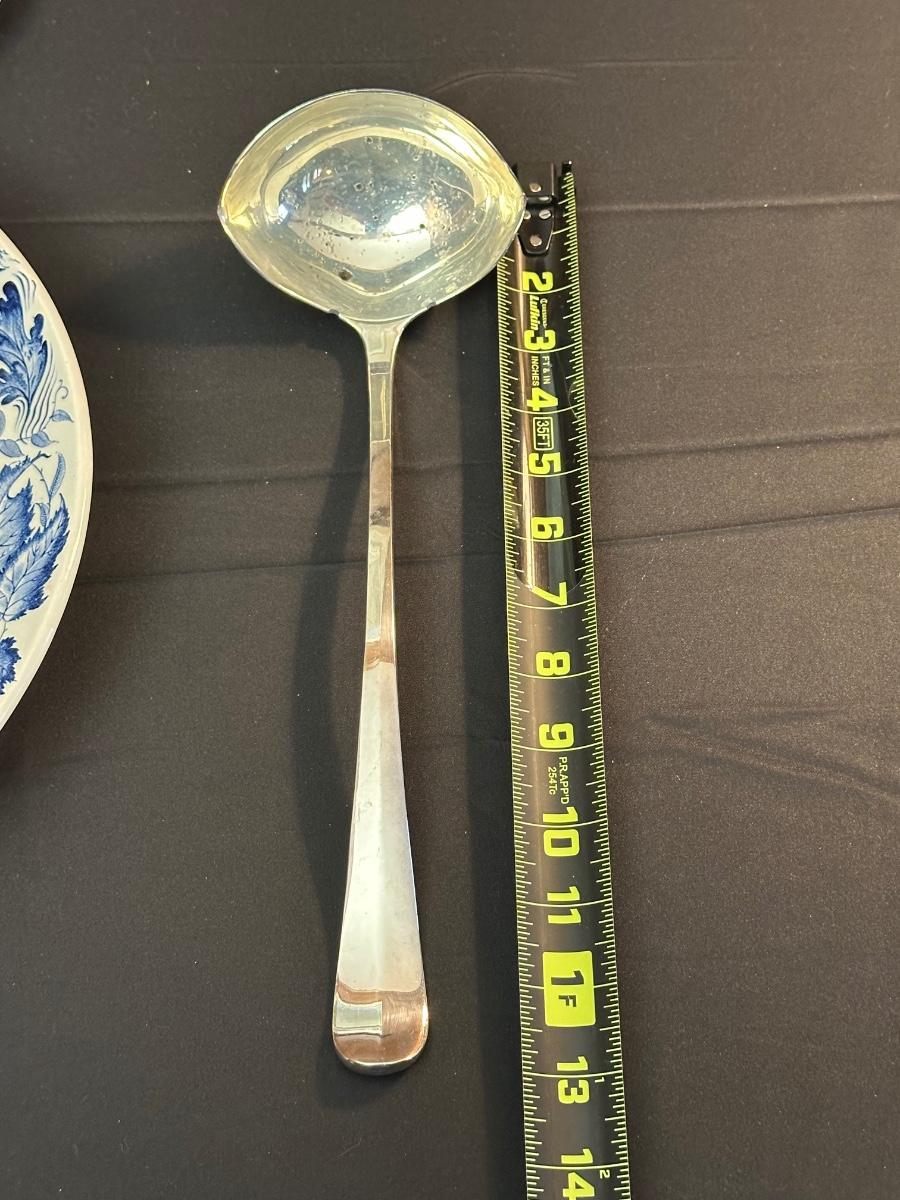 A collection of items with crisp blue classic patterns, including a silver plated ladle of Georgian Design by Hall Mark SG and a tea cup and small plate! Please note, there are a few blemishes on different towels, however overall in great shape. Some of the towels are made by William Sonoma and Martha Stewart.