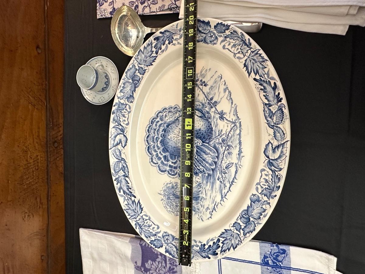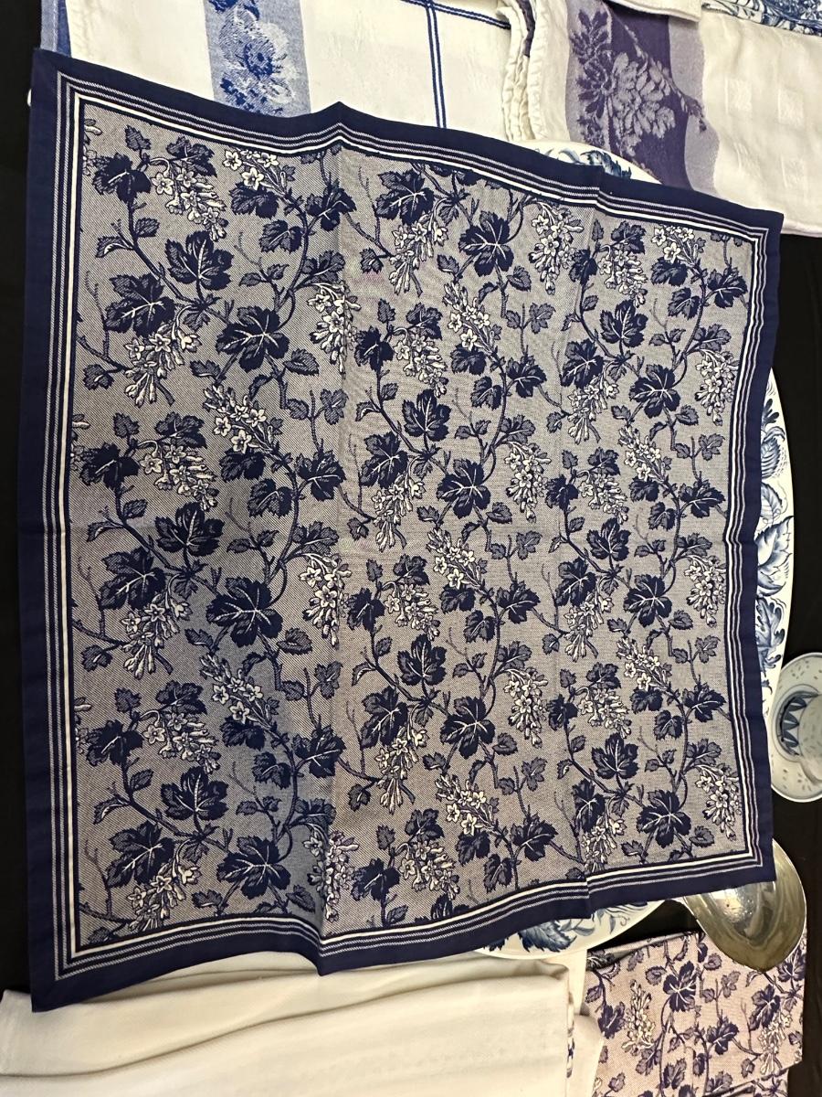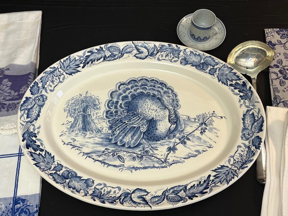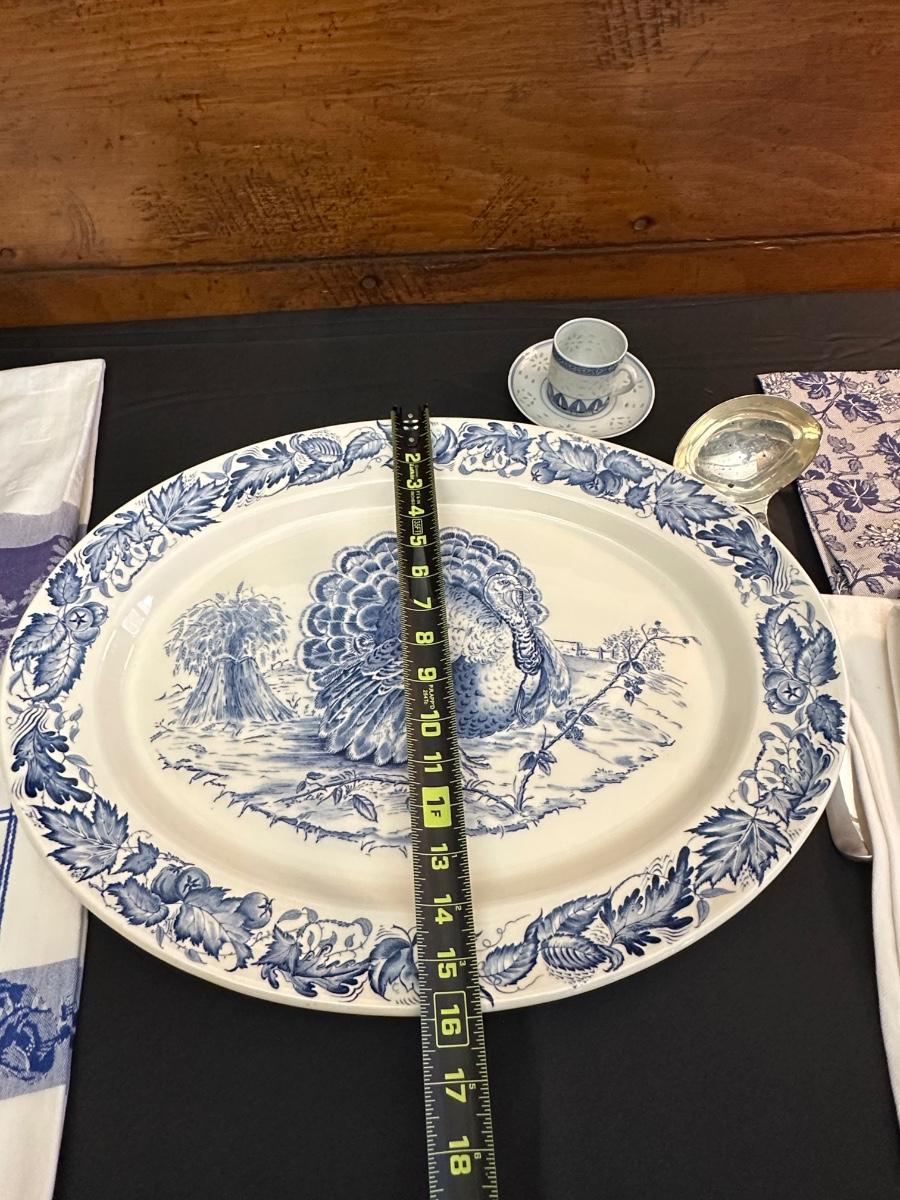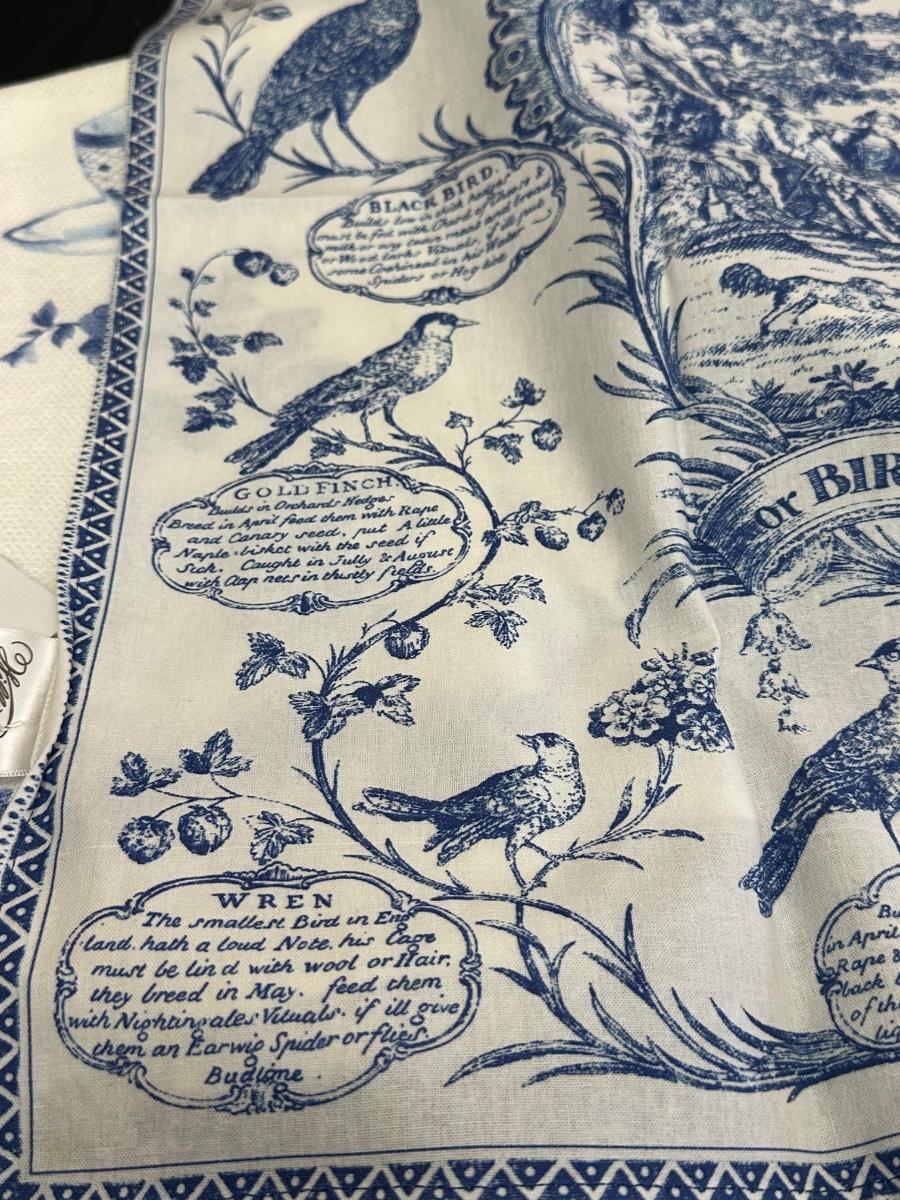 A collection of items with crisp blue classic patterns, including a silver plated ladle of Georgian Design by Hall Mark SG and a tea cup and small plate! Please note, there are a few blemishes on different towels, however overall in great shape. Some of the towels are made by William Sonoma and Martha Stewart.