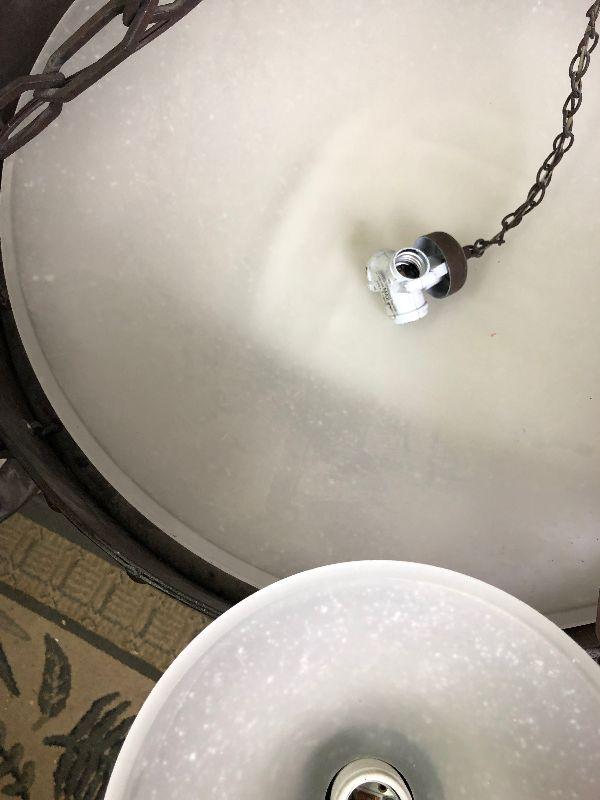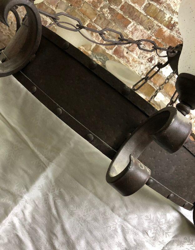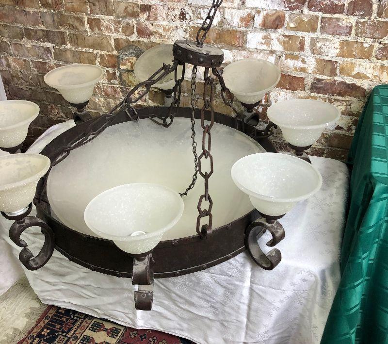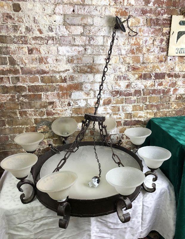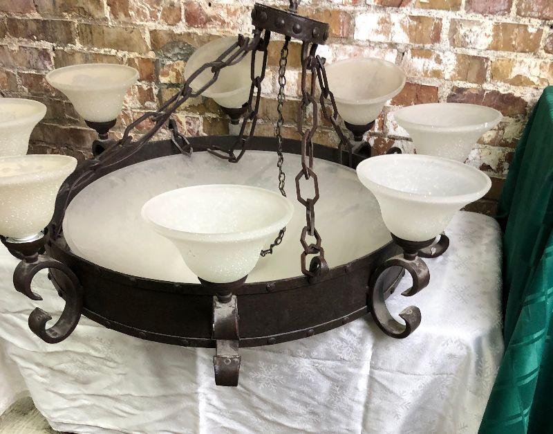 42" diameter on this iron chandelier...rustic style...8 lights up and 3 in the dome...excellent condition...