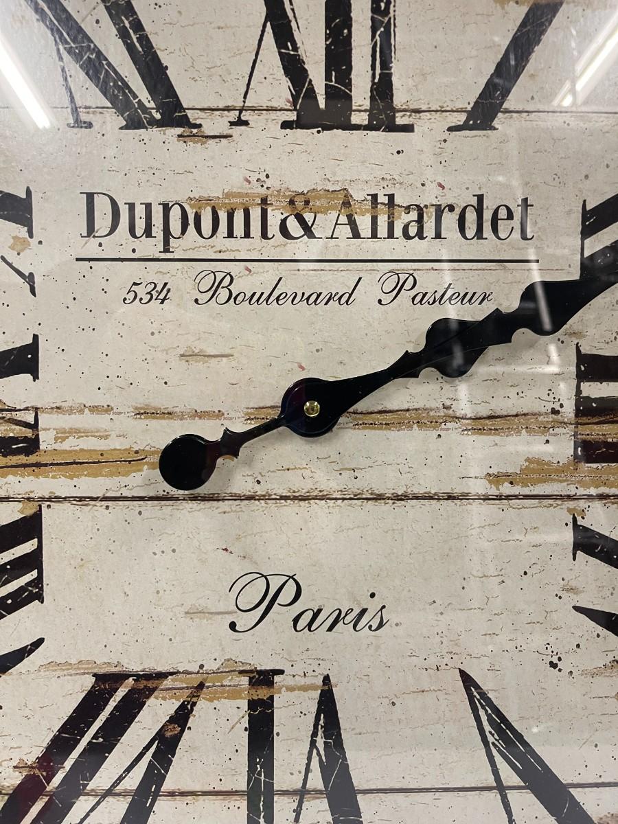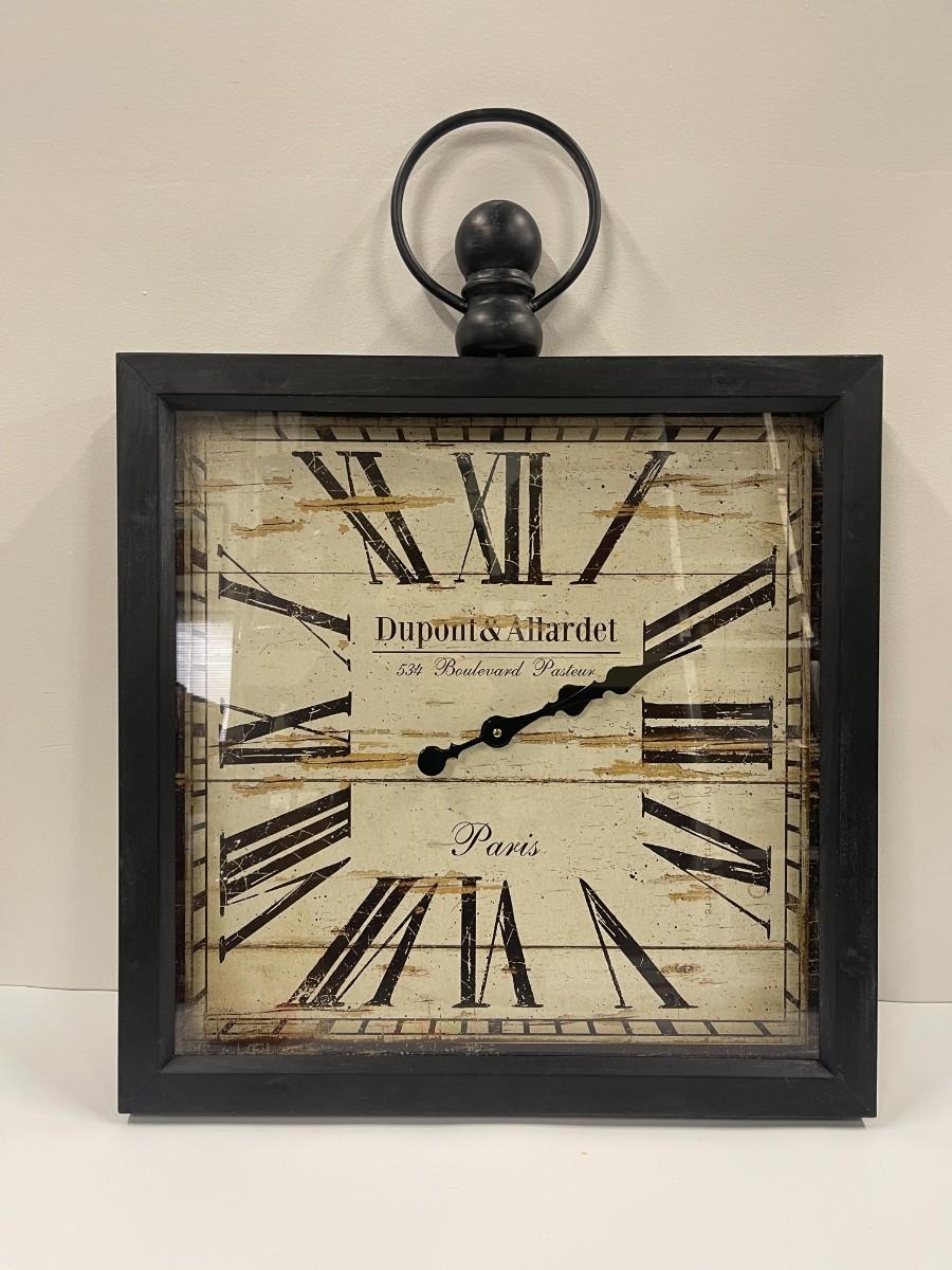 Large country French square metal wall clock. 23 1/2" x 31" high with finial. # 898