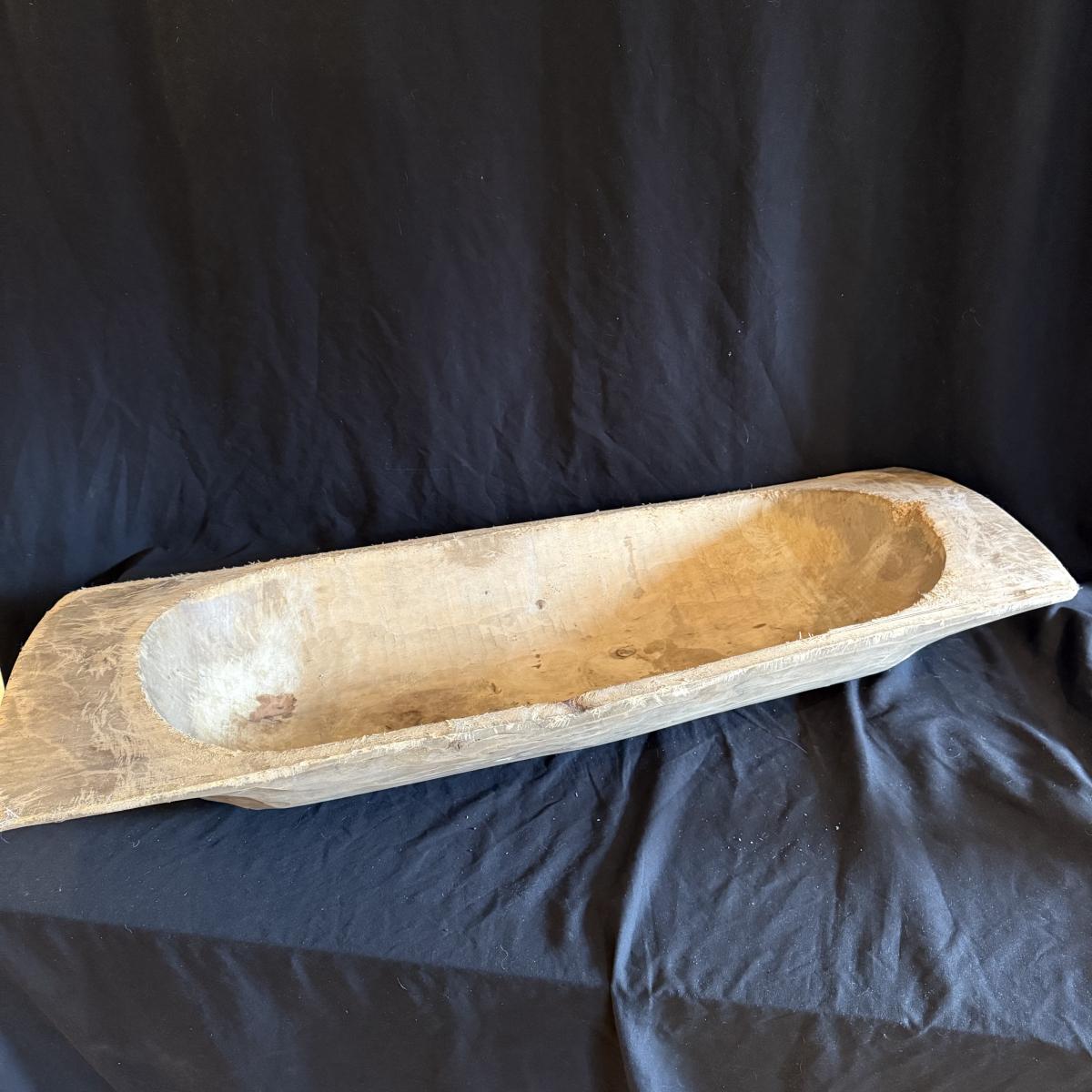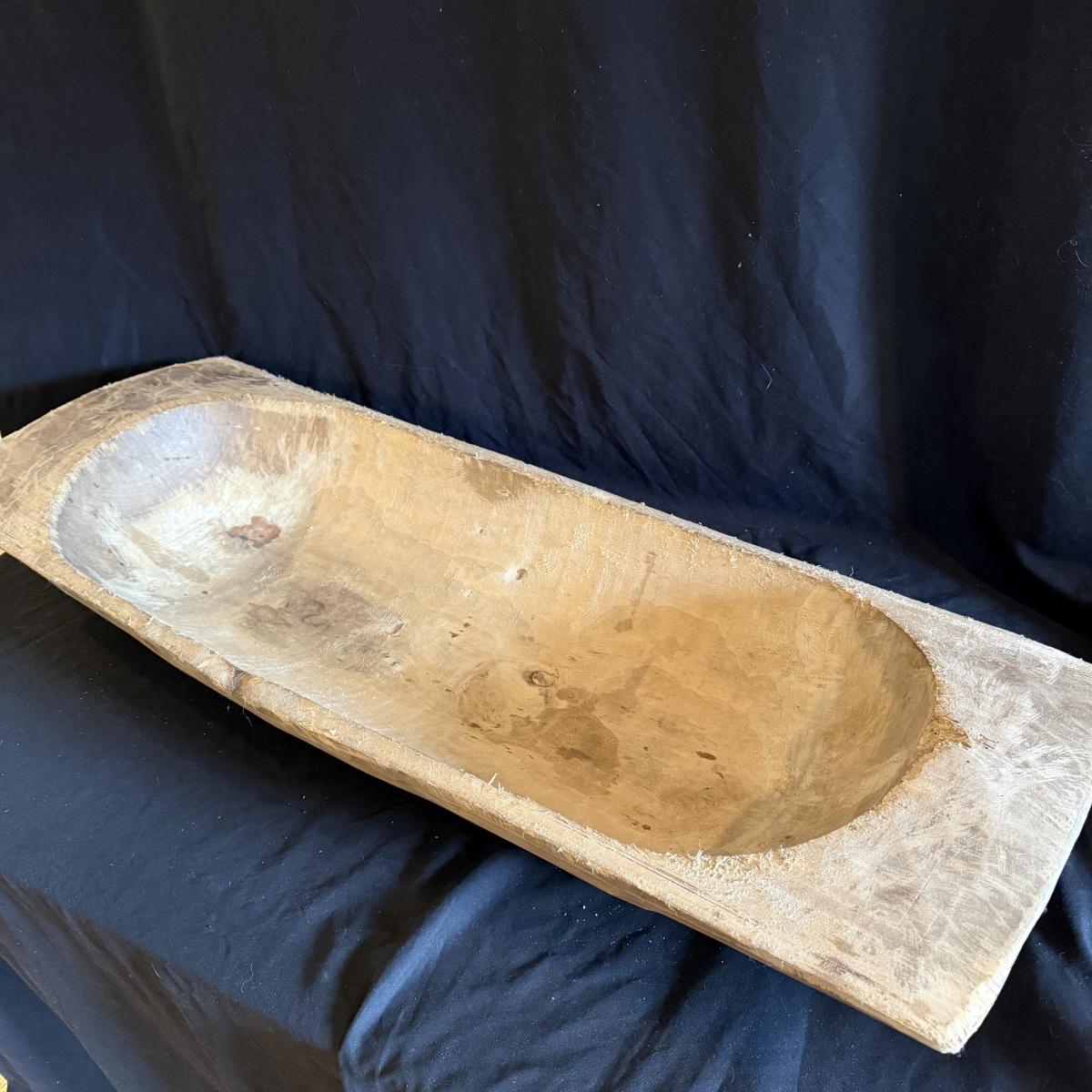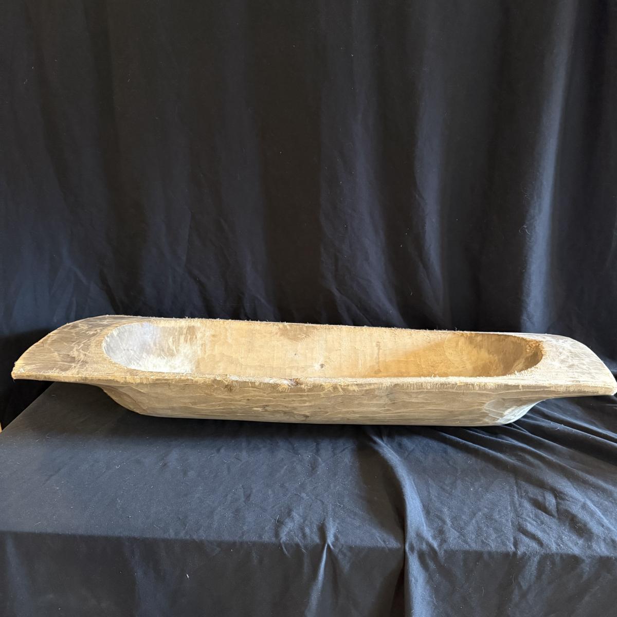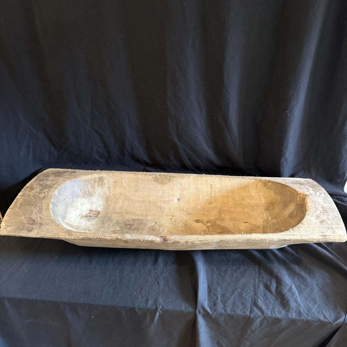 This lot contains a very large wooden dough bowl. This large decorative bowl appears to be hand carved from a single piece of wood. It measures 39” x 14” x 5.5”H. There are some scrapes and wear to the edges, see pictures for details. Shipping available. Shipping can be costly. We suggest contacting our preferred local shipping provider, Postage Express, with dimensions and getting an estimate before bidding: 828-255-9250 or shipping@postageexpressnc.com