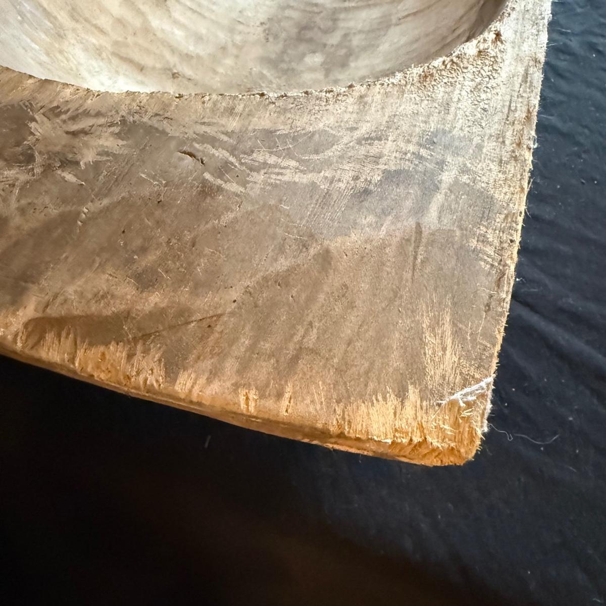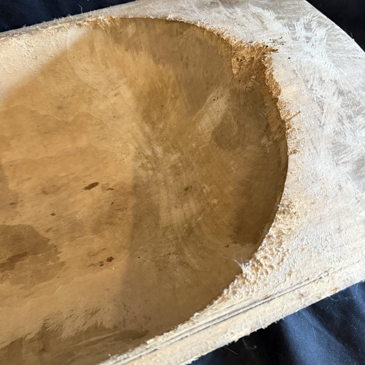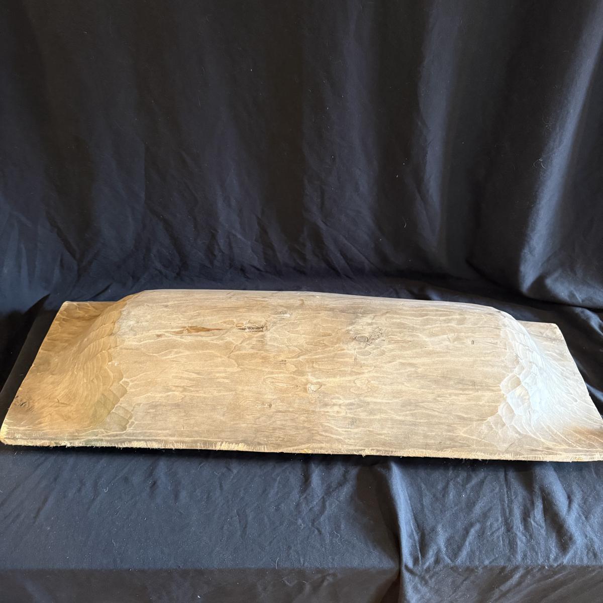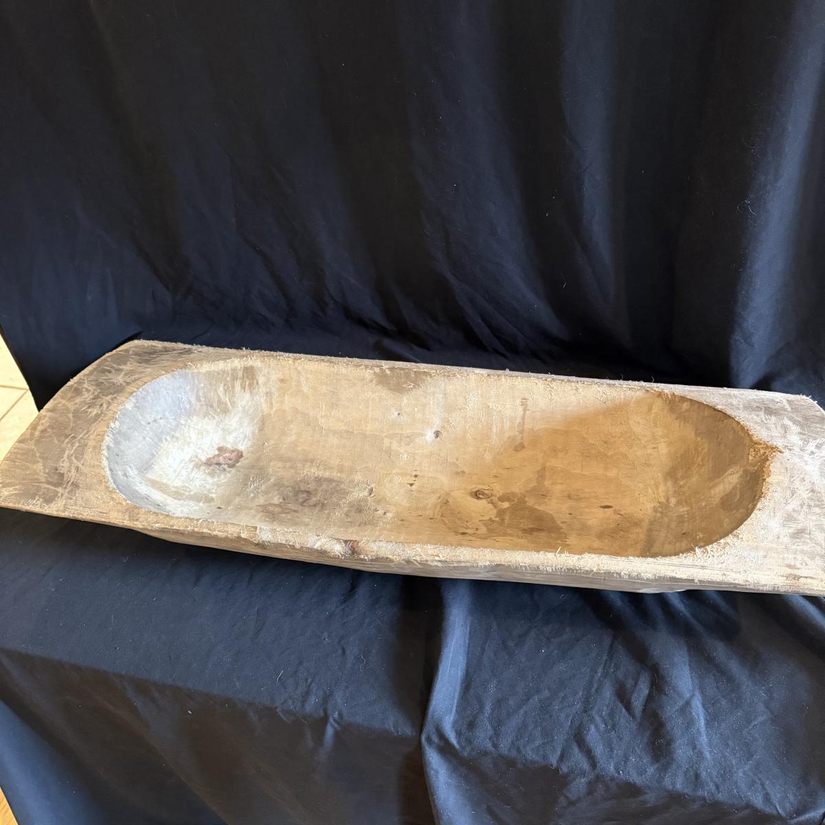 This lot contains a very large wooden dough bowl. This large decorative bowl appears to be hand carved from a single piece of wood. It measures 39” x 14” x 5.5”H. There are some scrapes and wear to the edges, see pictures for details. Shipping available. Shipping can be costly. We suggest contacting our preferred local shipping provider, Postage Express, with dimensions and getting an estimate before bidding: 828-255-9250 or shipping@postageexpressnc.com