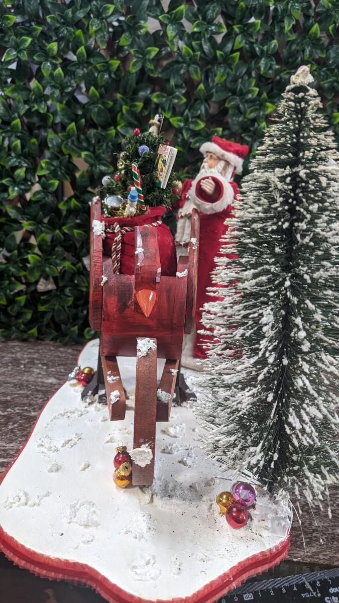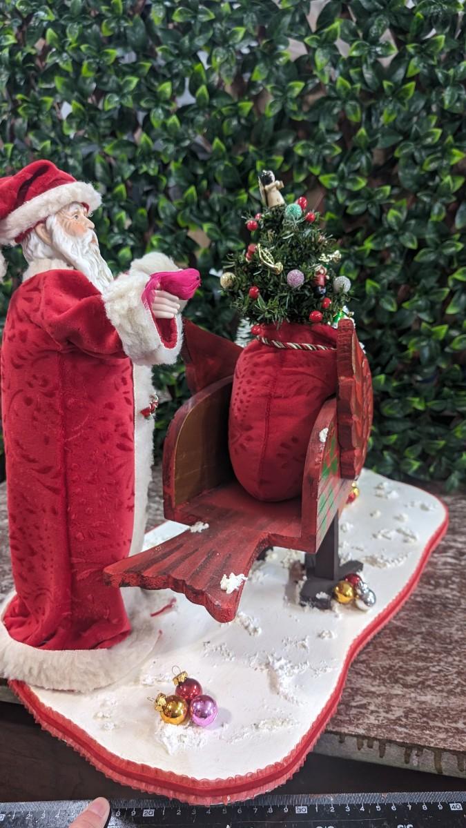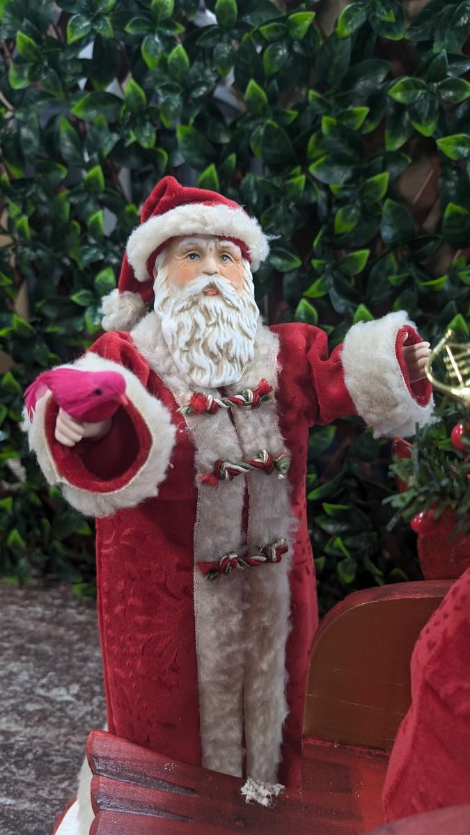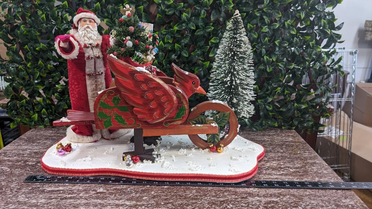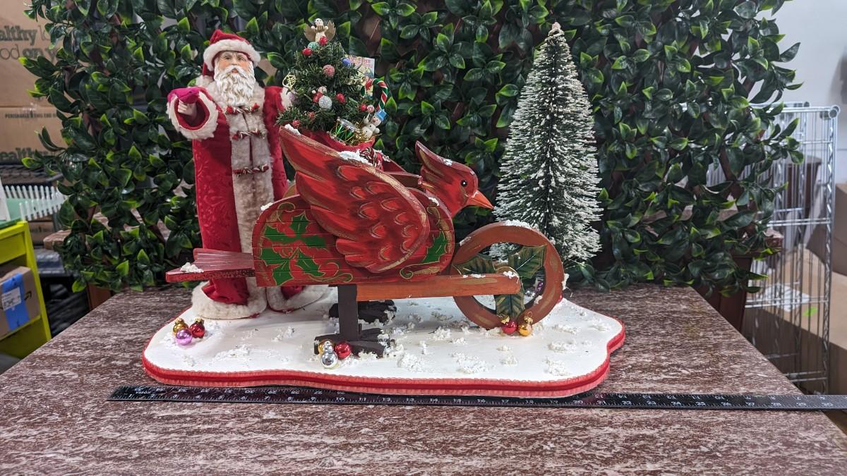 This is a Large Santa Christmas Display Handmade 2003 with Wooden Cardinal Wagon Carrying Toy Bag