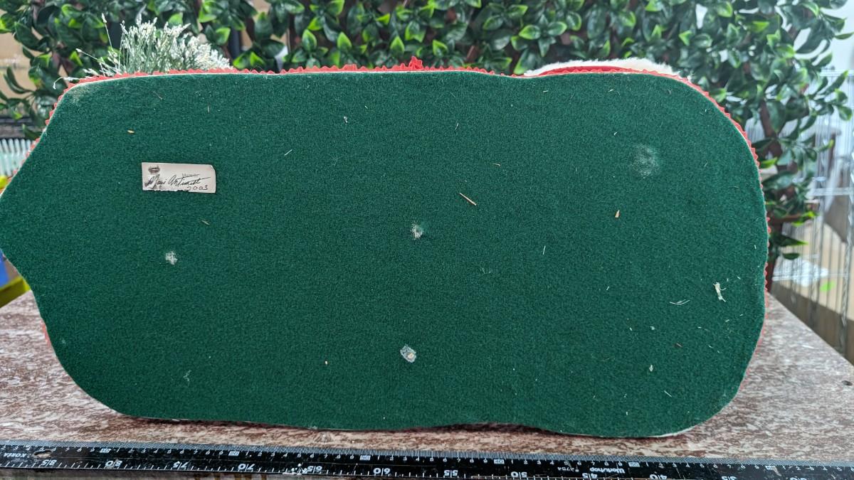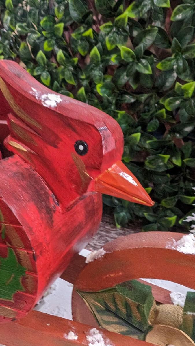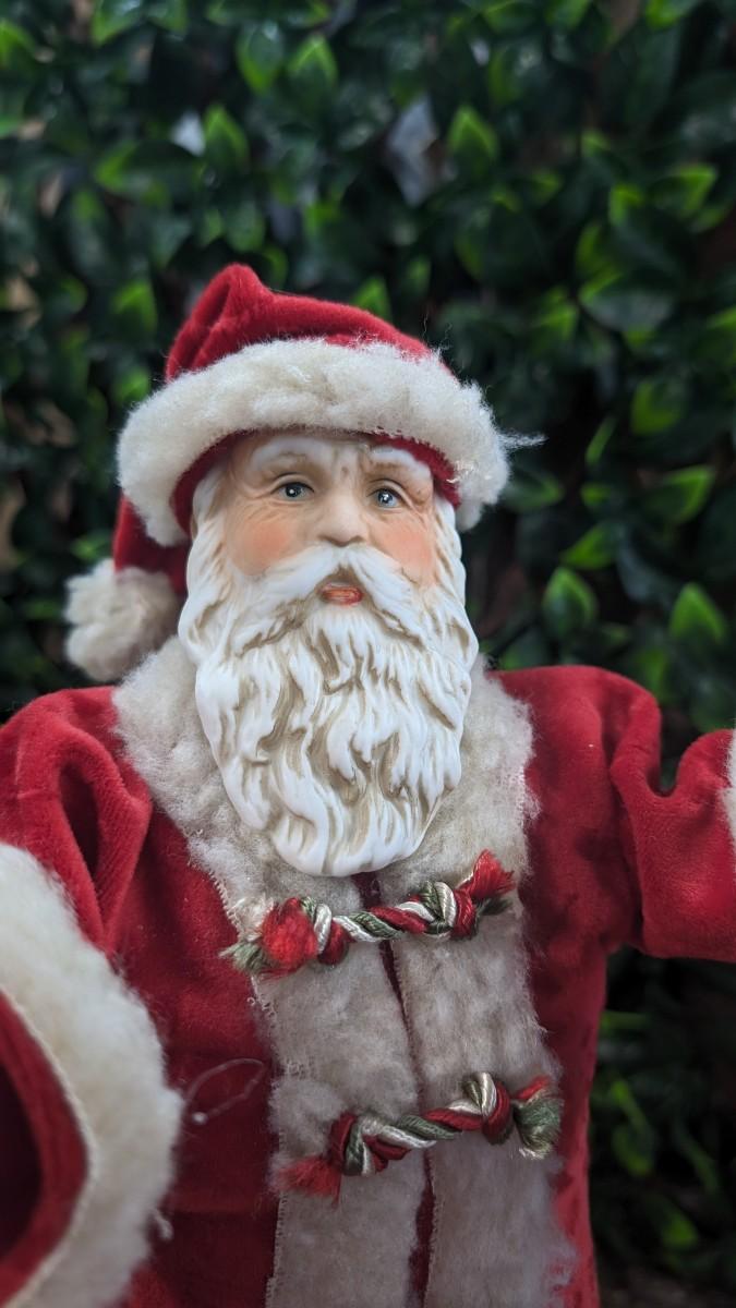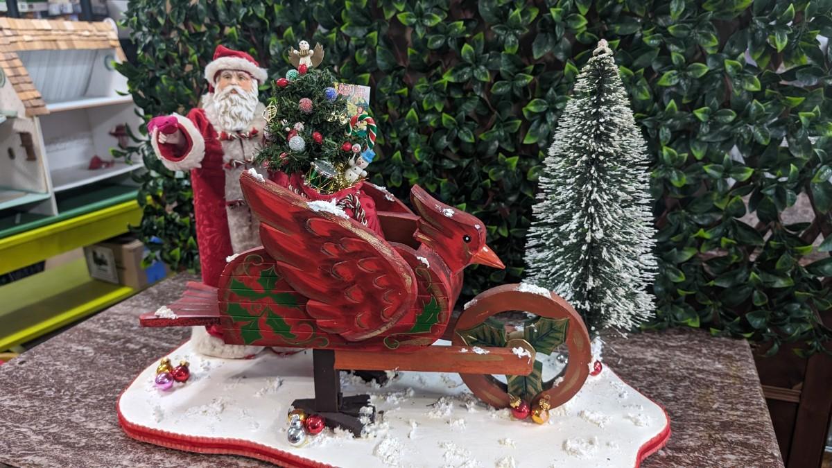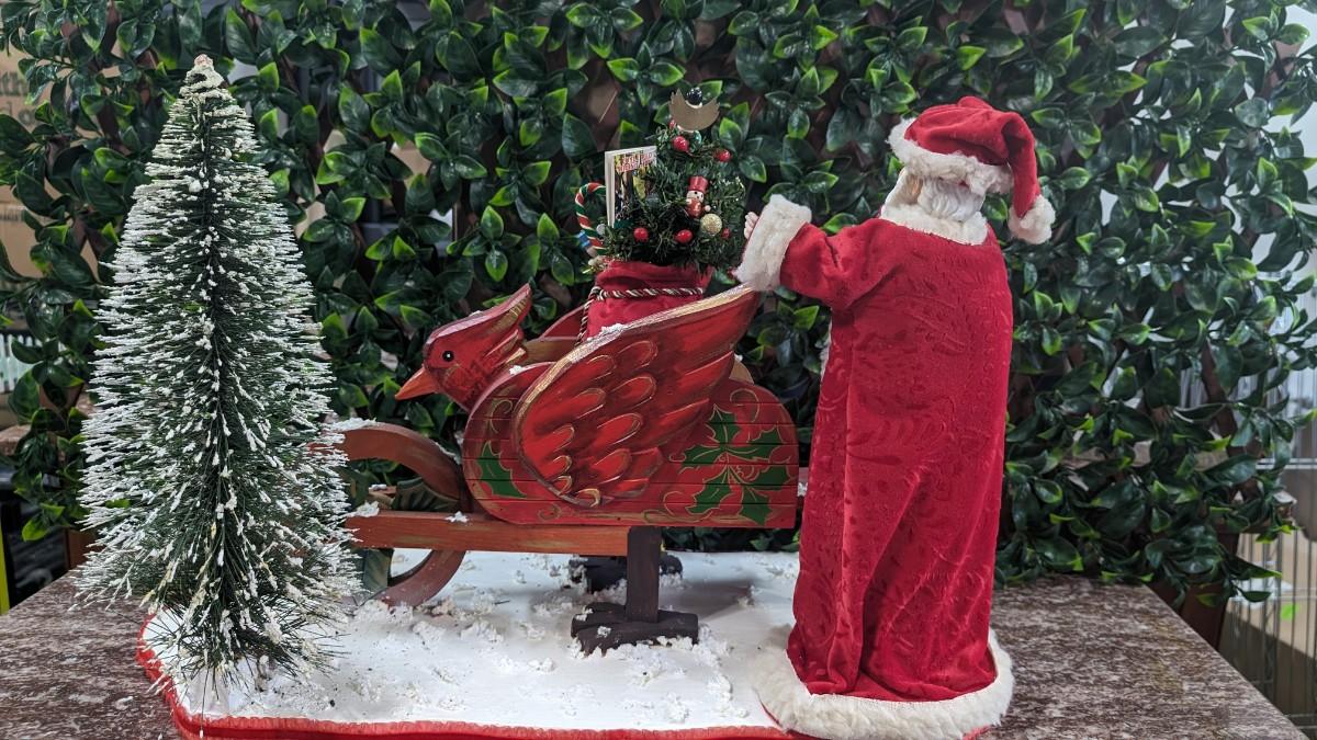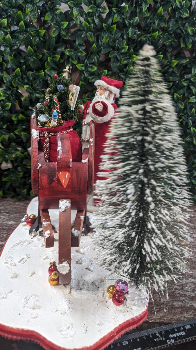 This is a Large Santa Christmas Display Handmade 2003 with Wooden Cardinal Wagon Carrying Toy Bag