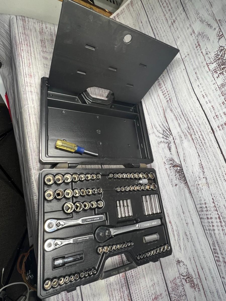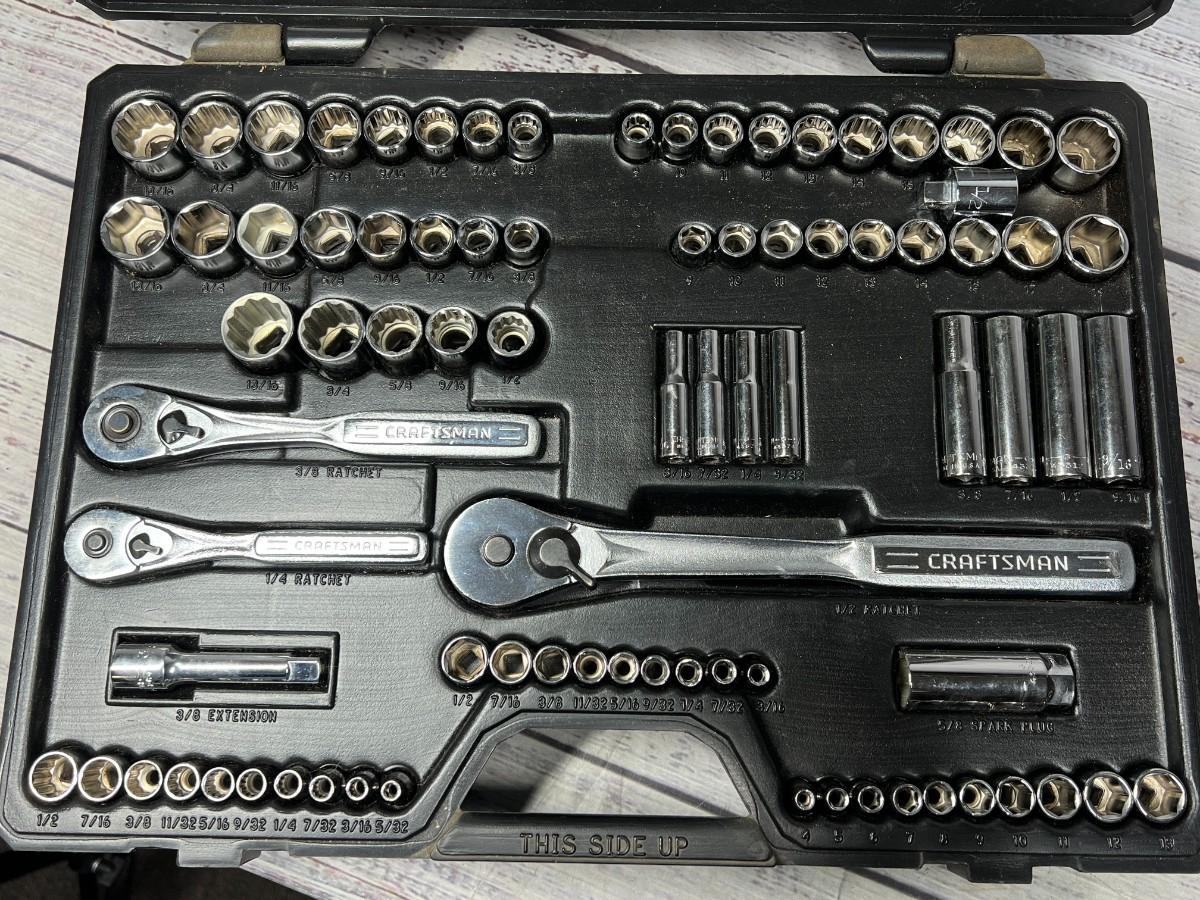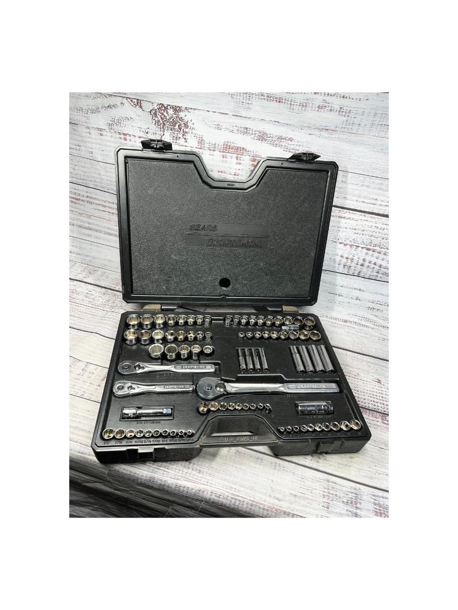 Large Sears Craftsman Ratchet Set, there is no significant damage to the ratchet set and is in good useable condition. Check pictures for more details and for sizing.