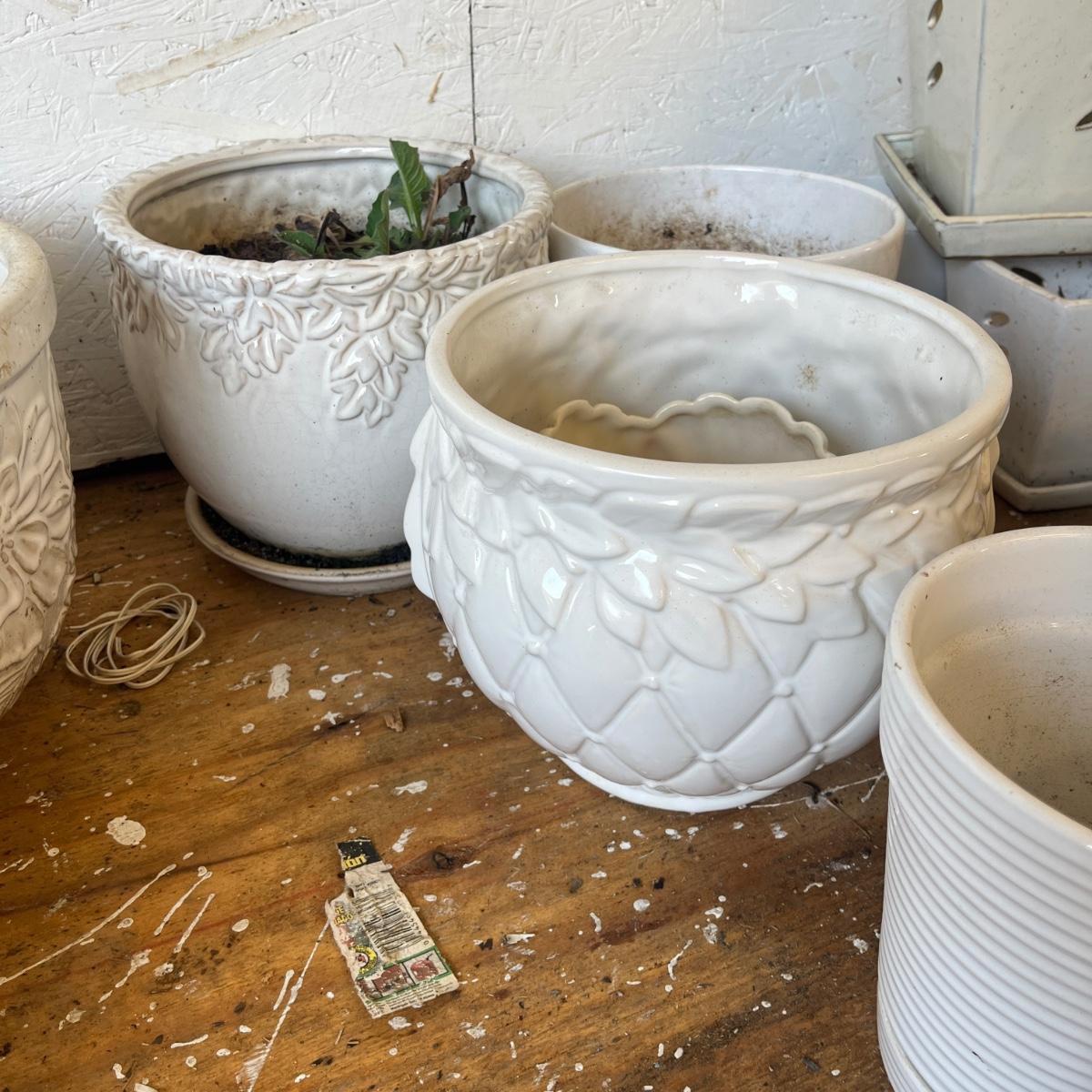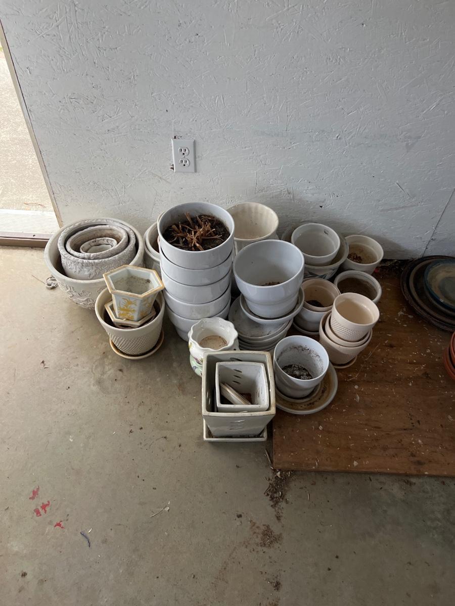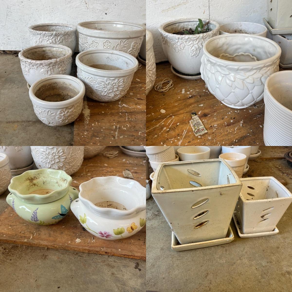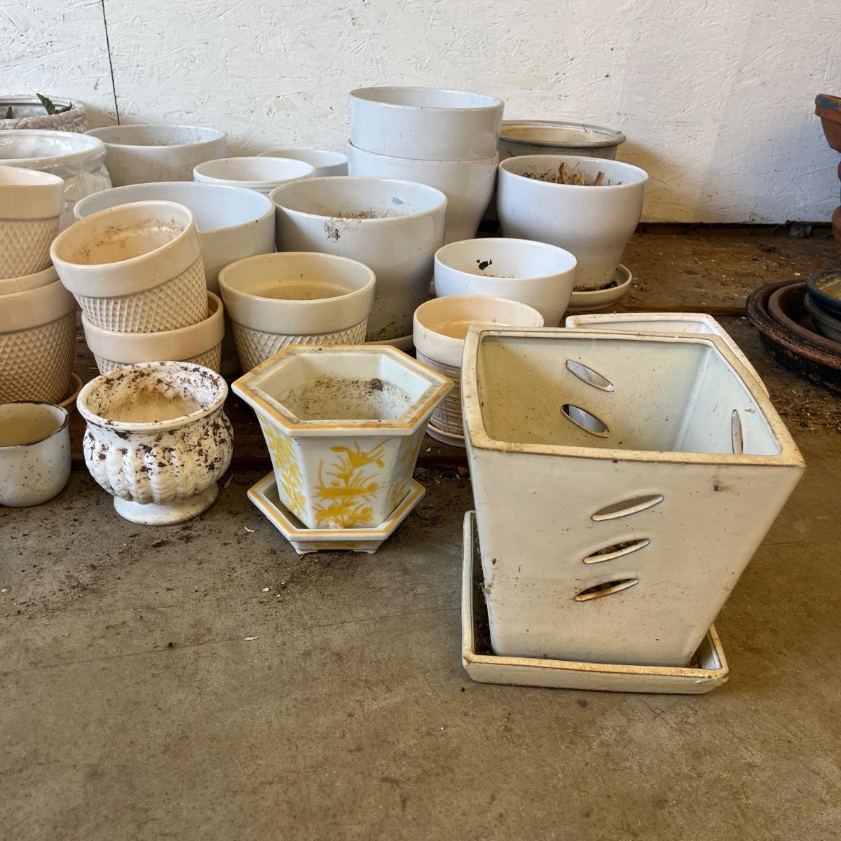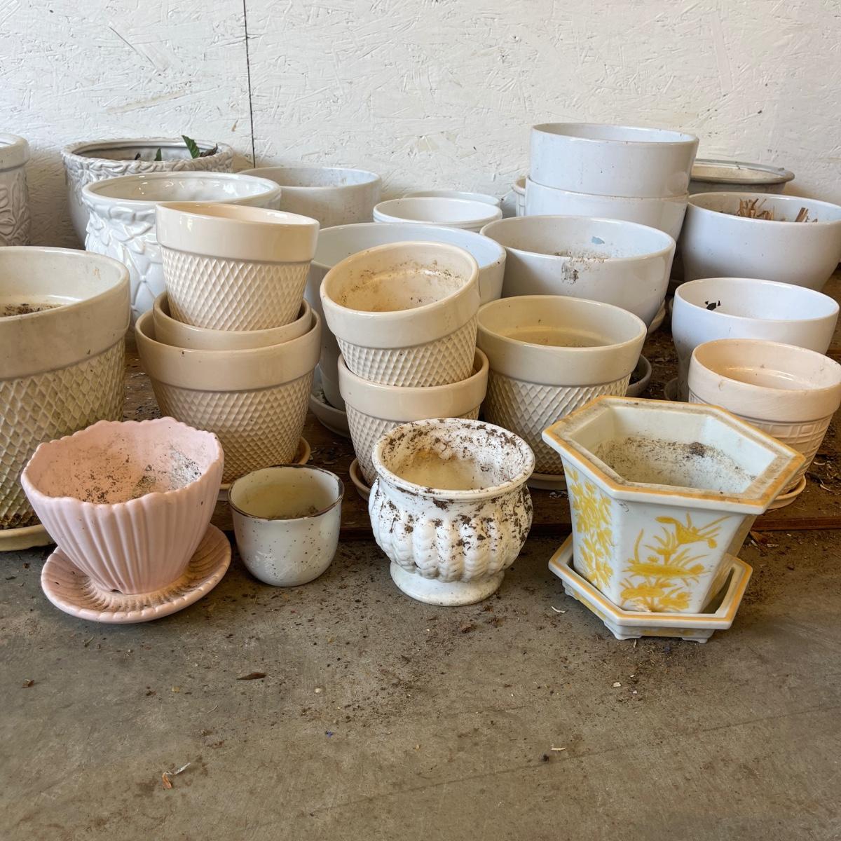 Lot includes over 30 ceramic plant pots in a variety of styles and sizes. Largest pot measures 12”D x 9”H. One pot has chunk missing, see pictures.