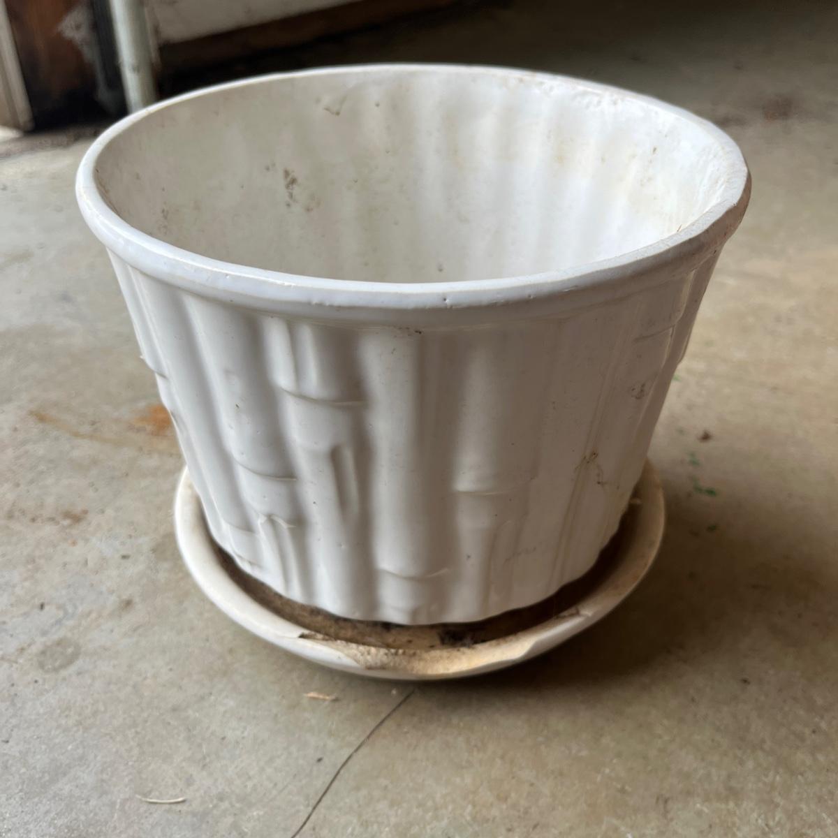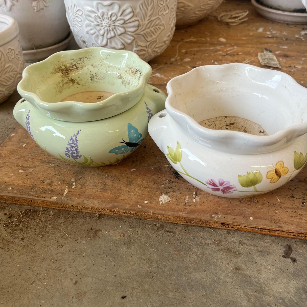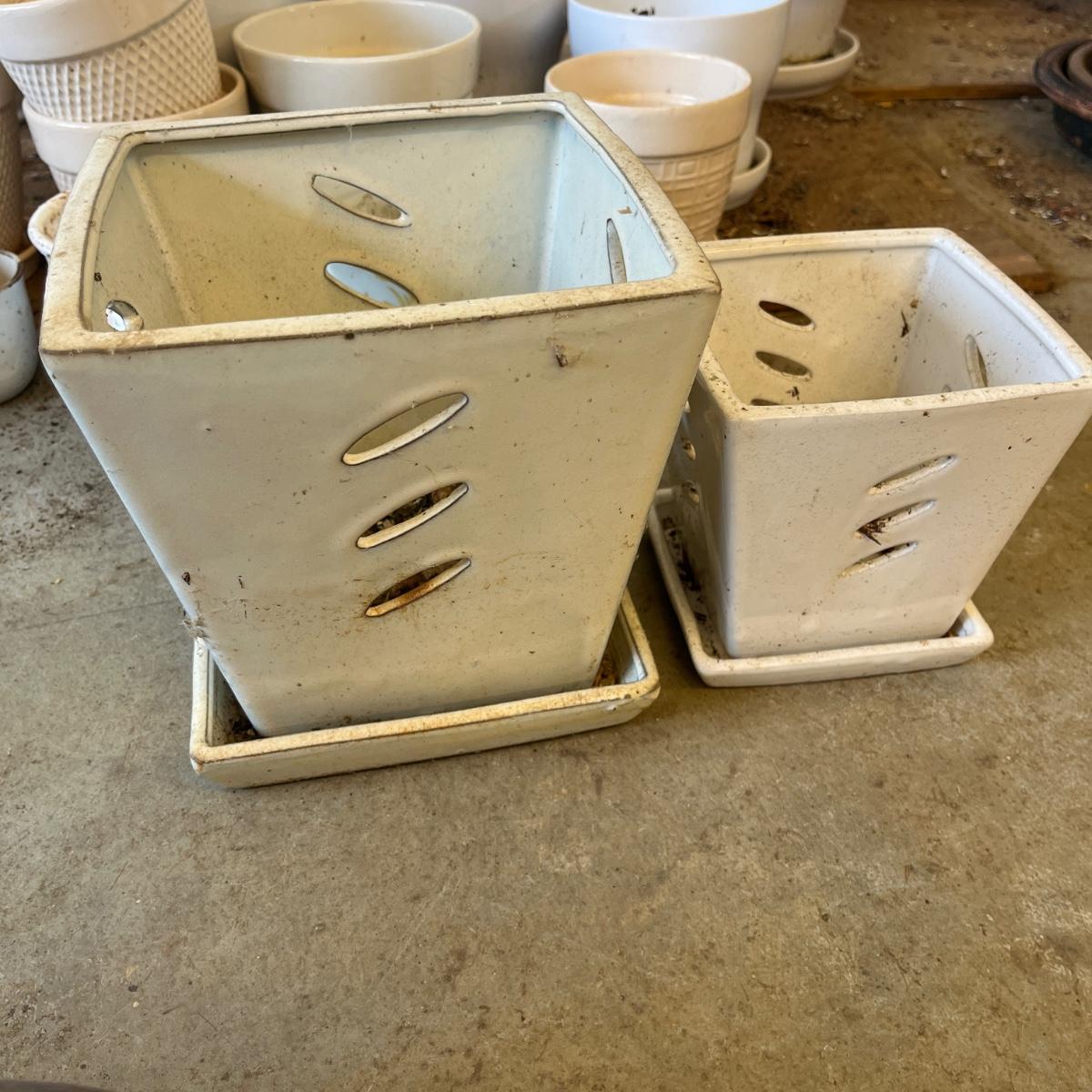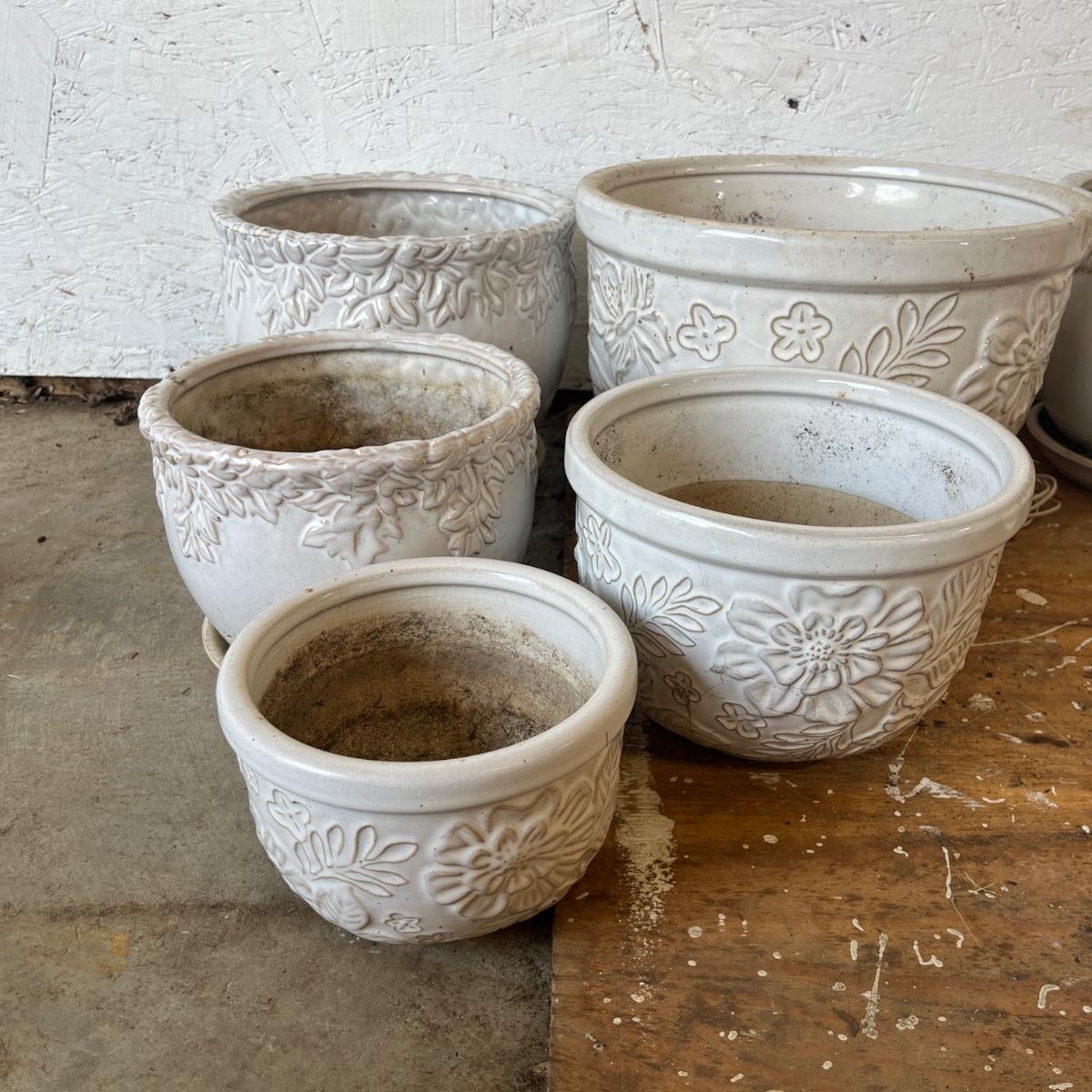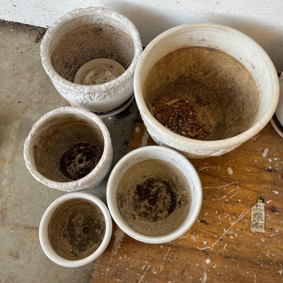 Lot includes over 30 ceramic plant pots in a variety of styles and sizes. Largest pot measures 12”D x 9”H. One pot has chunk missing, see pictures.