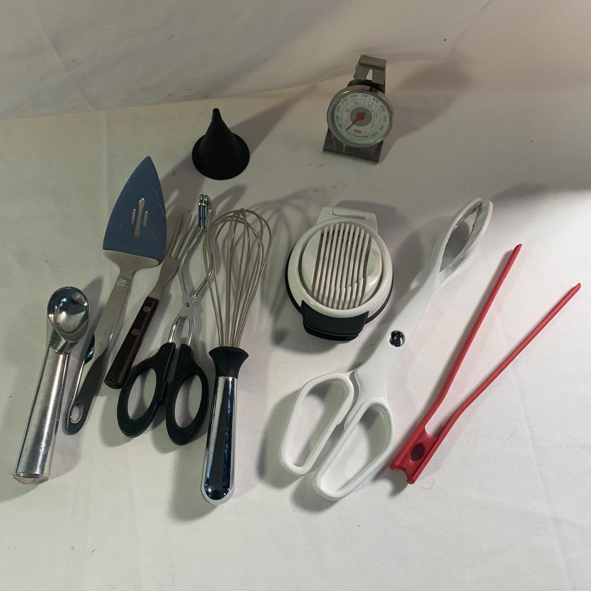 Large lot of kitchen essentials includes two 16”D pizza pans, loaf pans, cake pans, five mixing bowls in various sizes, multiple sets of cooking utensils, dish and drying towels, unopened kitchen scissors, apple slicer, spatulas, and more! Please see photos for more details.