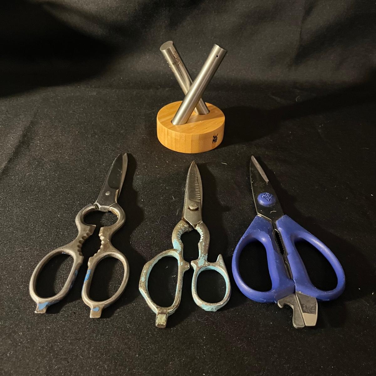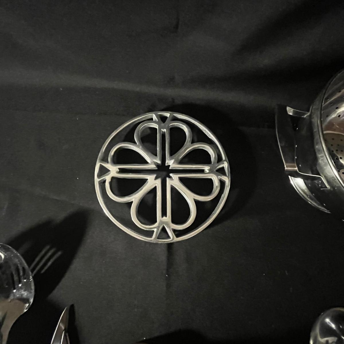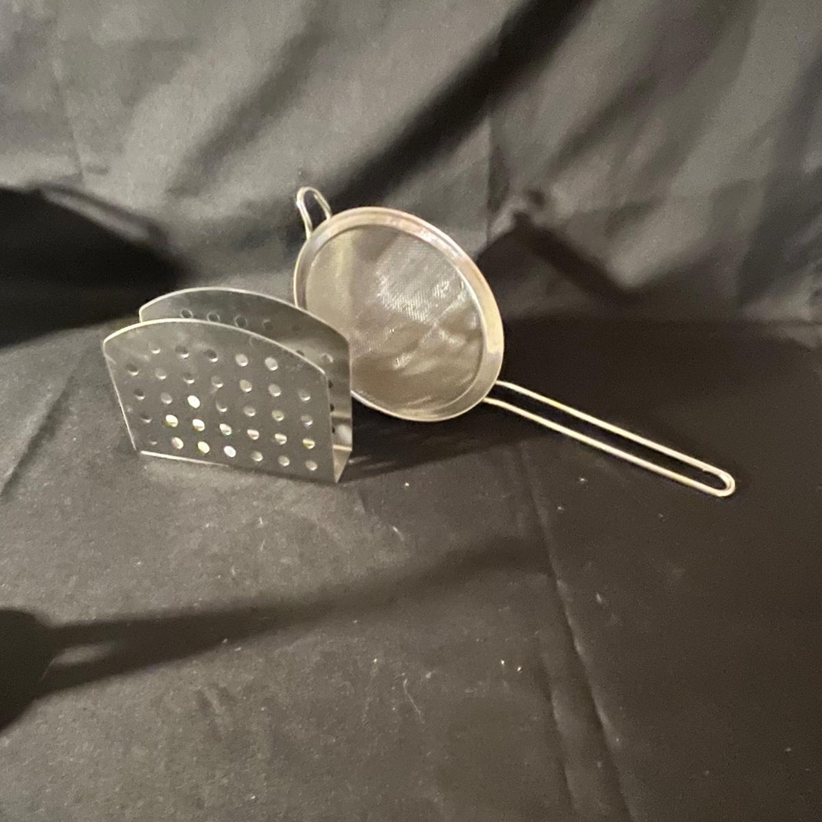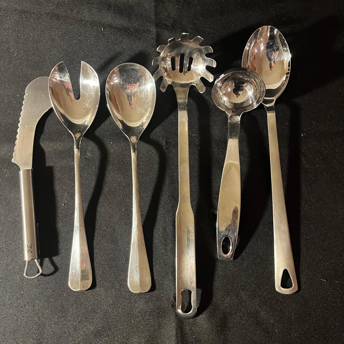 Lot includes two colanders, trivet, napkin holder, serving spoons, ice cream scoop, measuring spoons, scissors, pizza cutter, whiskers, salt and pepper shakers and more. Largest colander measures 9”D x 5”H not counting handles.