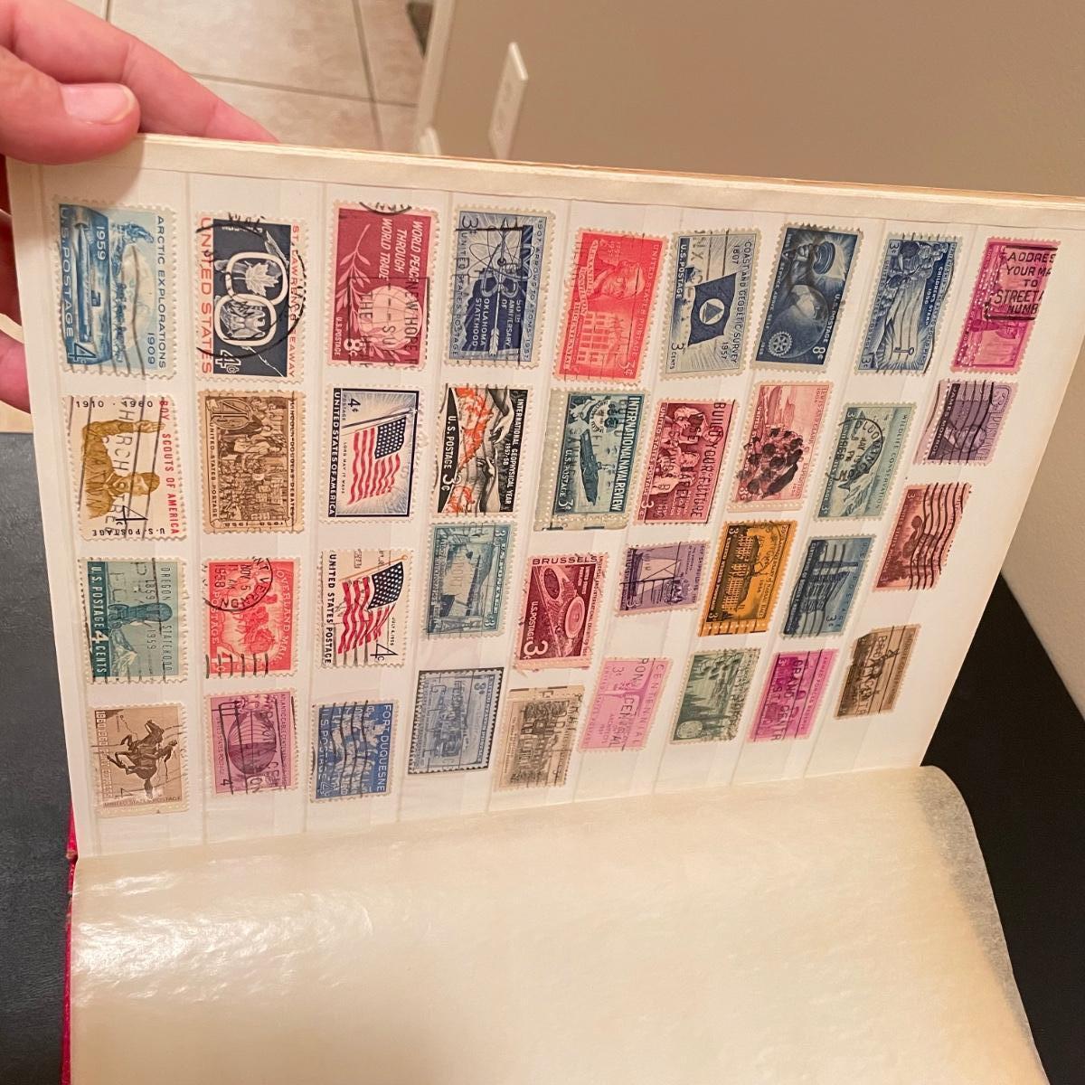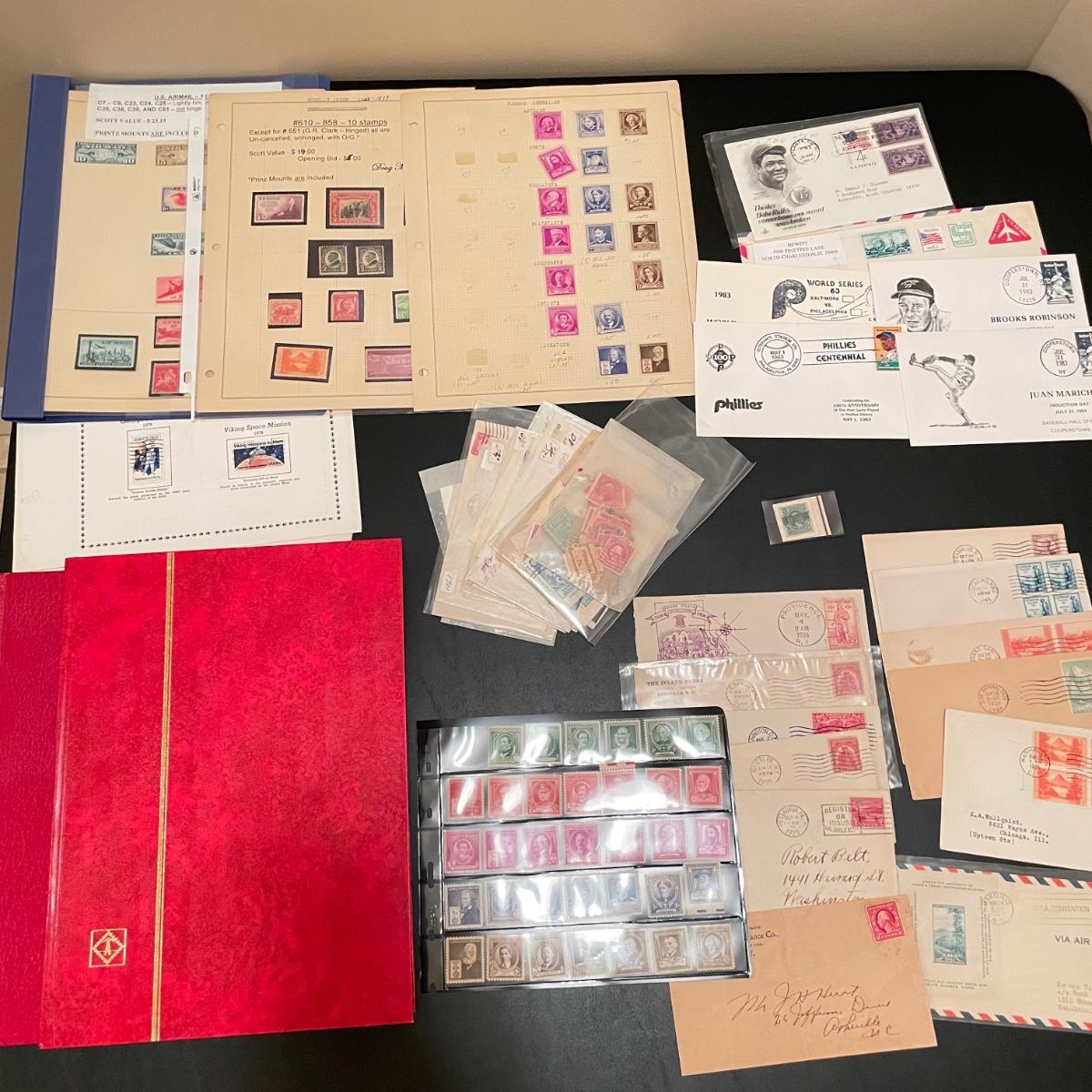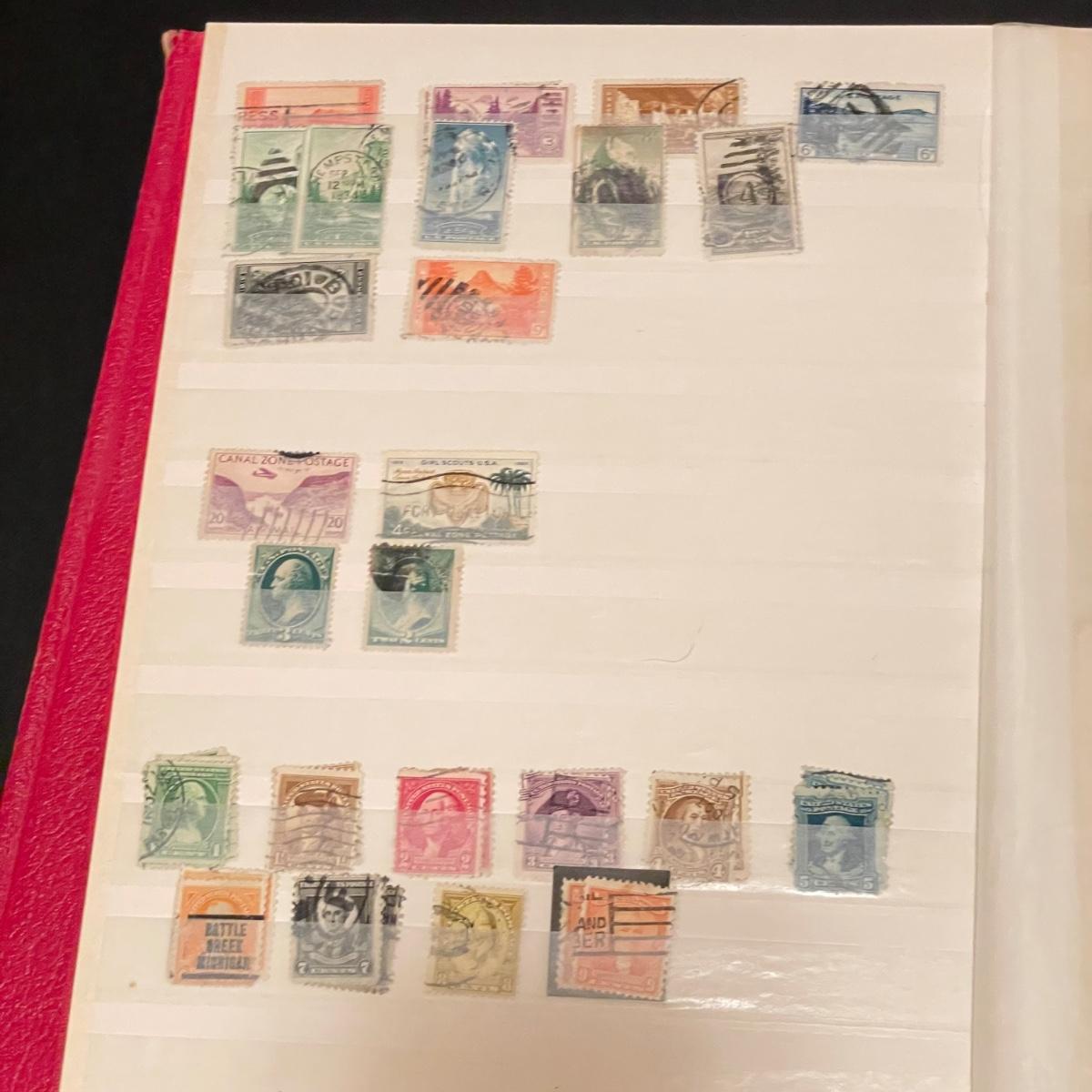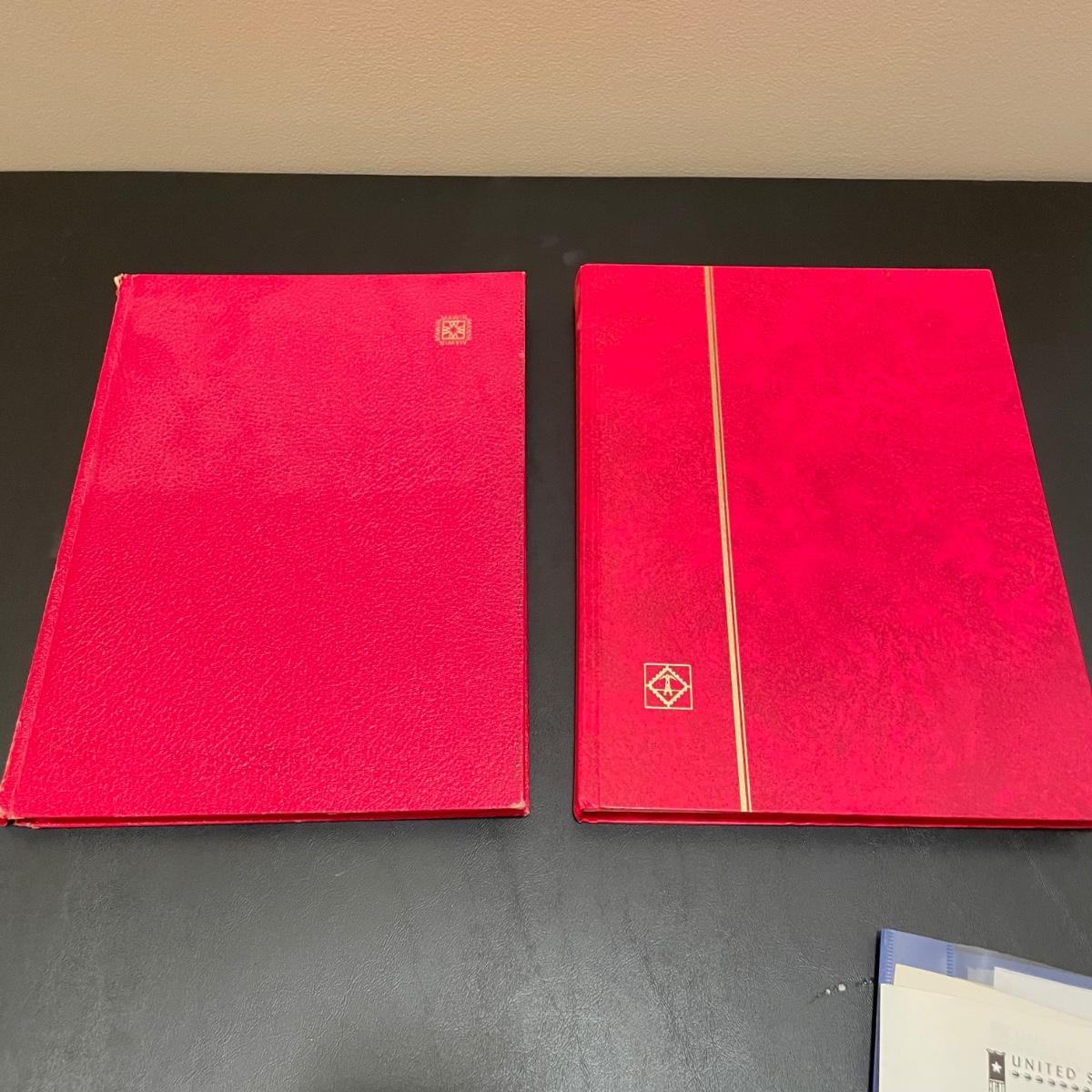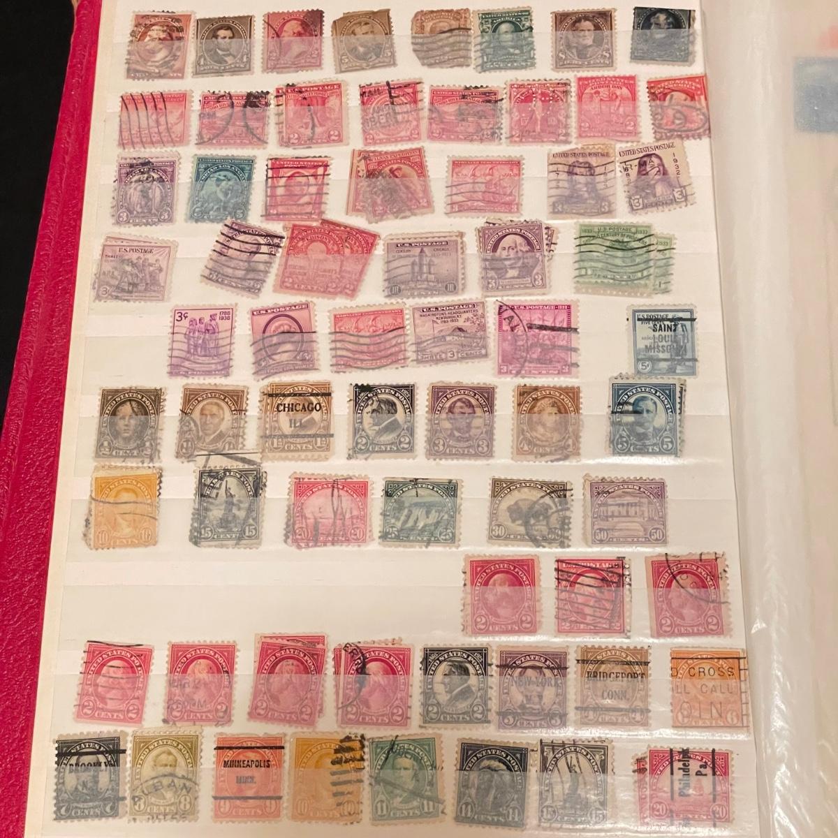 Large Selection of loose canceled & uncanceled stamps. Stamps appear to be mostly US and include a few addressed envelopes, a few plates and collectible pages. There are two red books, one is mostly empty, designed for single stamp collections. The thinner red book has some damage to the edges of the binding. All sales are final. No returns or refunds. Please bid accordingly. Shipping available.