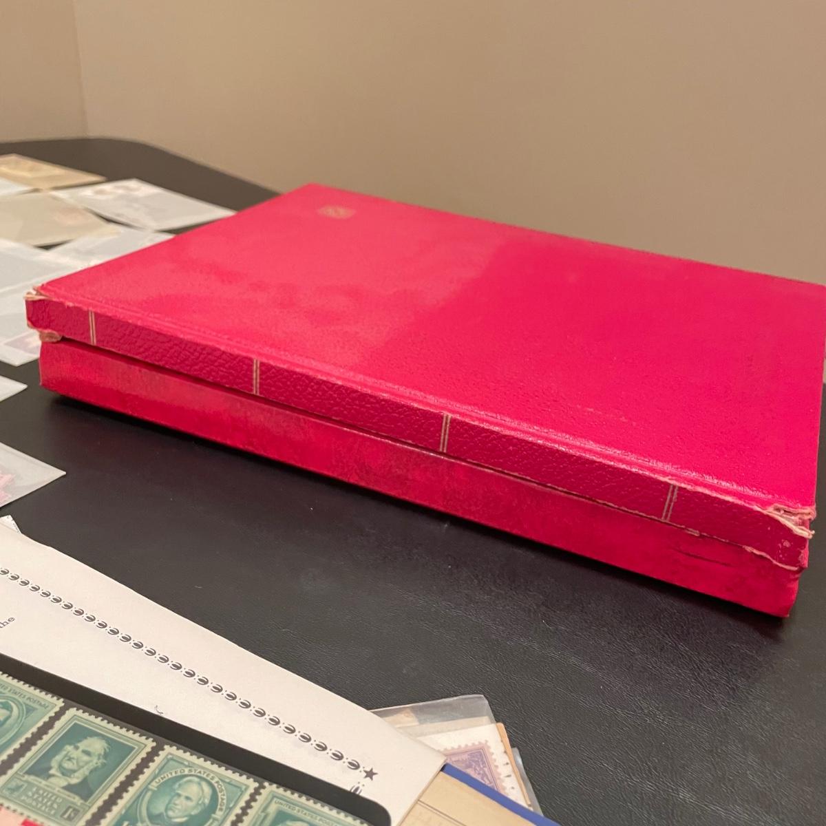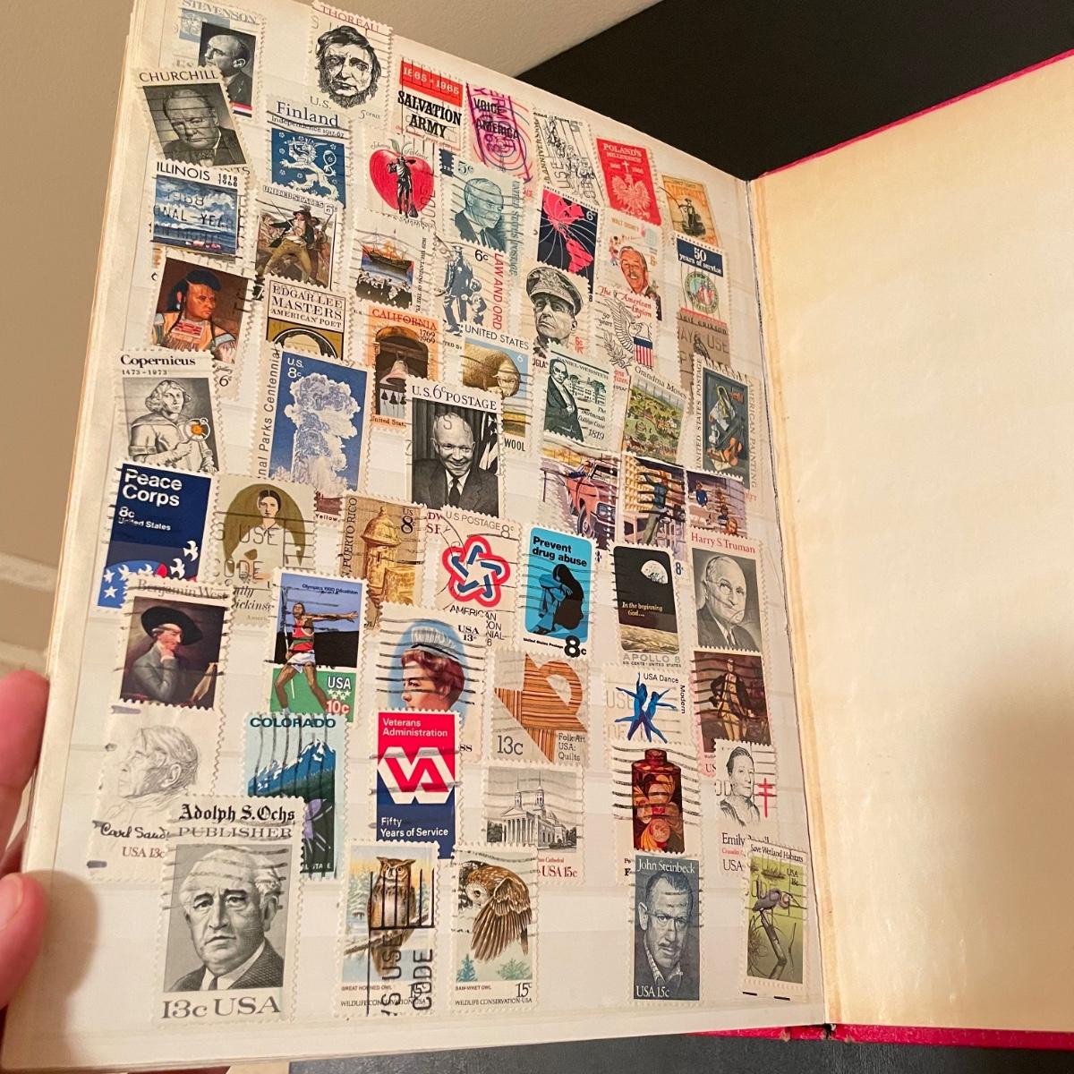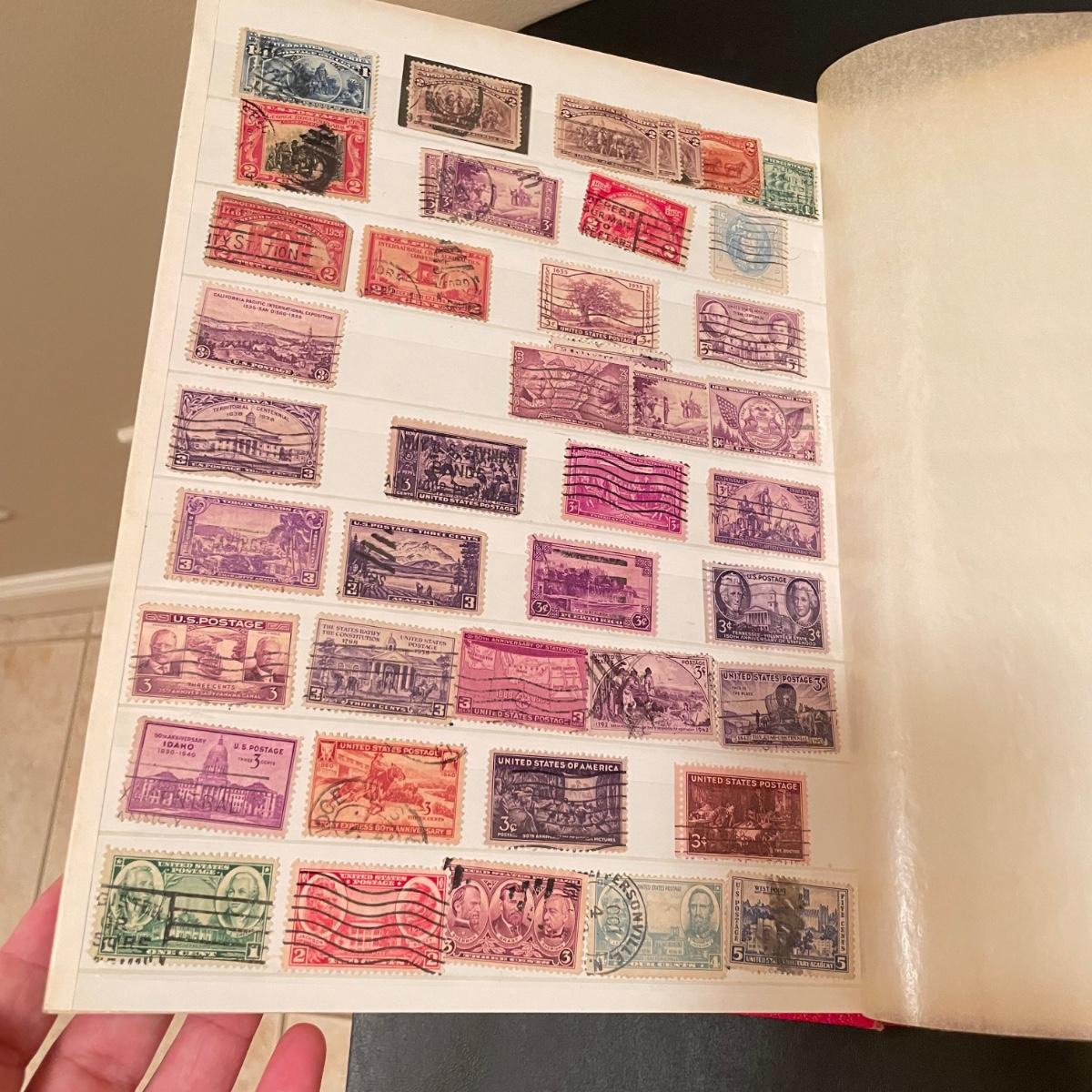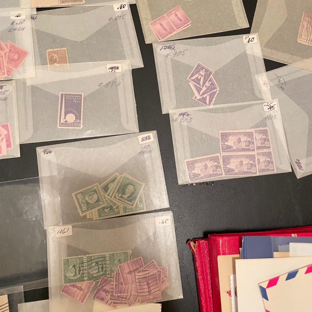 Large Selection of loose canceled & uncanceled stamps. Stamps appear to be mostly US and include a few addressed envelopes, a few plates and collectible pages. There are two red books, one is mostly empty, designed for single stamp collections. The thinner red book has some damage to the edges of the binding. All sales are final. No returns or refunds. Please bid accordingly. Shipping available.