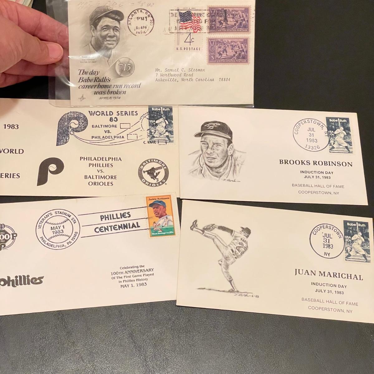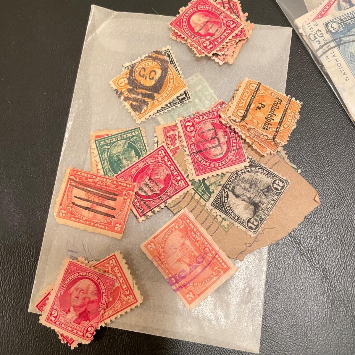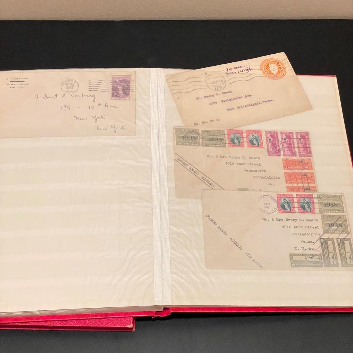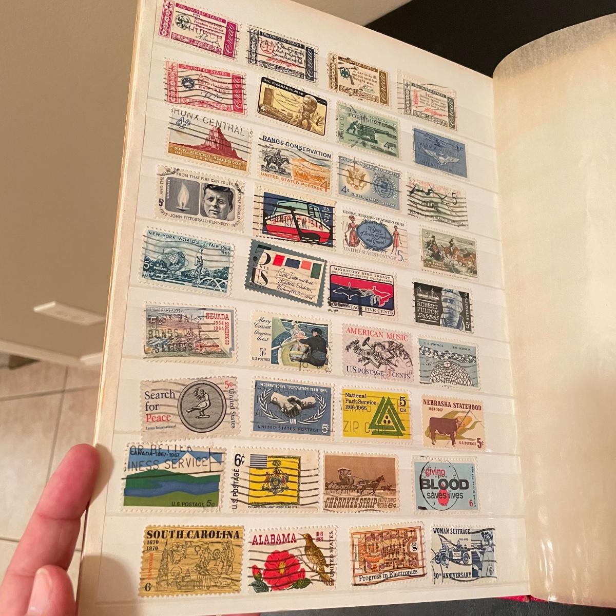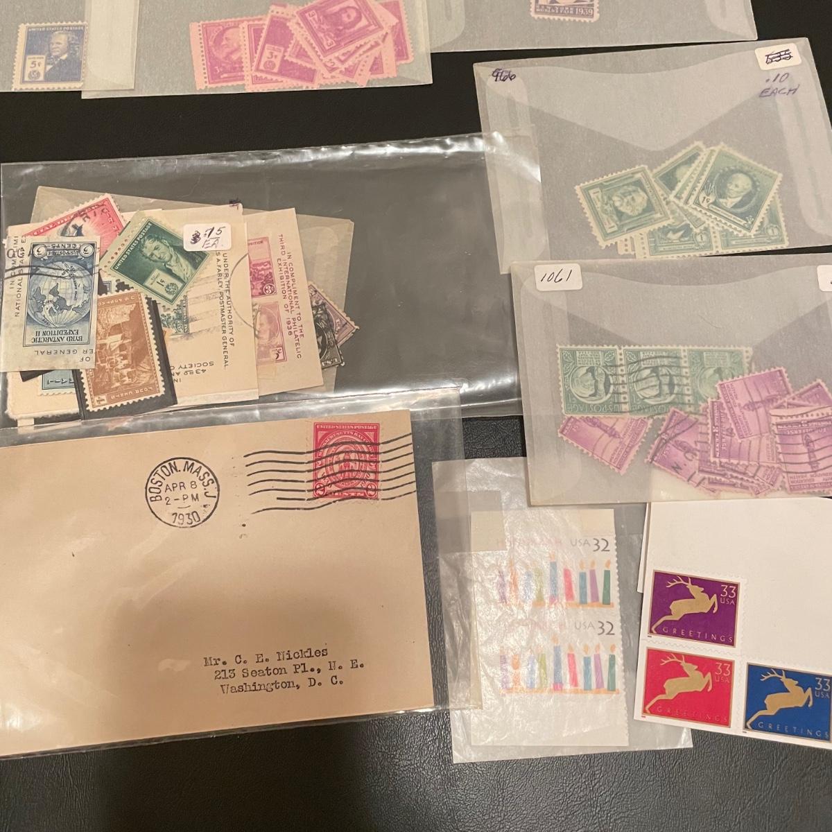 Large Selection of loose canceled & uncanceled stamps. Stamps appear to be mostly US and include a few addressed envelopes, a few plates and collectible pages. There are two red books, one is mostly empty, designed for single stamp collections. The thinner red book has some damage to the edges of the binding. All sales are final. No returns or refunds. Please bid accordingly. Shipping available.