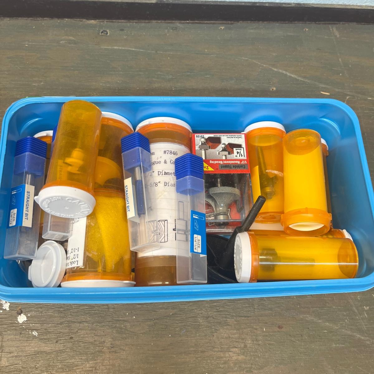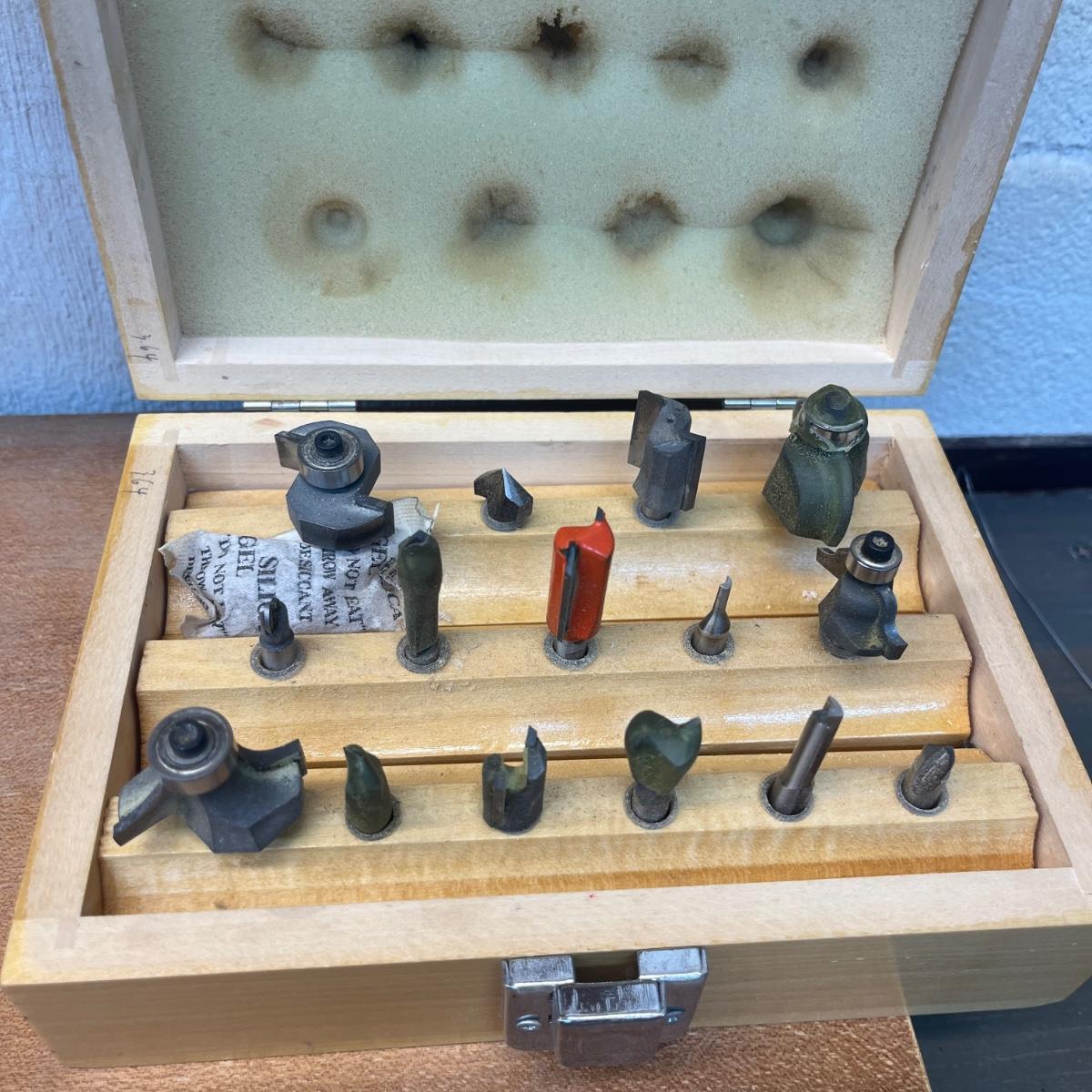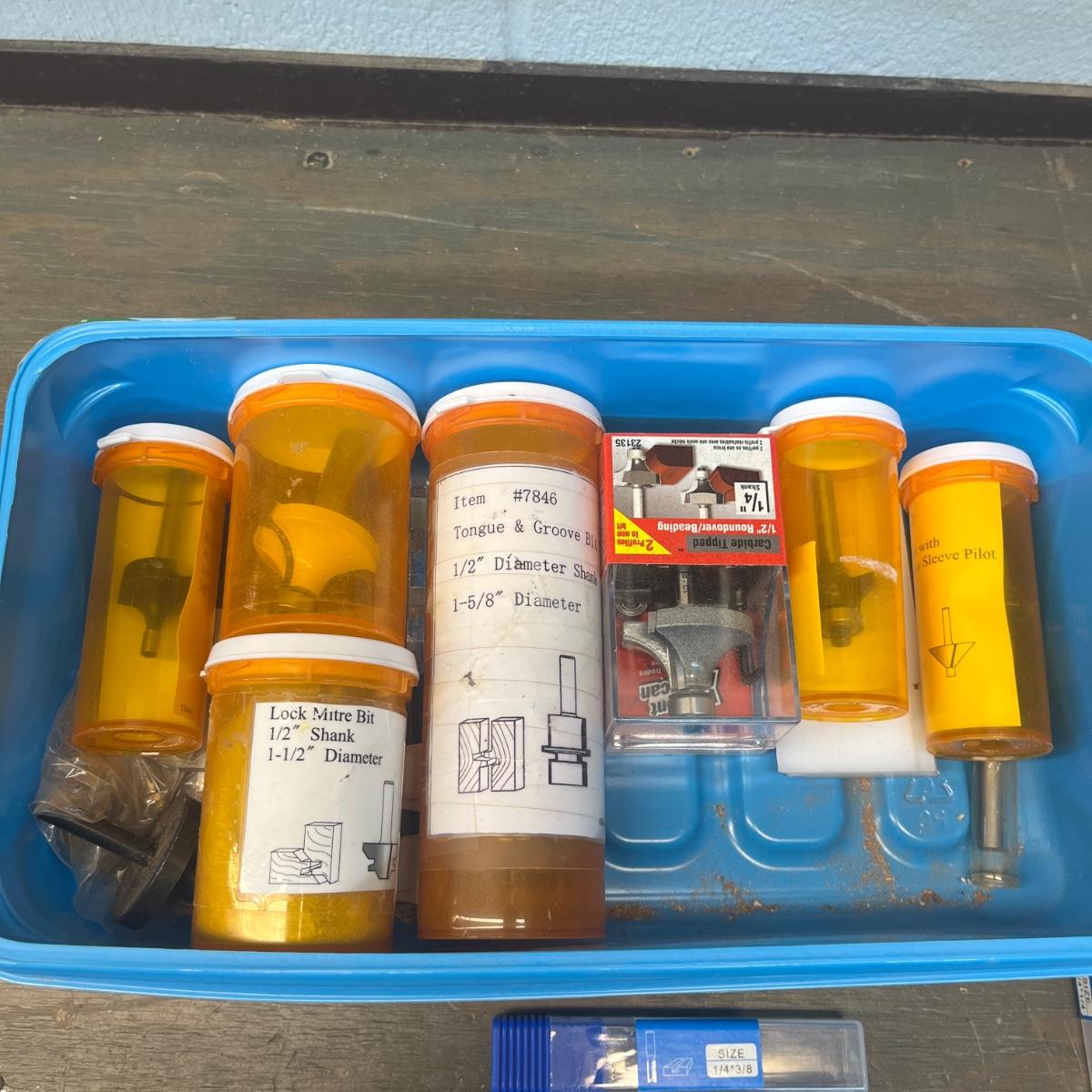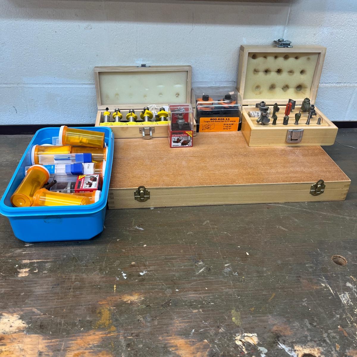Lot includes approximately 50 router bits in a variety of styles and sizes. Largest box measures 17” x 12” x 2”H.