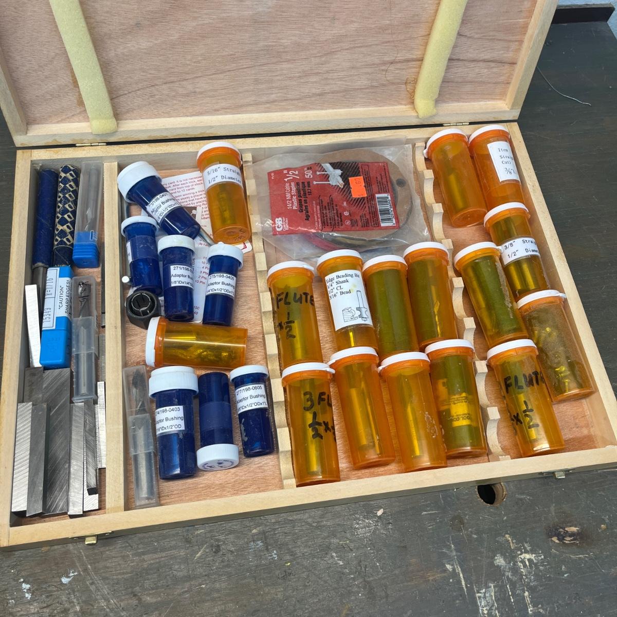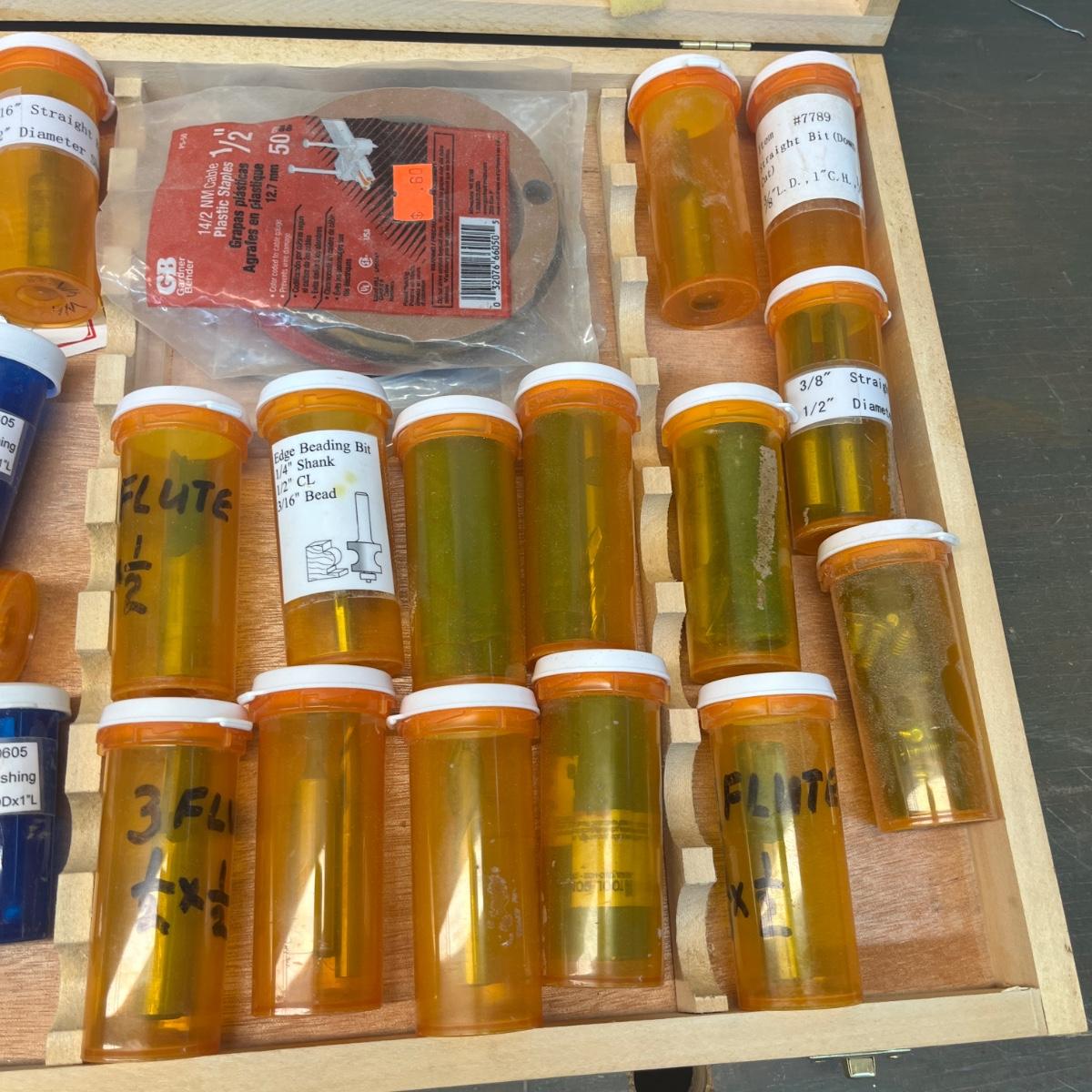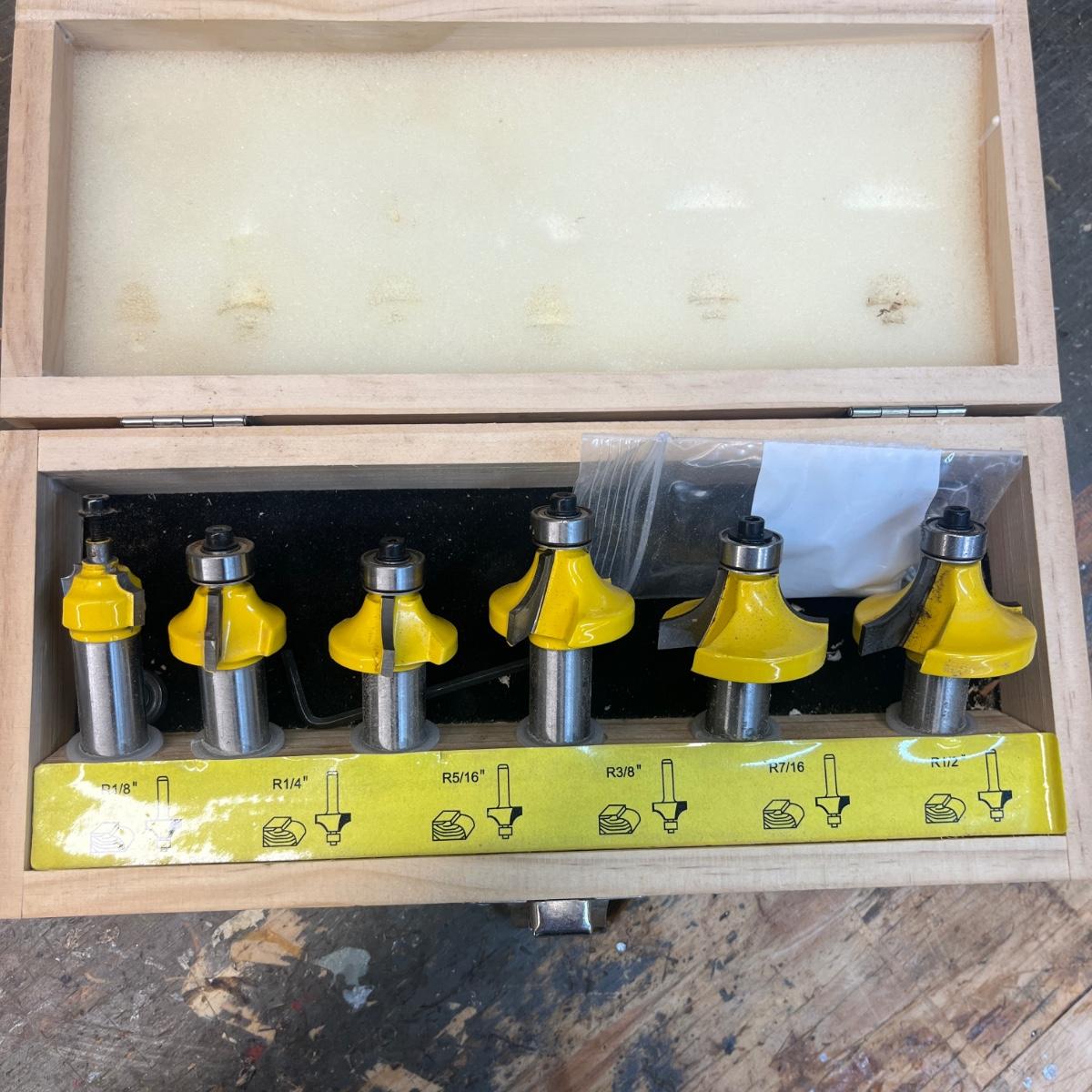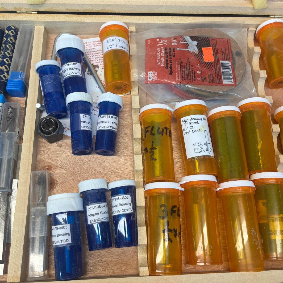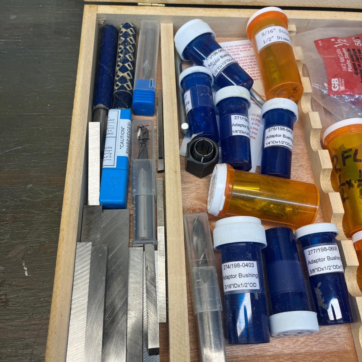 Lot includes approximately 50 router bits in a variety of styles and sizes. Largest box measures 17” x 12” x 2”H.