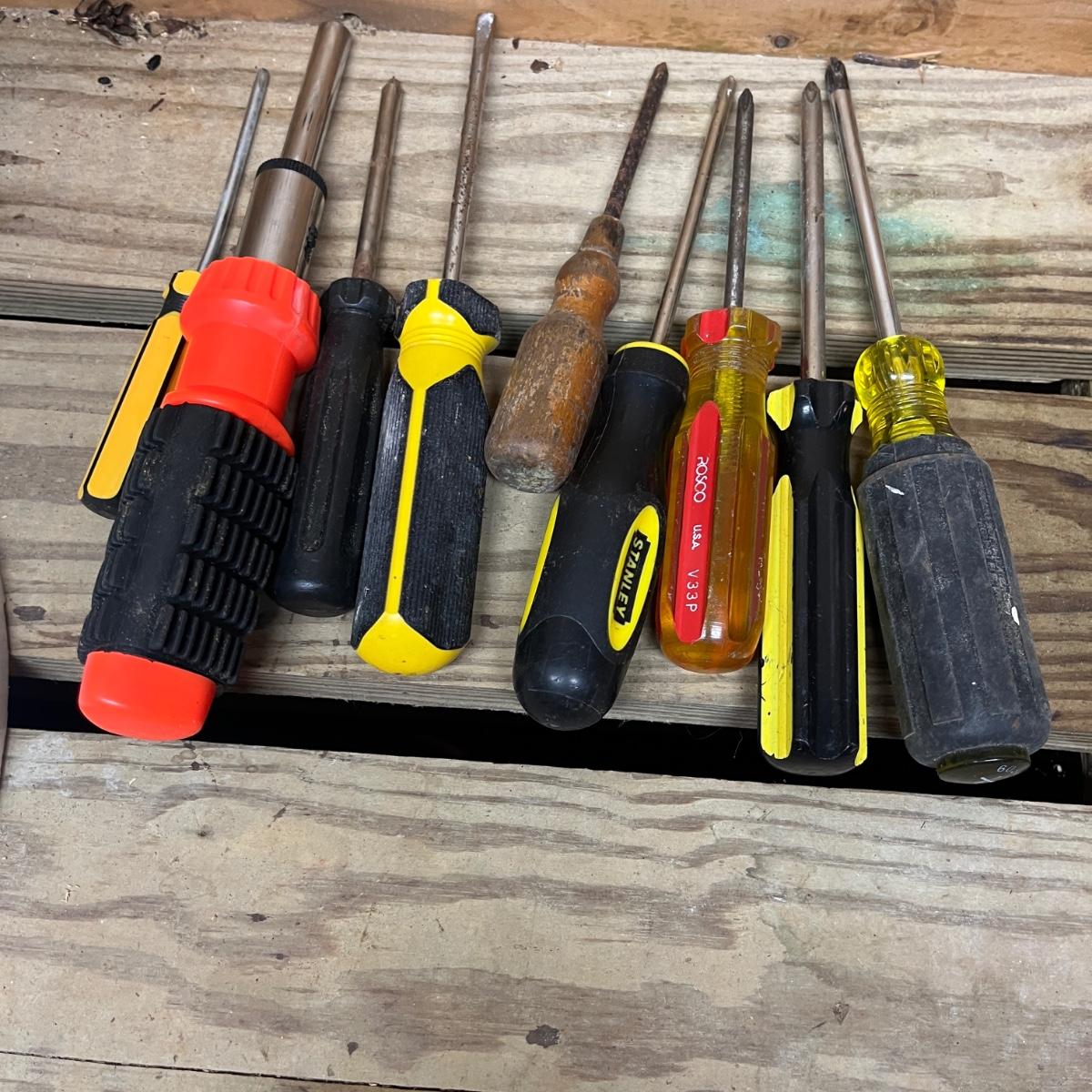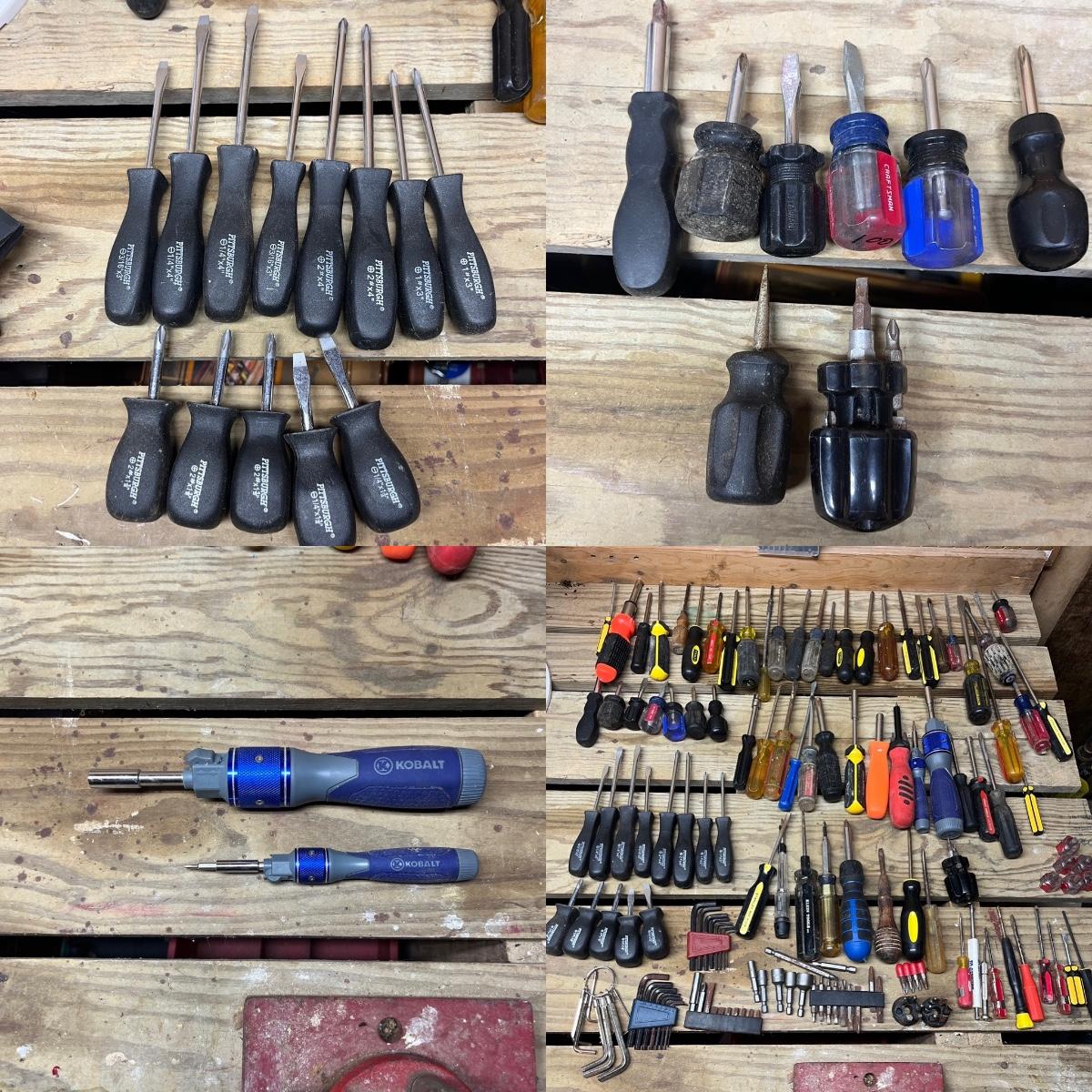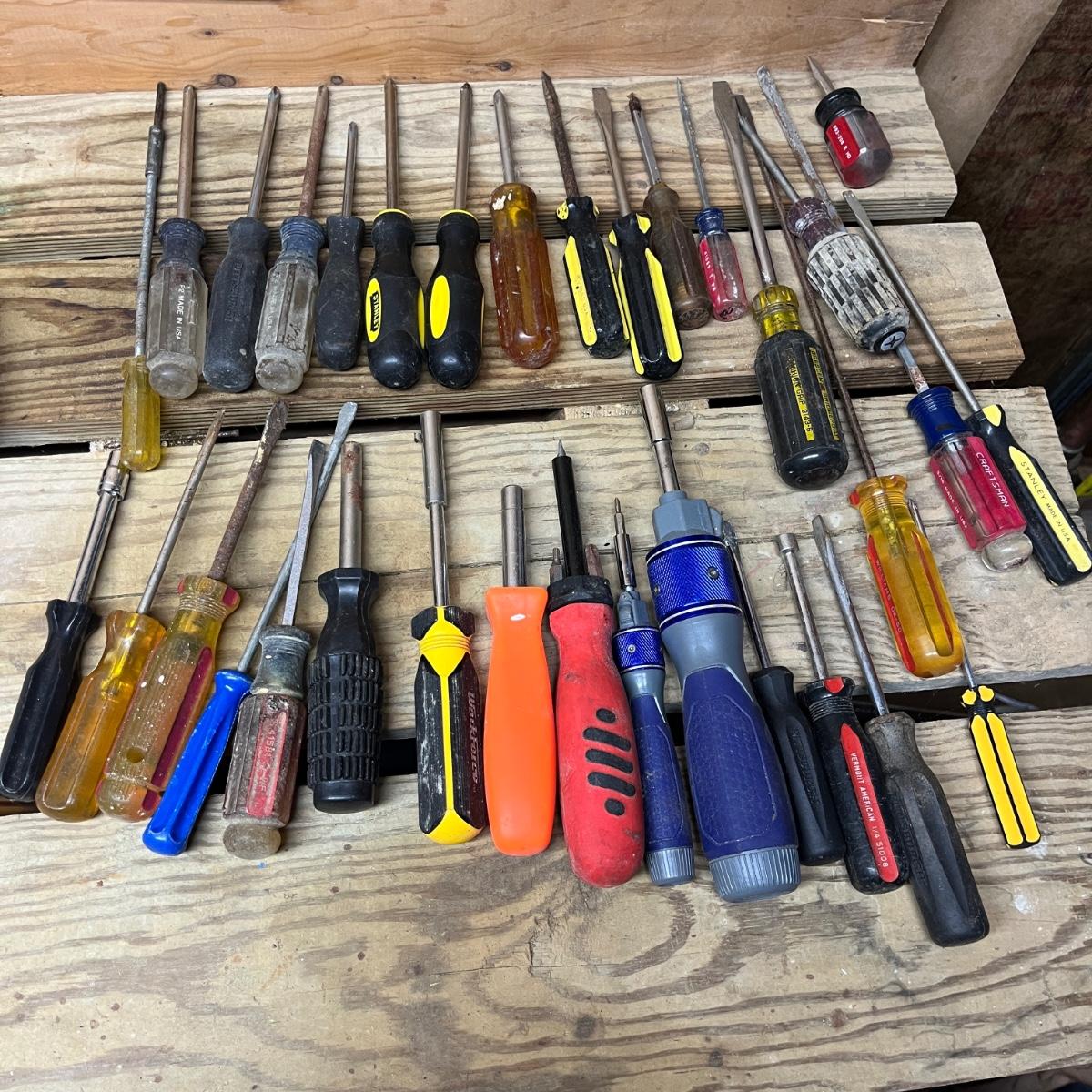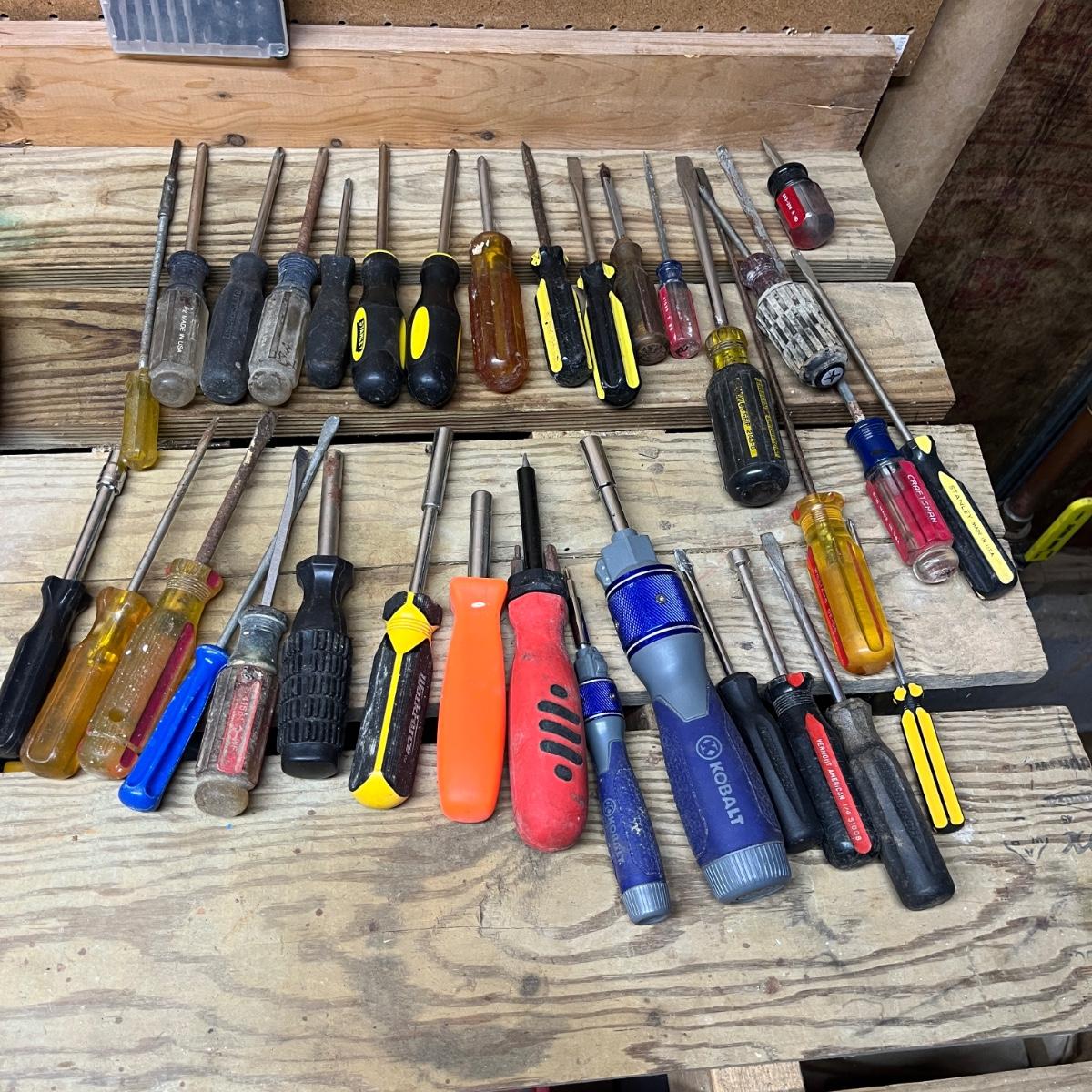 This selection of screwdrivers includes Phillips, slotted, torx, ratcheting screwdrivers made by Kobalt, Stanley, Craftsman, Klein, Pittsburgh, Husky and more. Longest screwdriver measures 14” long.