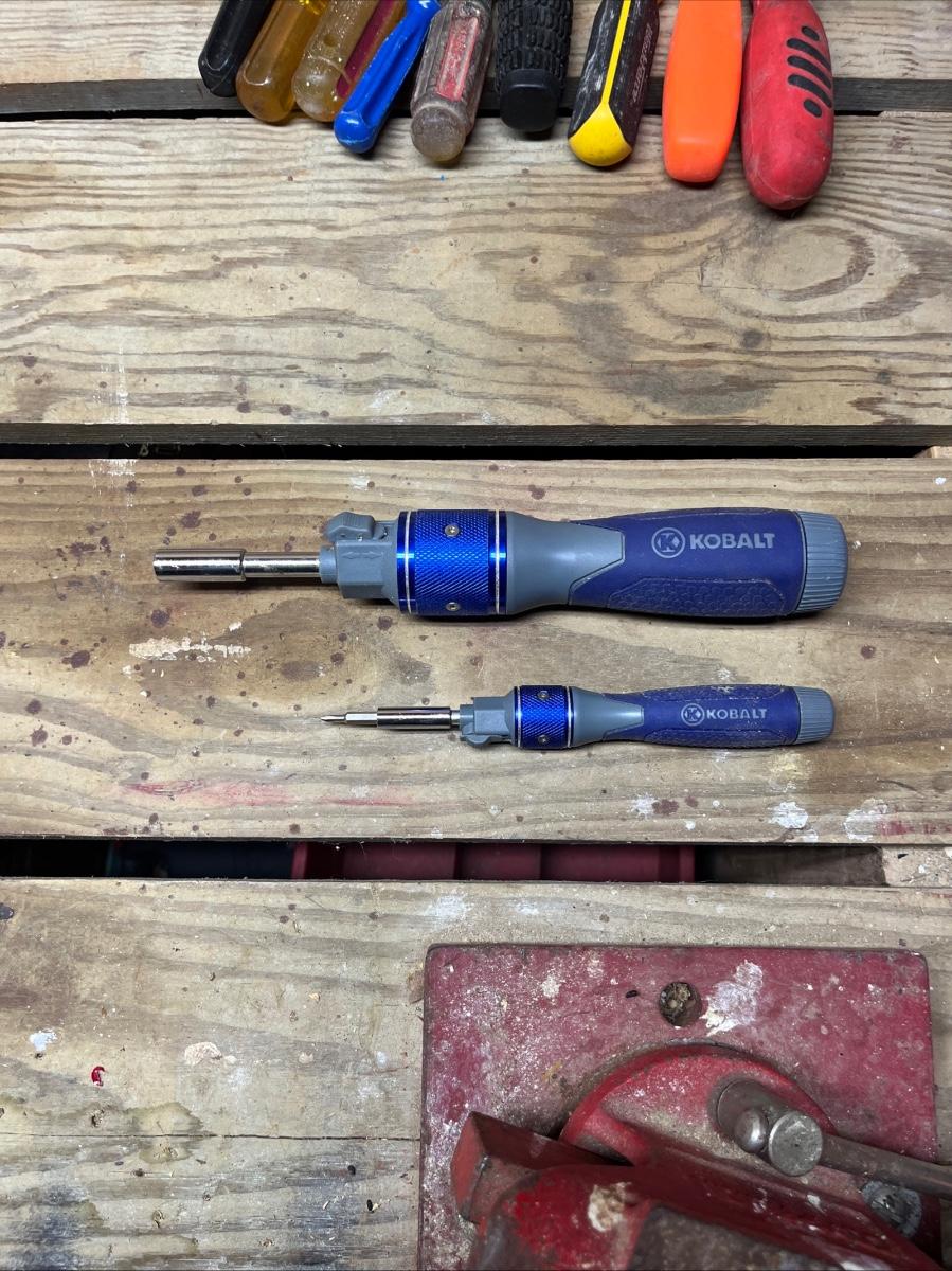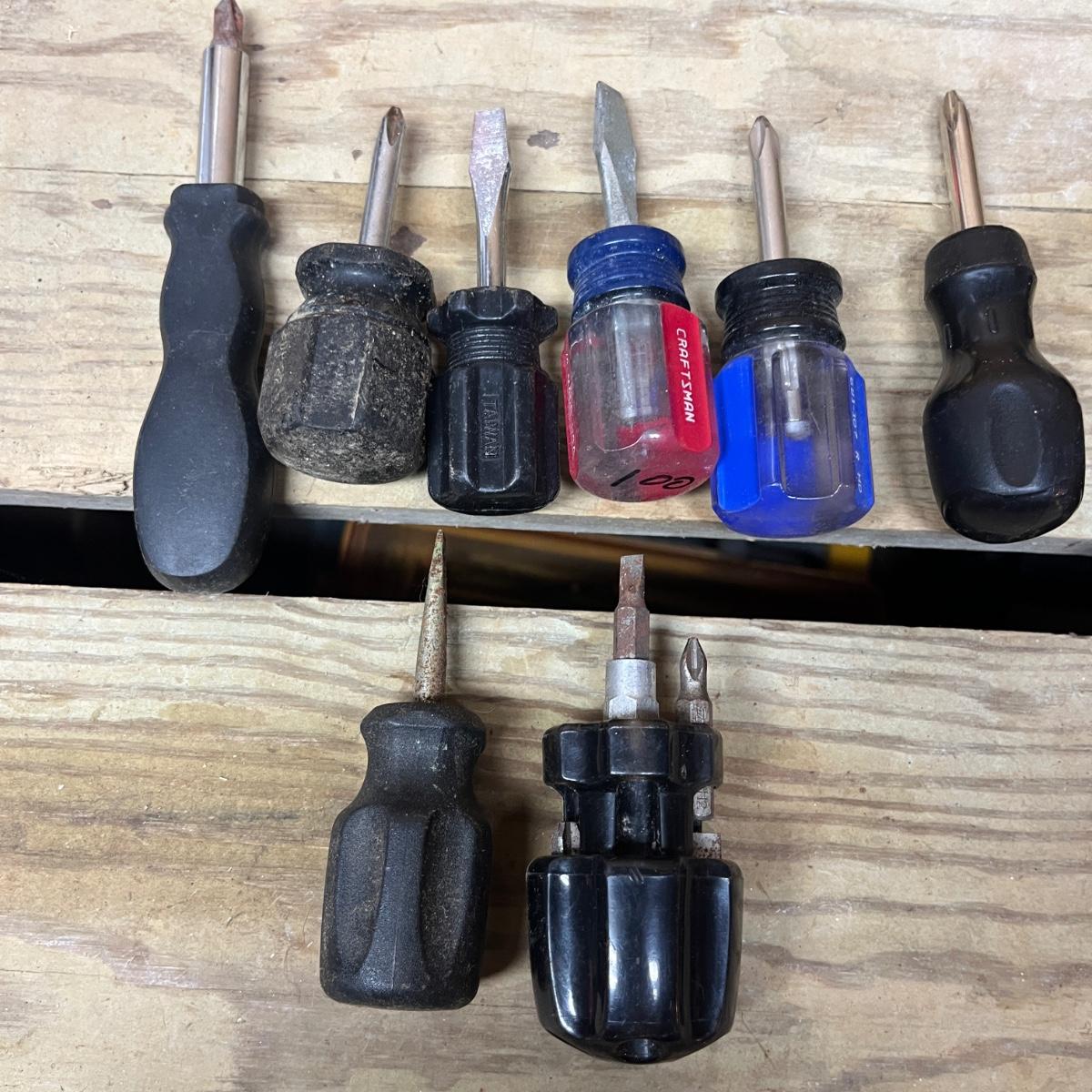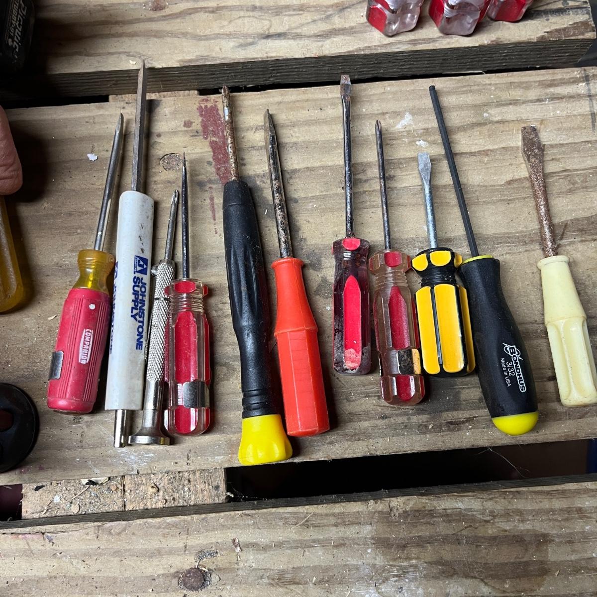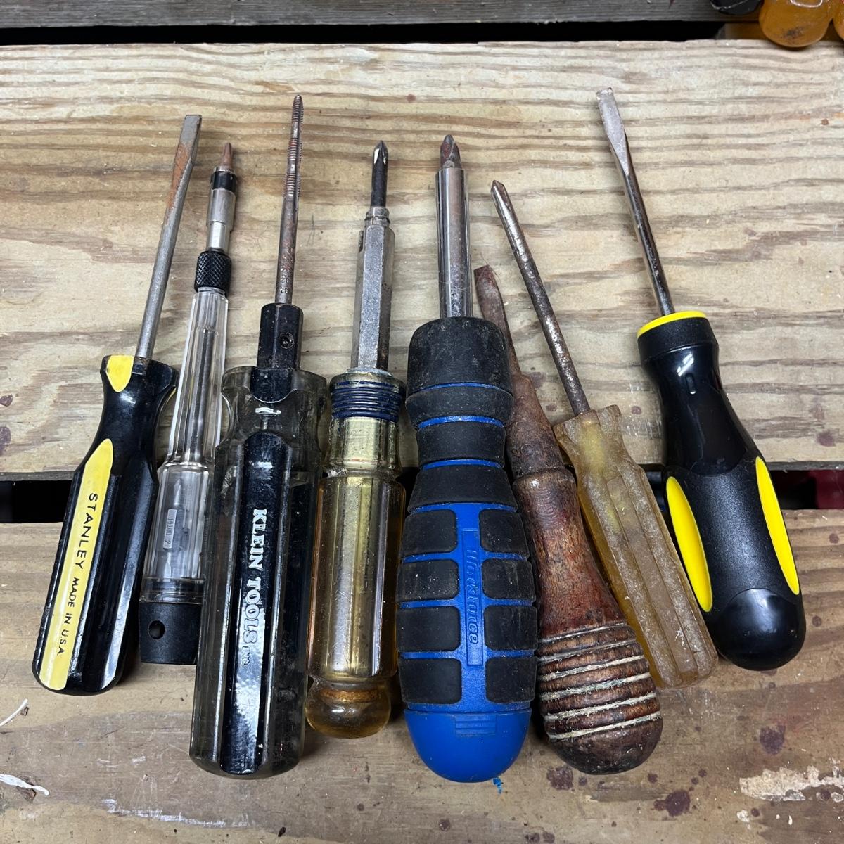 This selection of screwdrivers includes Phillips, slotted, torx, ratcheting screwdrivers made by Kobalt, Stanley, Craftsman, Klein, Pittsburgh, Husky and more. Longest screwdriver measures 14” long.