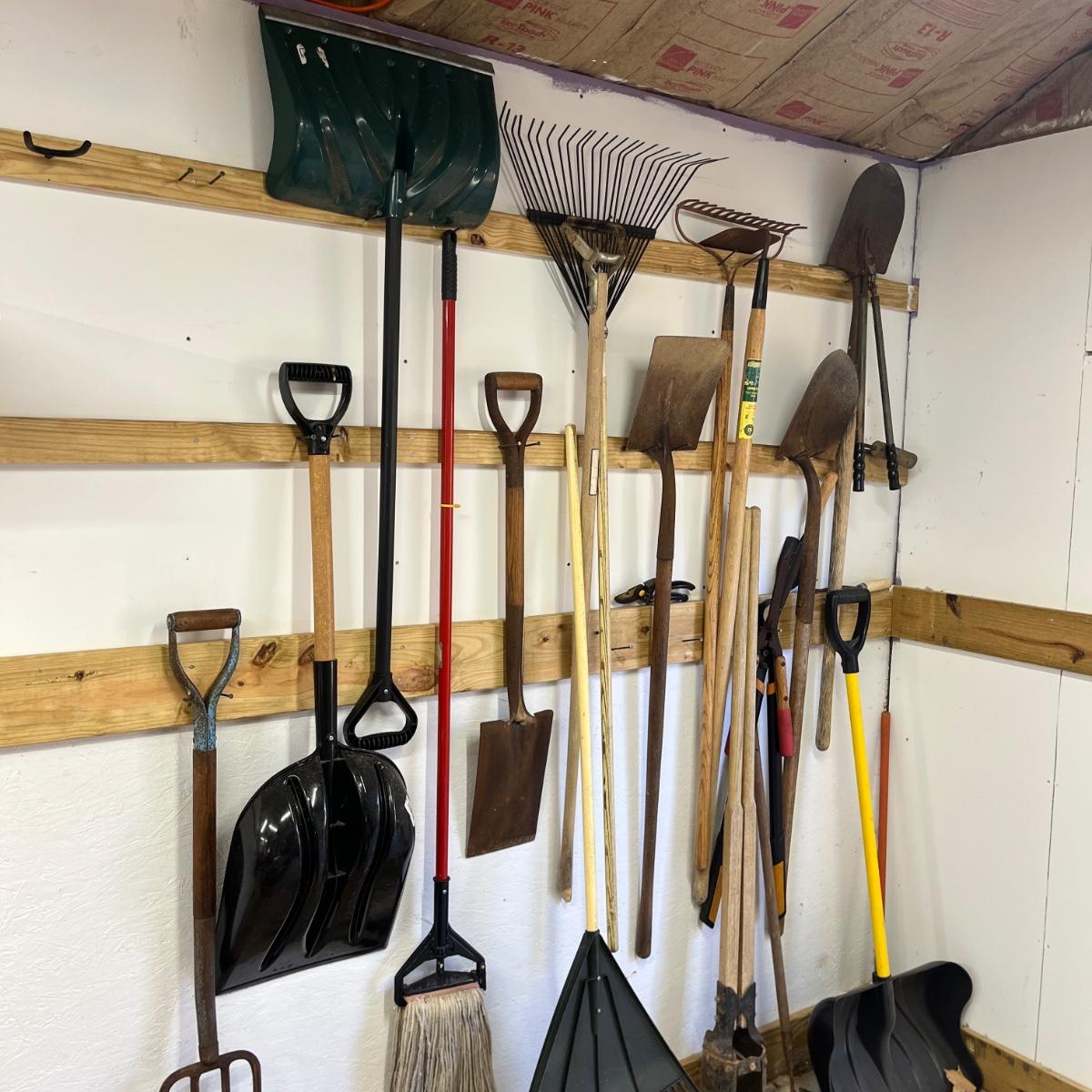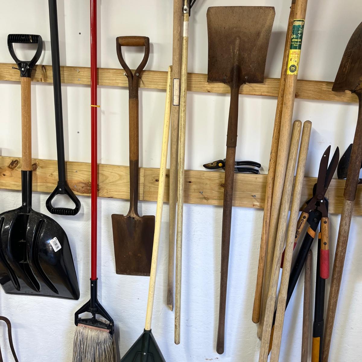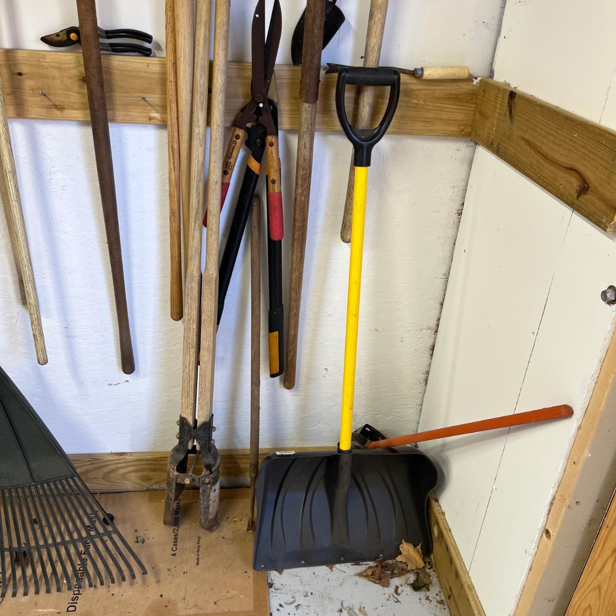 Lot contains a large selection of yard tools including snow shovels, plastic and metal rake, shovels, heavy rake, potato fork, post hole digger loppers, hand nippers, pecan picker upper and more.