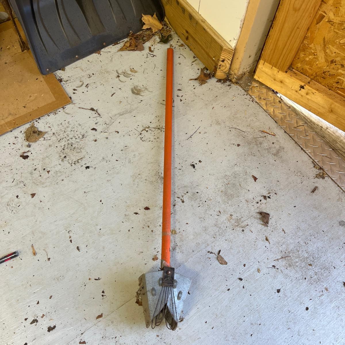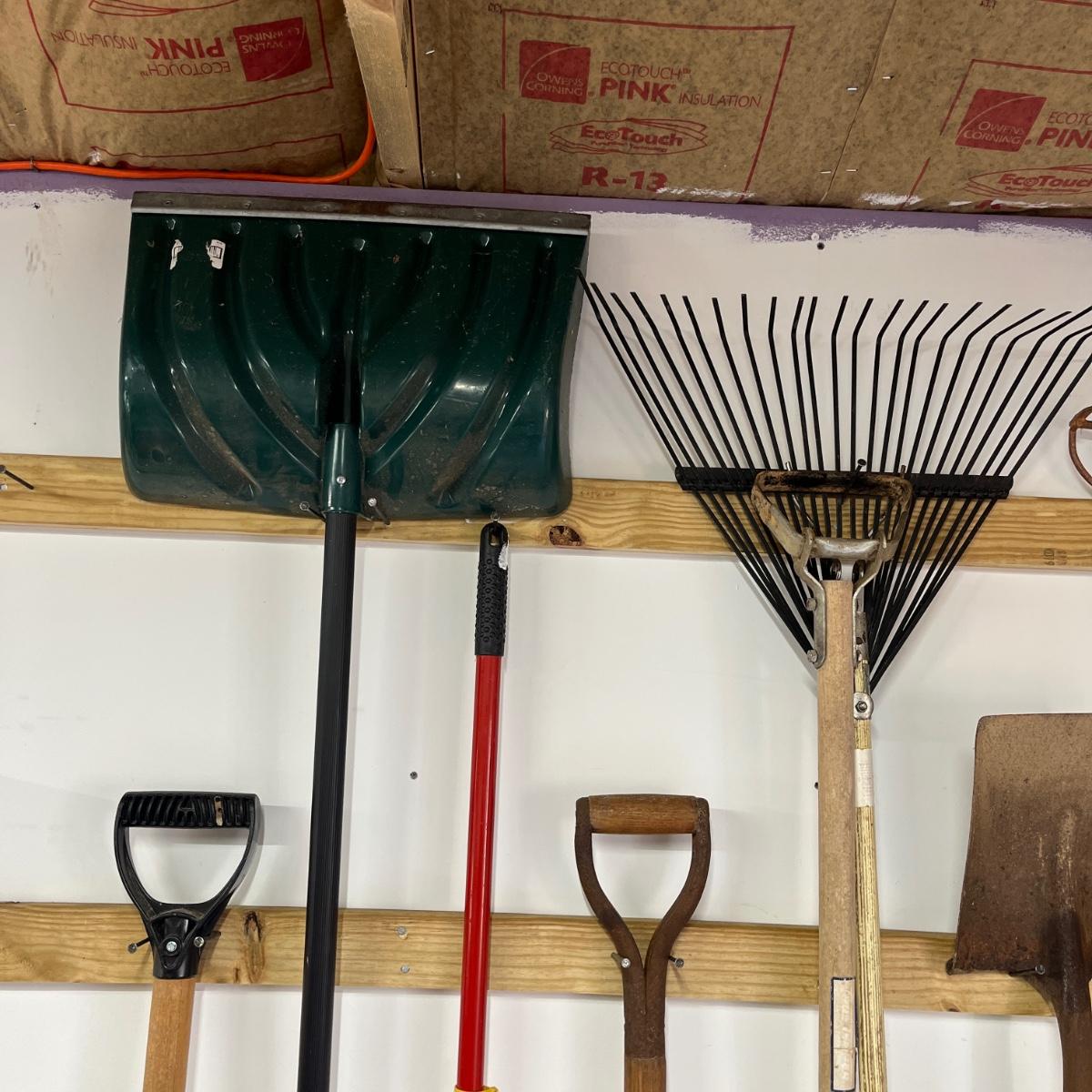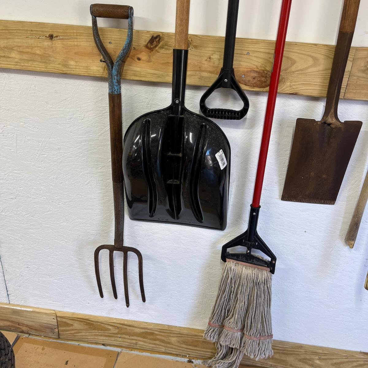 Lot contains a large selection of yard tools including snow shovels, plastic and metal rake, shovels, heavy rake, potato fork, post hole digger loppers, hand nippers, pecan picker upper and more.