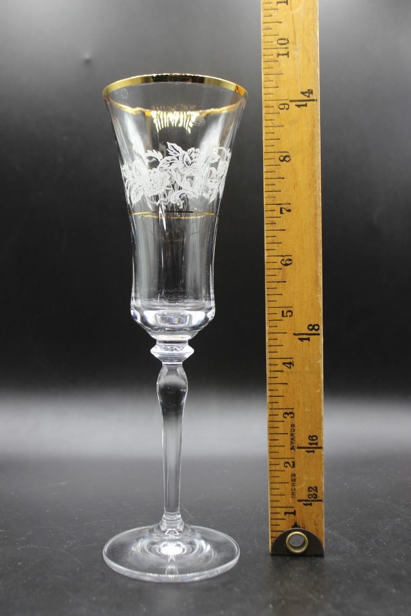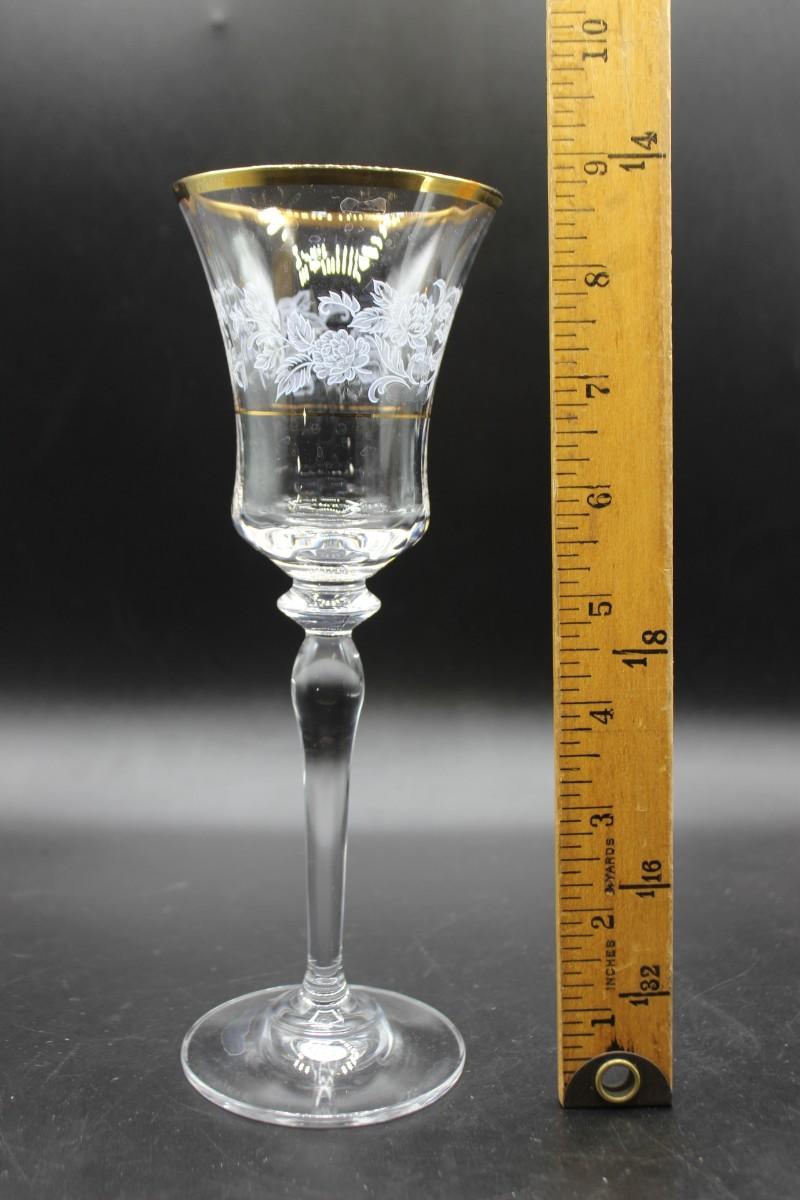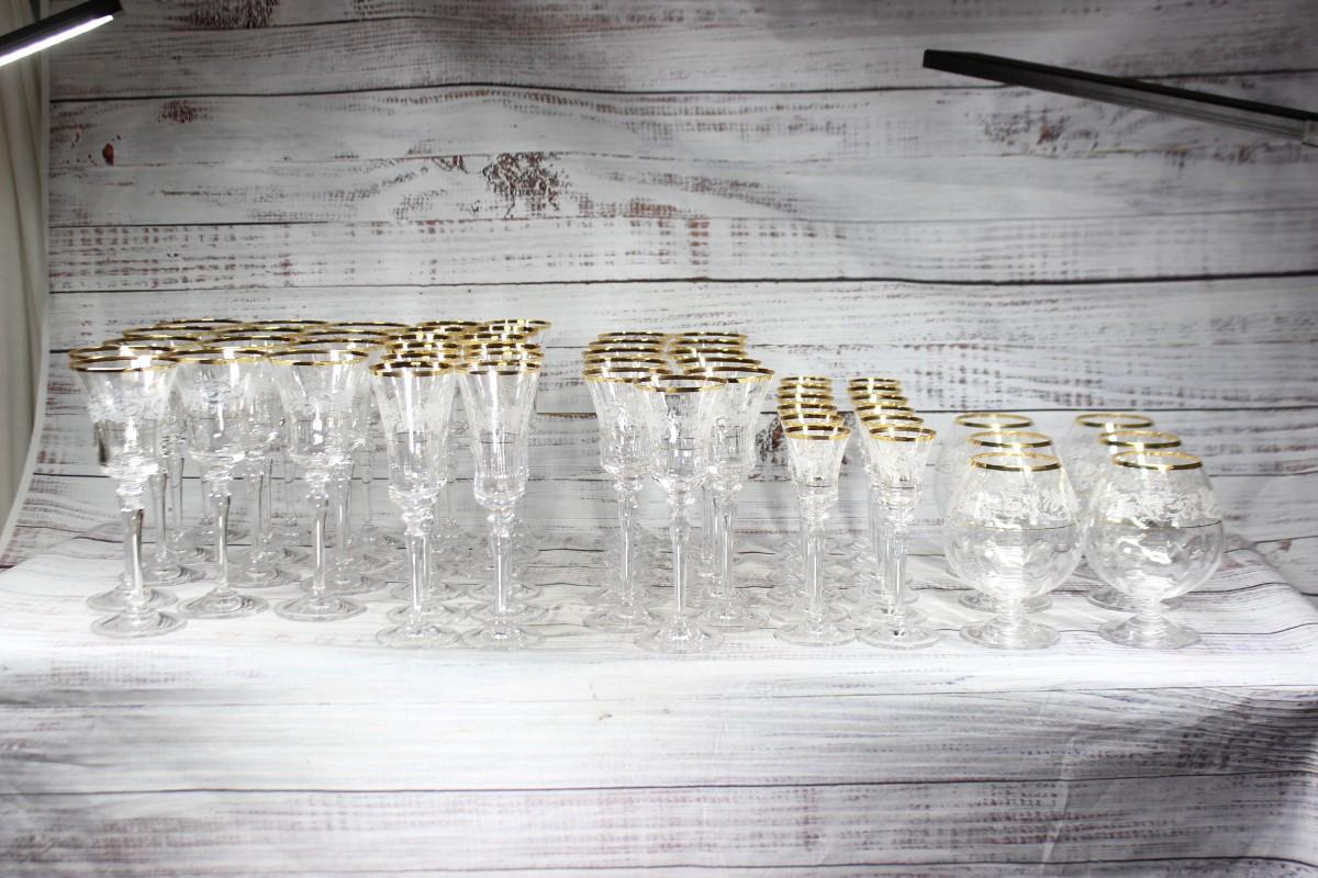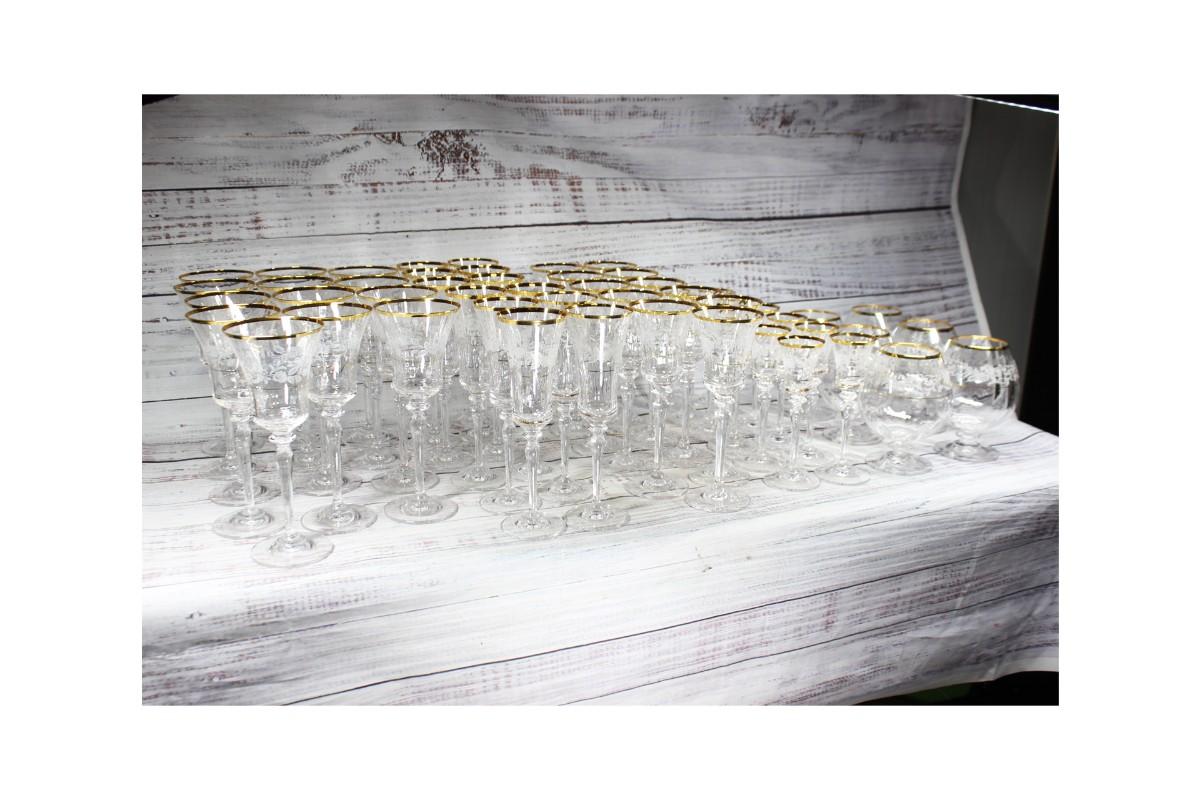 Mikasa "Antique Lace" stemware set. 5 different glass sizes, 55 pieces total. Delicate floral pattern with gold rim. Good condition.