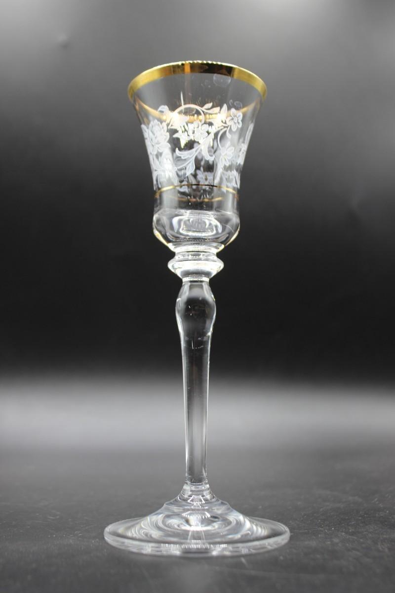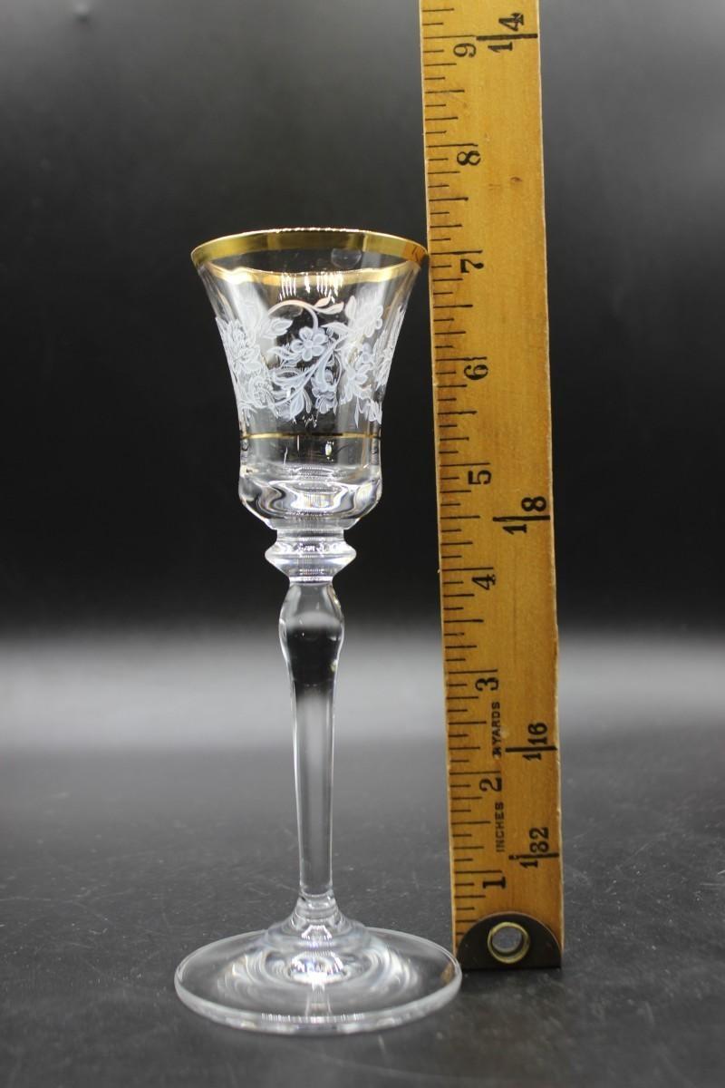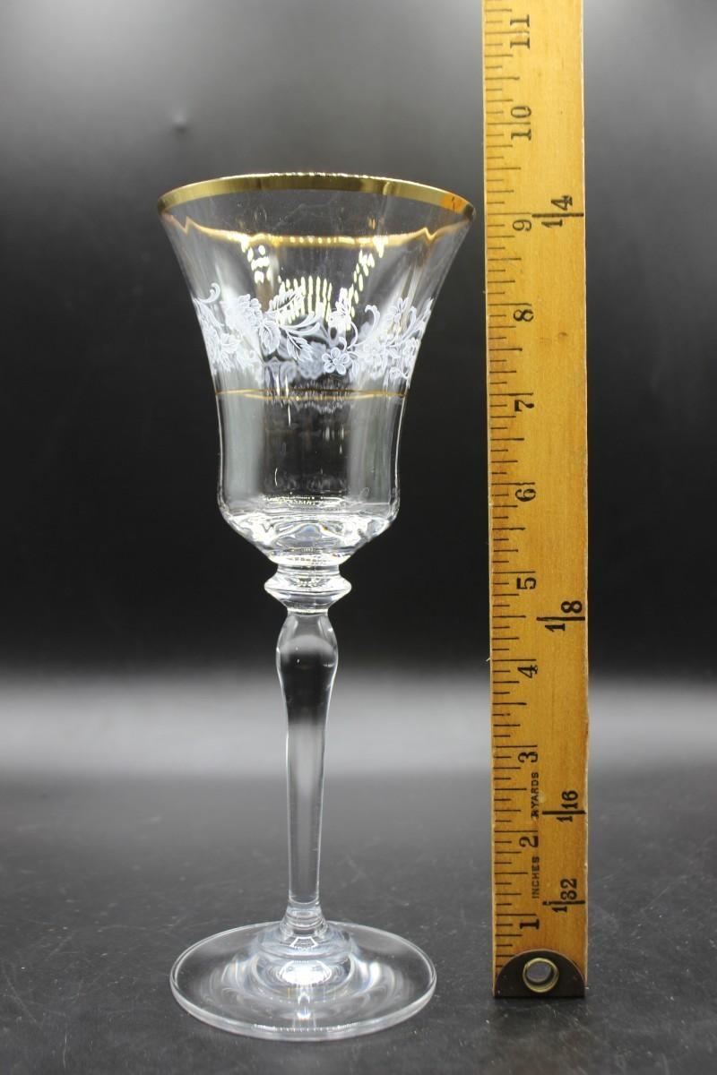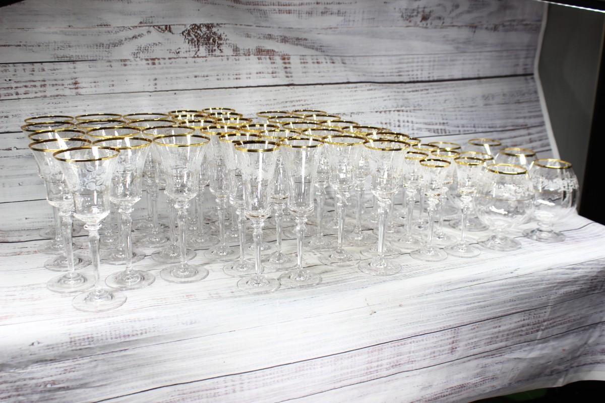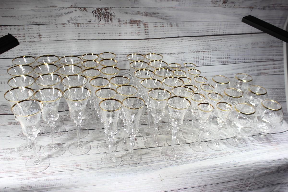 Mikasa "Antique Lace" stemware set. 5 different glass sizes, 55 pieces total. Delicate floral pattern with gold rim. Good condition.