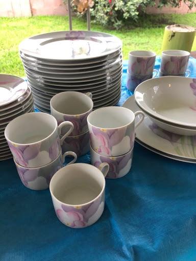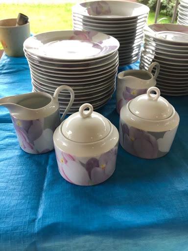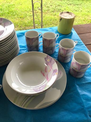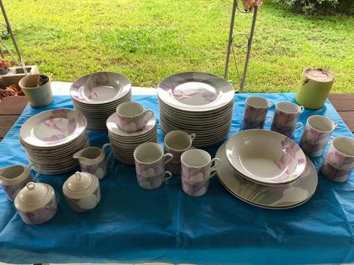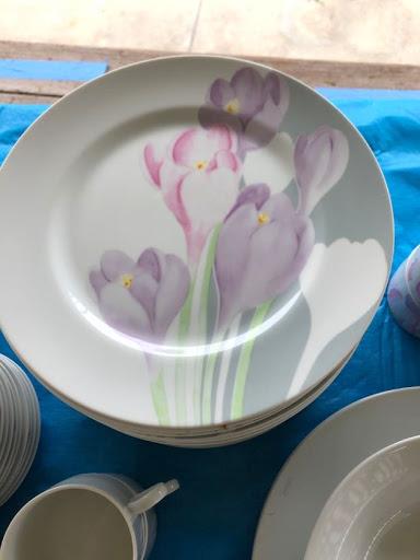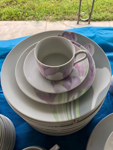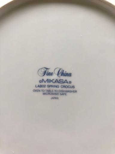 Large Set of Mikasa Fine China in "Spring Crocus". Comes with dinner plates, salad plates, cups & saucers, bowls, 2 platter plates, 2 serving bowls, 2 cream & sugar sets.