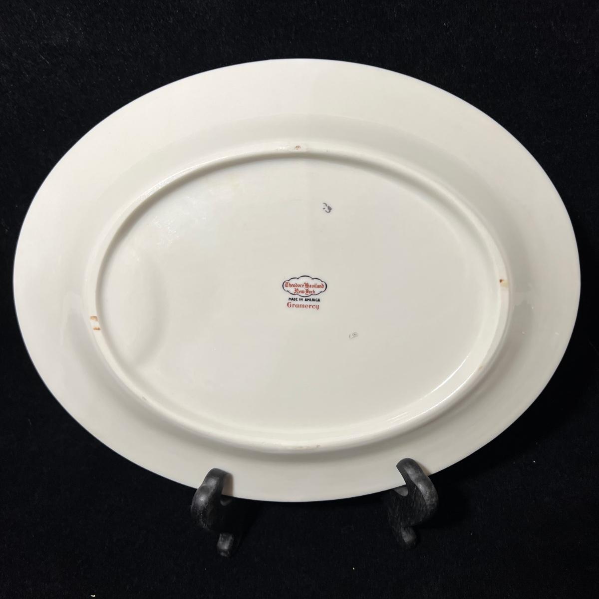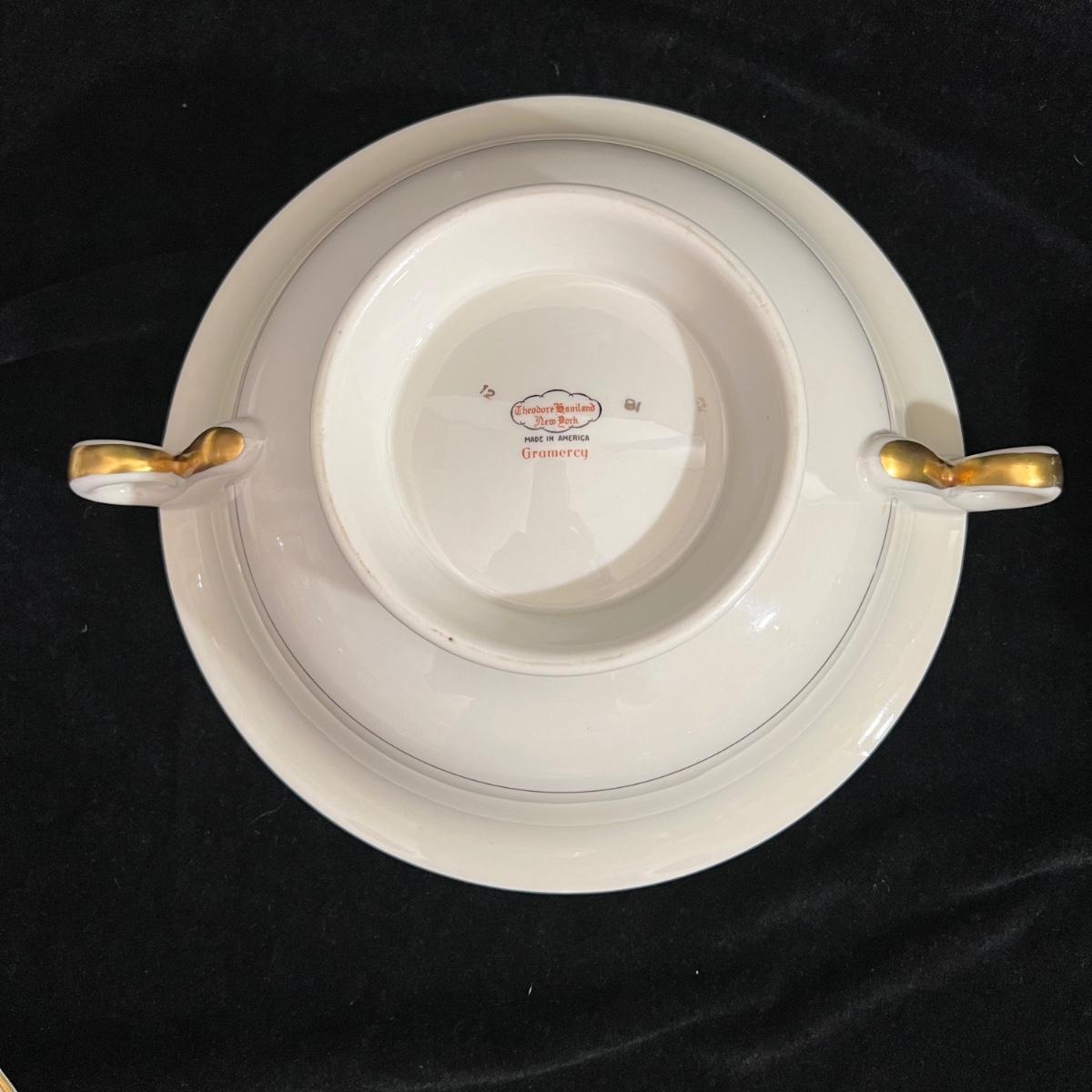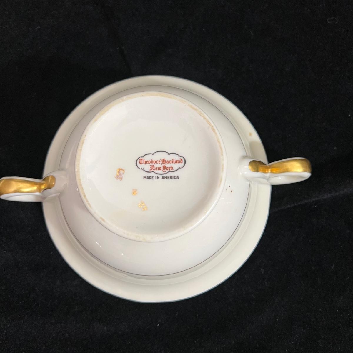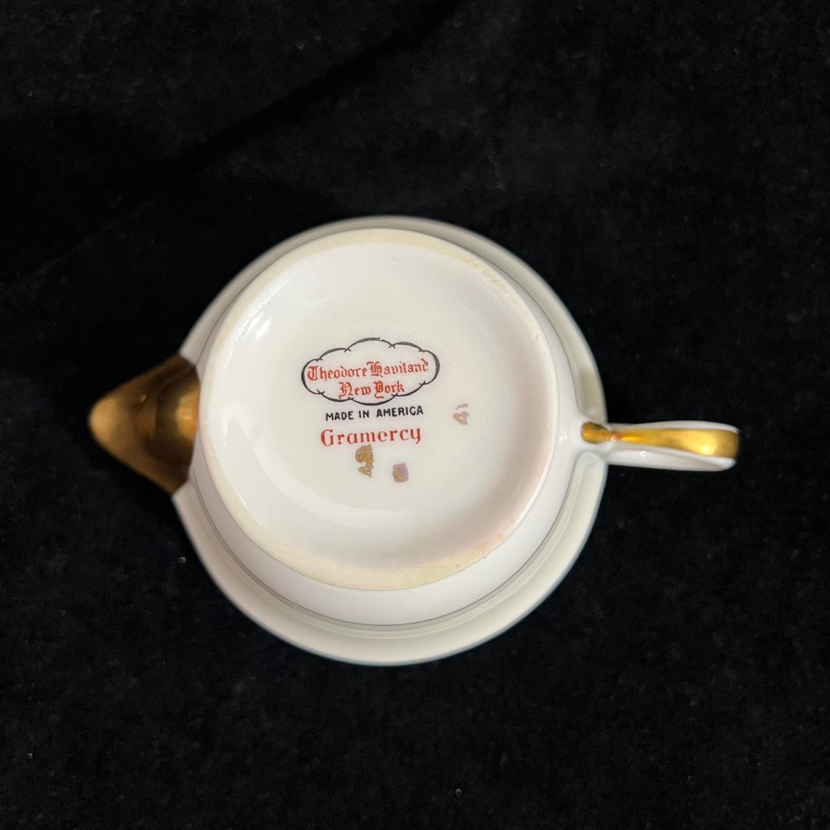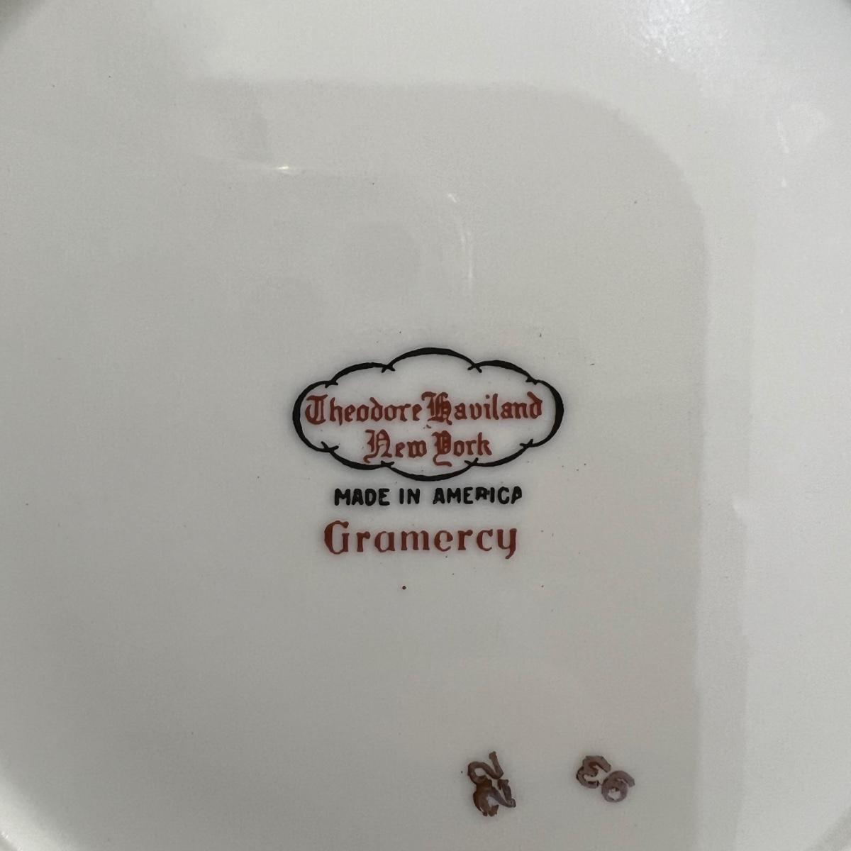 Extensive collection of Theodore Haviland “Gramercy” pattern gold trimmed bone china. Collection is in good condition with some evidence of wear (see photo) and one large chip (see photo of gravy server). Set includes five serving pieces: two oval bowls that are 9.5” L x 7.5” W x 2” H, two oval serving platters, one 11.5” L x 9” W and one 14” L x 11” W. A 9.5” D, a covered serving dish, and a gravy serving bowl with a substantial chip and crack (see photograph). Tea service includes a teapot 5” D x 6” H, sixteen teacups, eight tea saucers, one lidded sugar bowl, and one creamer. The dining service includes eight 7.5” D salad plates, eight 10”D dinner plates, and eight 8” D soup bowls. Two small dish/bowls 5”D x 1”H. Overall all could use a thorough cleaning. Plate stands not included. Shipping available.