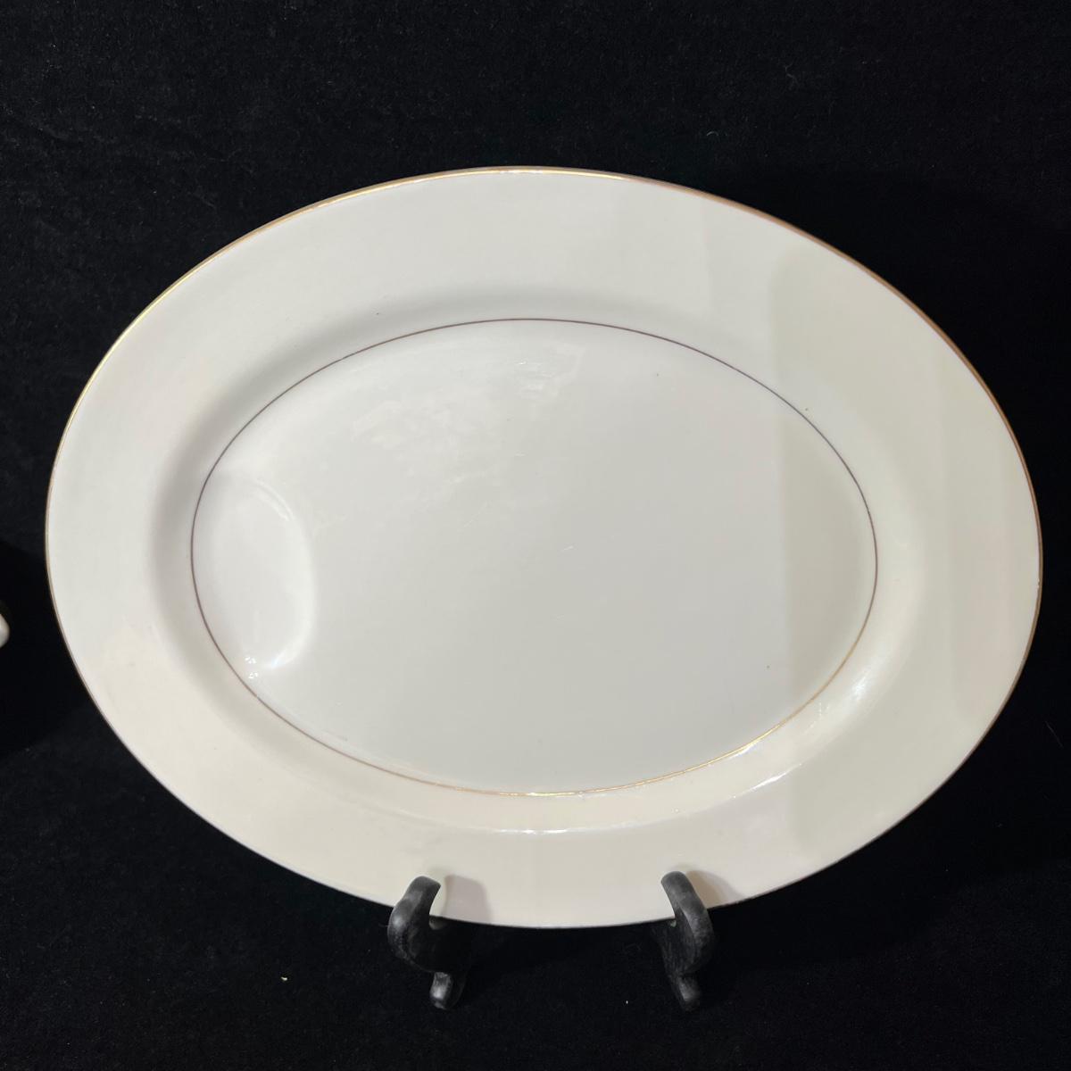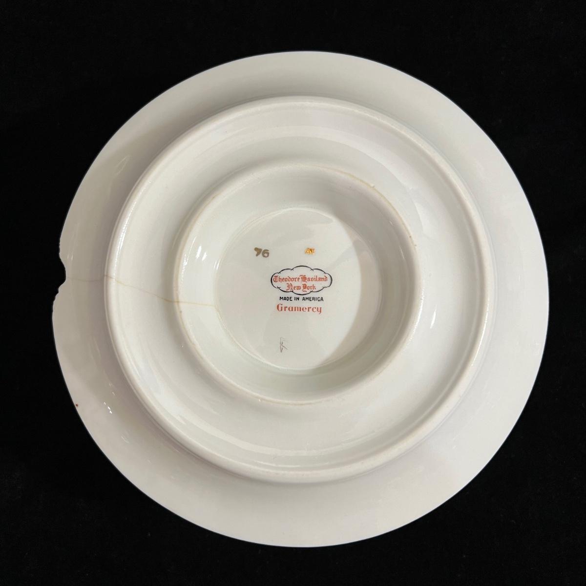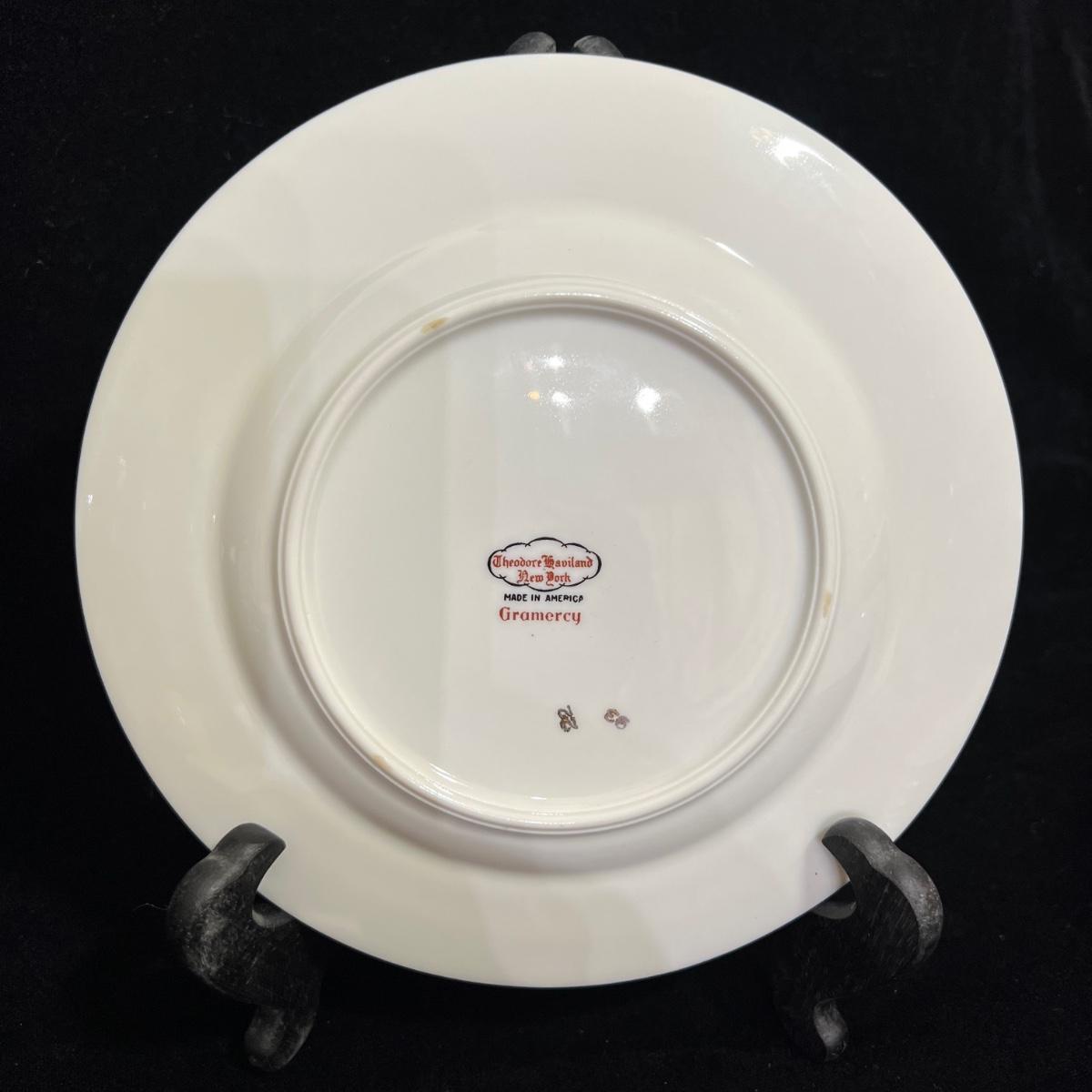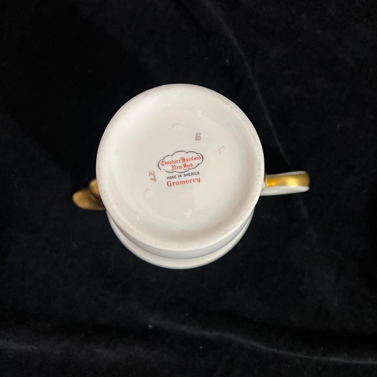 Extensive collection of Theodore Haviland “Gramercy” pattern gold trimmed bone china. Collection is in good condition with some evidence of wear (see photo) and one large chip (see photo of gravy server). Set includes five serving pieces: two oval bowls that are 9.5” L x 7.5” W x 2” H, two oval serving platters, one 11.5” L x 9” W and one 14” L x 11” W. A 9.5” D, a covered serving dish, and a gravy serving bowl with a substantial chip and crack (see photograph). Tea service includes a teapot 5” D x 6” H, sixteen teacups, eight tea saucers, one lidded sugar bowl, and one creamer. The dining service includes eight 7.5” D salad plates, eight 10”D dinner plates, and eight 8” D soup bowls. Two small dish/bowls 5”D x 1”H. Overall all could use a thorough cleaning. Plate stands not included. Shipping available.