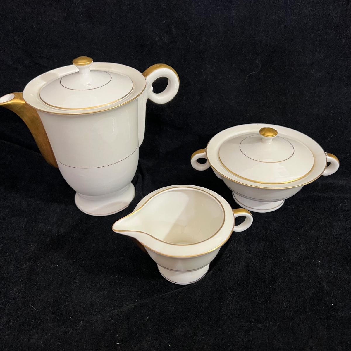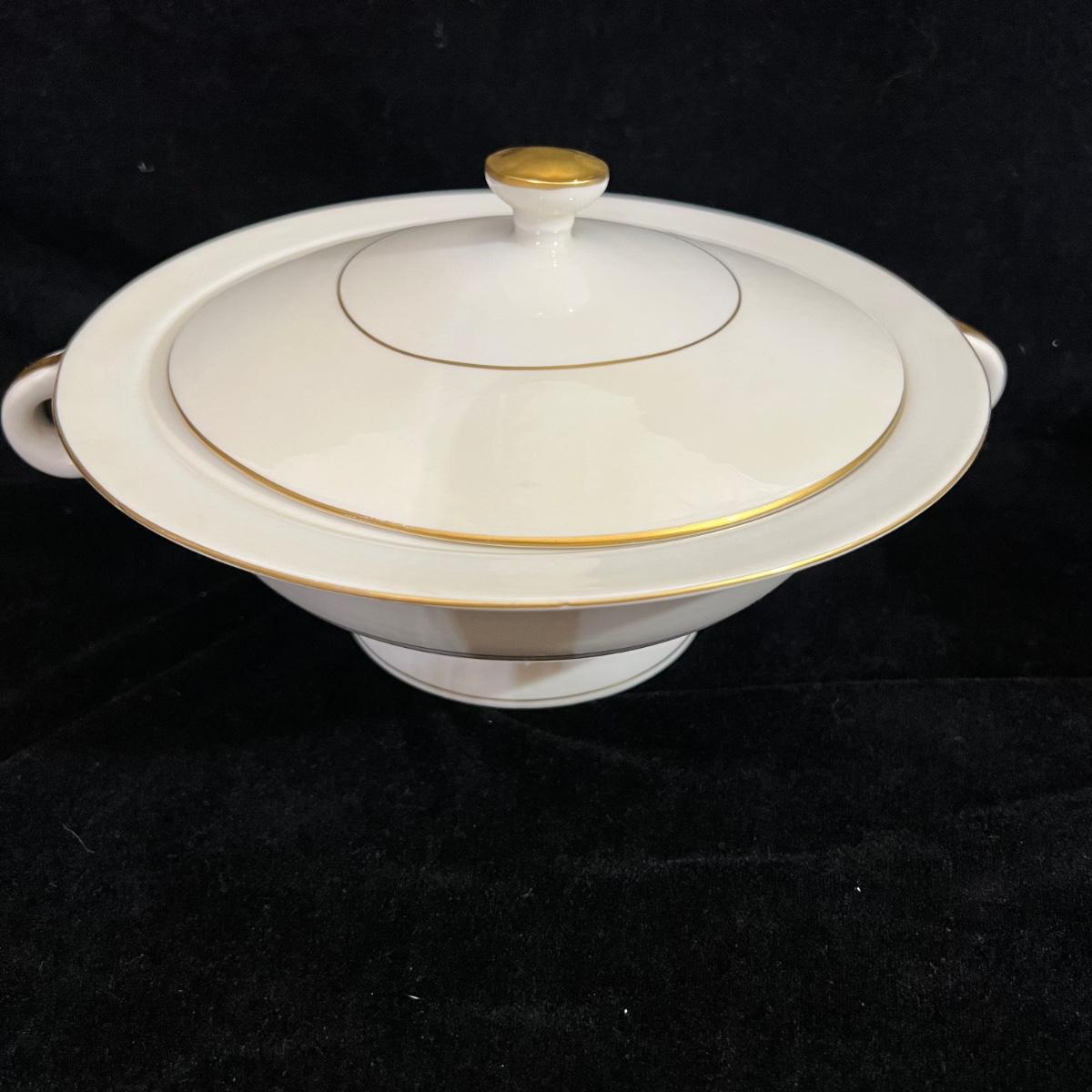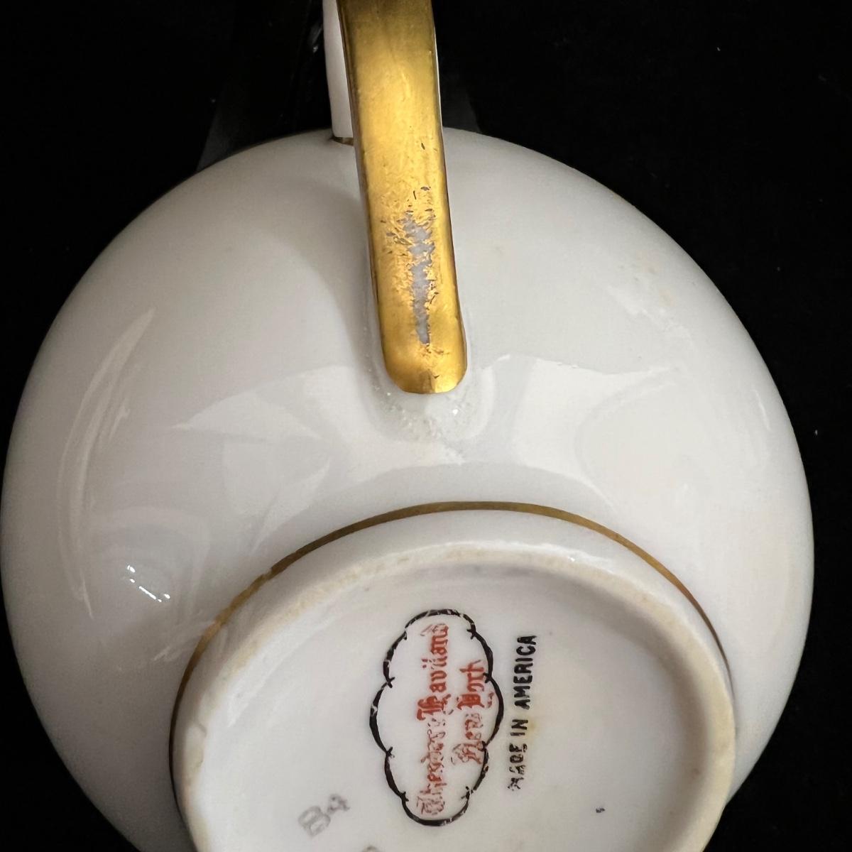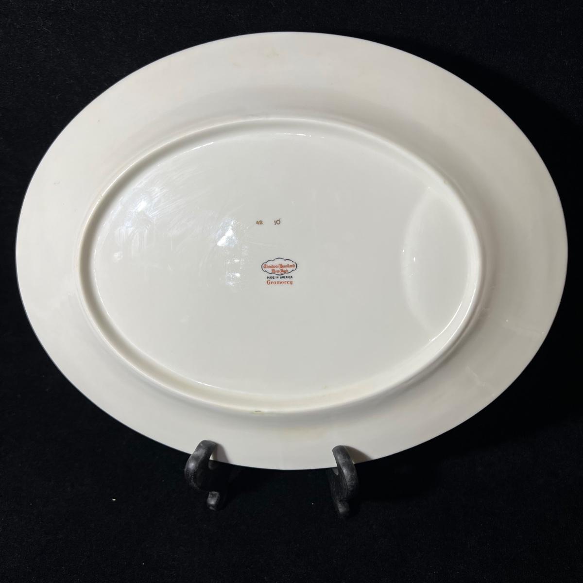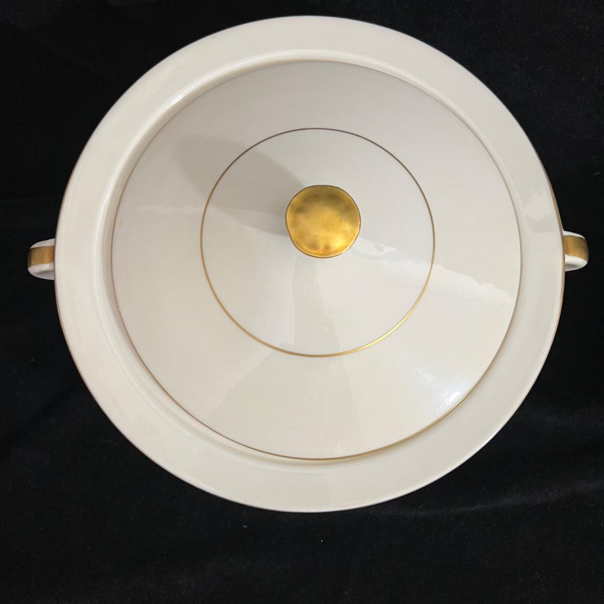 Extensive collection of Theodore Haviland “Gramercy” pattern gold trimmed bone china. Collection is in good condition with some evidence of wear (see photo) and one large chip (see photo of gravy server). Set includes five serving pieces: two oval bowls that are 9.5” L x 7.5” W x 2” H, two oval serving platters, one 11.5” L x 9” W and one 14” L x 11” W. A 9.5” D, a covered serving dish, and a gravy serving bowl with a substantial chip and crack (see photograph). Tea service includes a teapot 5” D x 6” H, sixteen teacups, eight tea saucers, one lidded sugar bowl, and one creamer. The dining service includes eight 7.5” D salad plates, eight 10”D dinner plates, and eight 8” D soup bowls. Two small dish/bowls 5”D x 1”H. Overall all could use a thorough cleaning. Plate stands not included. Shipping available.