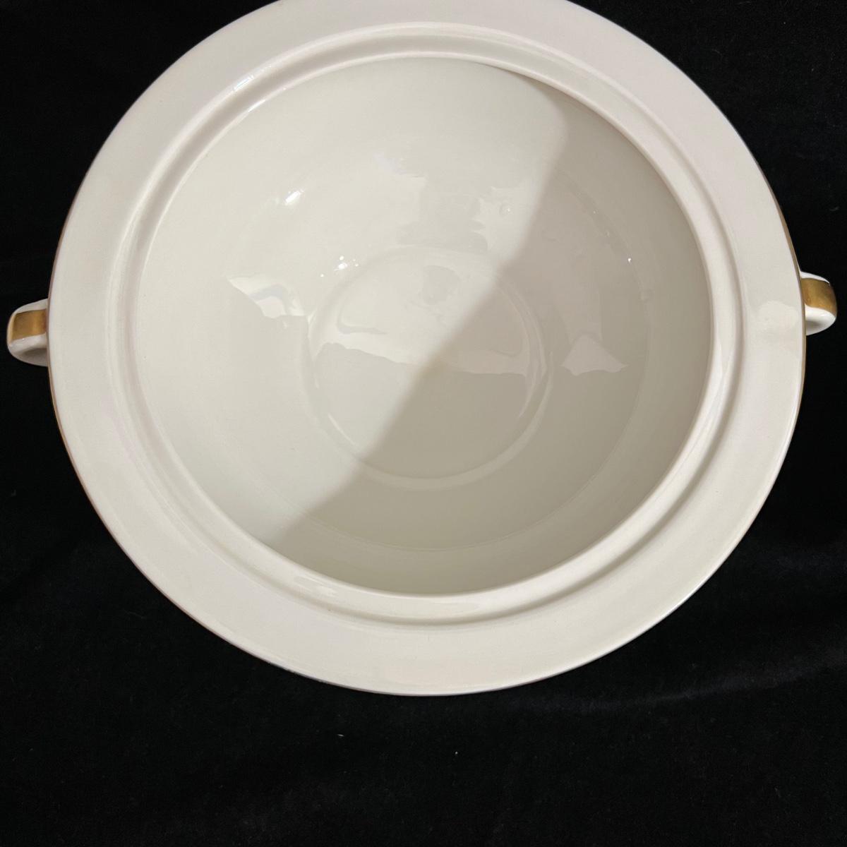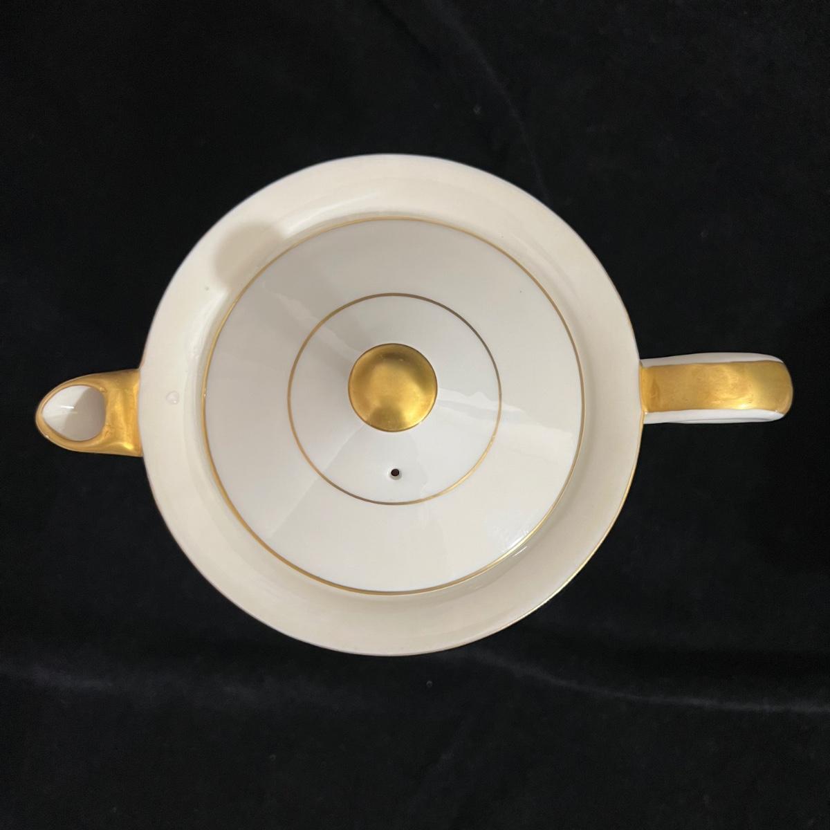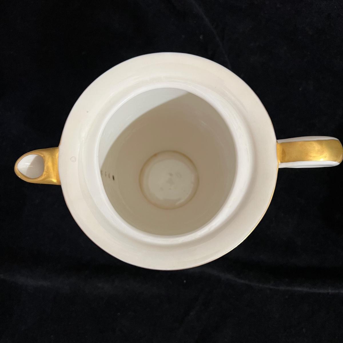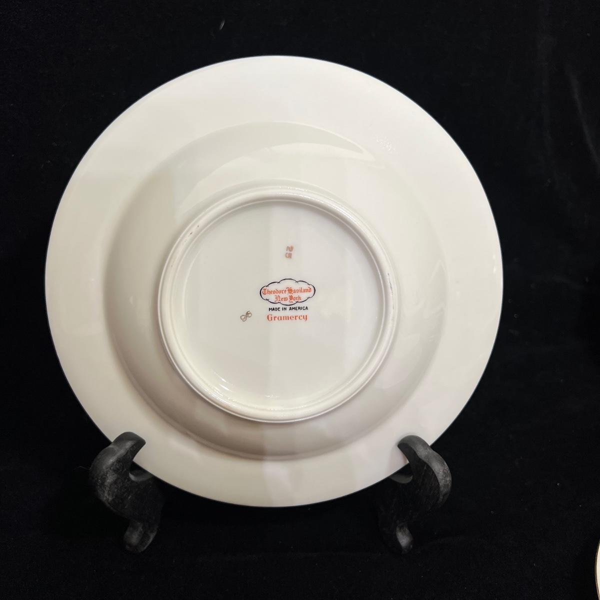 Extensive collection of Theodore Haviland “Gramercy” pattern gold trimmed bone china. Collection is in good condition with some evidence of wear (see photo) and one large chip (see photo of gravy server). Set includes five serving pieces: two oval bowls that are 9.5” L x 7.5” W x 2” H, two oval serving platters, one 11.5” L x 9” W and one 14” L x 11” W. A 9.5” D, a covered serving dish, and a gravy serving bowl with a substantial chip and crack (see photograph). Tea service includes a teapot 5” D x 6” H, sixteen teacups, eight tea saucers, one lidded sugar bowl, and one creamer. The dining service includes eight 7.5” D salad plates, eight 10”D dinner plates, and eight 8” D soup bowls. Two small dish/bowls 5”D x 1”H. Overall all could use a thorough cleaning. Plate stands not included. Shipping available.