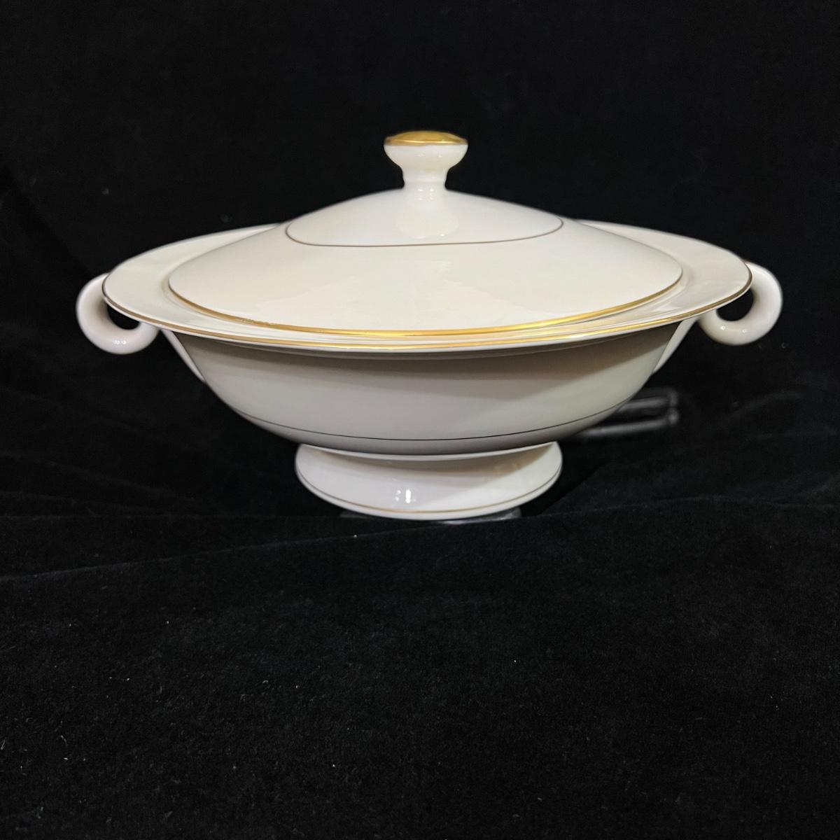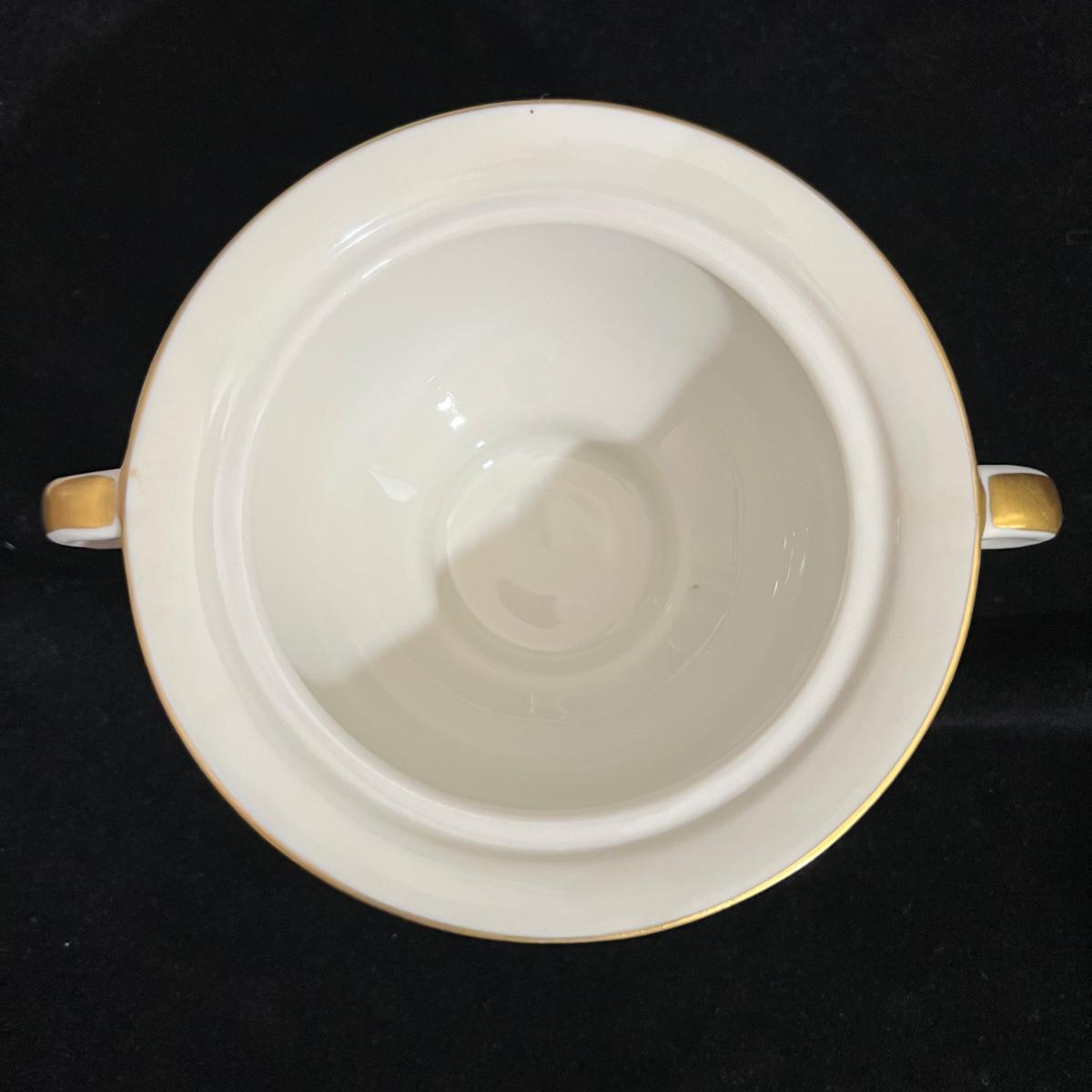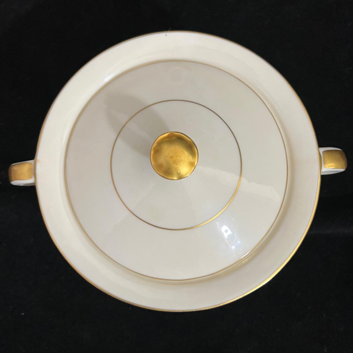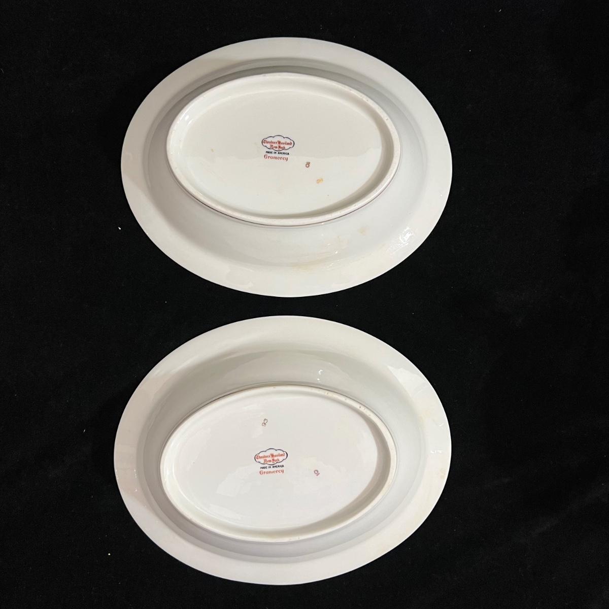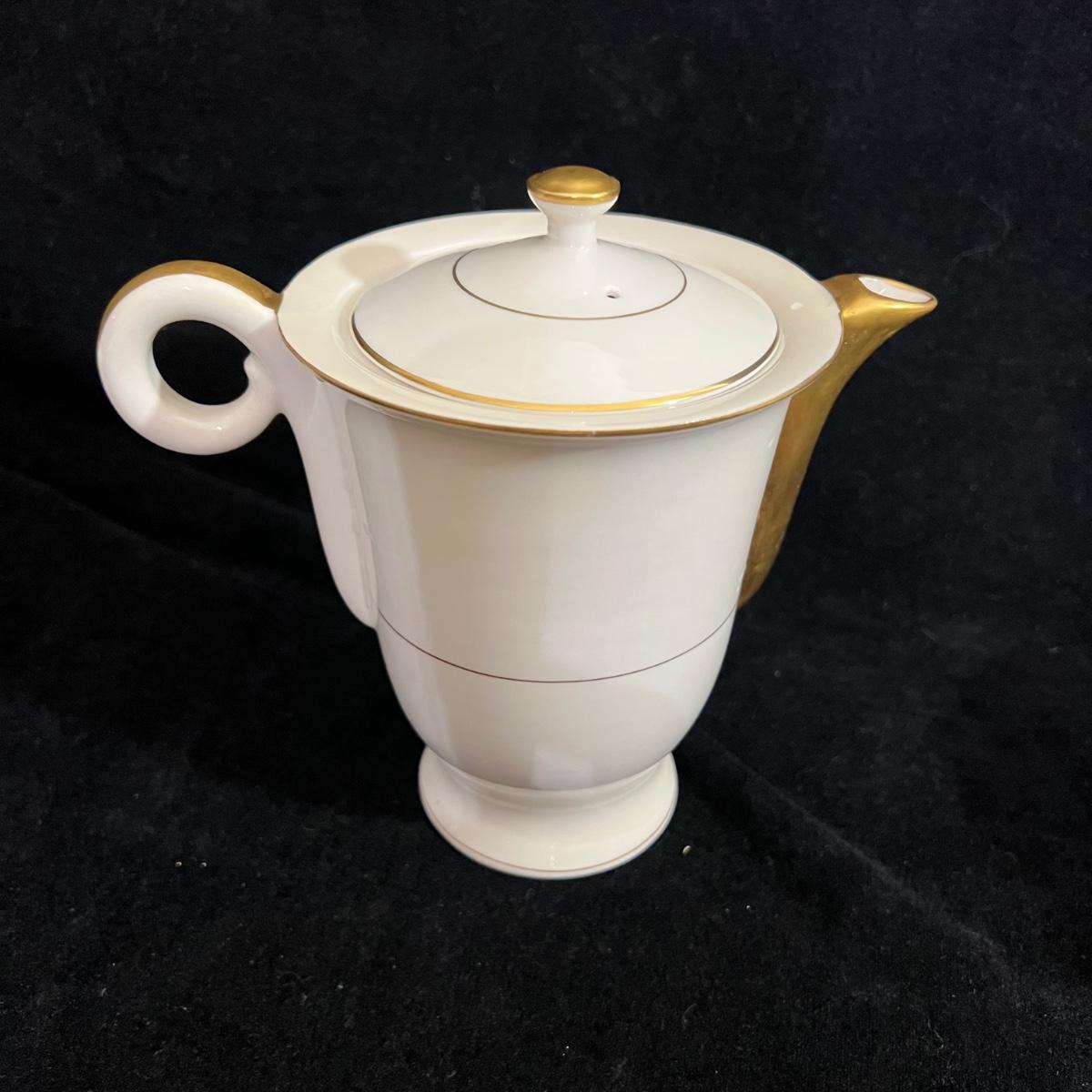 Extensive collection of Theodore Haviland “Gramercy” pattern gold trimmed bone china. Collection is in good condition with some evidence of wear (see photo) and one large chip (see photo of gravy server). Set includes five serving pieces: two oval bowls that are 9.5” L x 7.5” W x 2” H, two oval serving platters, one 11.5” L x 9” W and one 14” L x 11” W. A 9.5” D, a covered serving dish, and a gravy serving bowl with a substantial chip and crack (see photograph). Tea service includes a teapot 5” D x 6” H, sixteen teacups, eight tea saucers, one lidded sugar bowl, and one creamer. The dining service includes eight 7.5” D salad plates, eight 10”D dinner plates, and eight 8” D soup bowls. Two small dish/bowls 5”D x 1”H. Overall all could use a thorough cleaning. Plate stands not included. Shipping available.