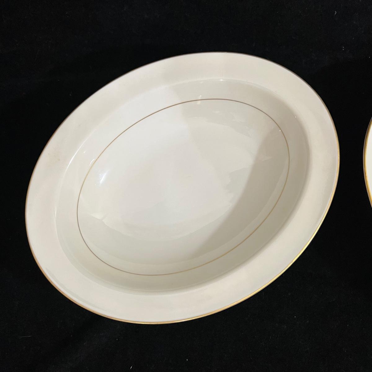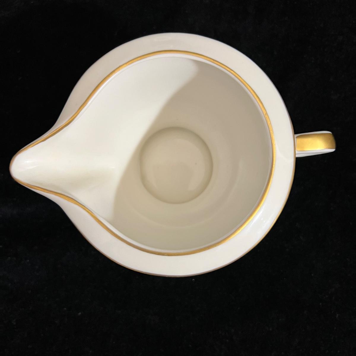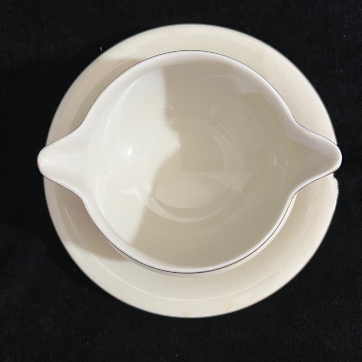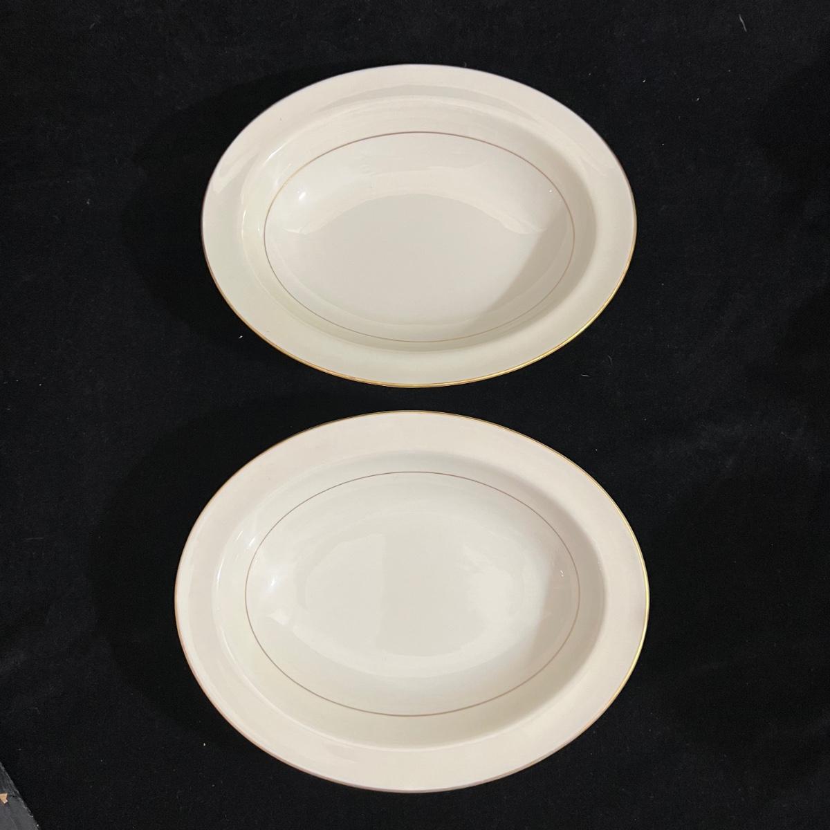 Extensive collection of Theodore Haviland “Gramercy” pattern gold trimmed bone china. Collection is in good condition with some evidence of wear (see photo) and one large chip (see photo of gravy server). Set includes five serving pieces: two oval bowls that are 9.5” L x 7.5” W x 2” H, two oval serving platters, one 11.5” L x 9” W and one 14” L x 11” W. A 9.5” D, a covered serving dish, and a gravy serving bowl with a substantial chip and crack (see photograph). Tea service includes a teapot 5” D x 6” H, sixteen teacups, eight tea saucers, one lidded sugar bowl, and one creamer. The dining service includes eight 7.5” D salad plates, eight 10”D dinner plates, and eight 8” D soup bowls. Two small dish/bowls 5”D x 1”H. Overall all could use a thorough cleaning. Plate stands not included. Shipping available.