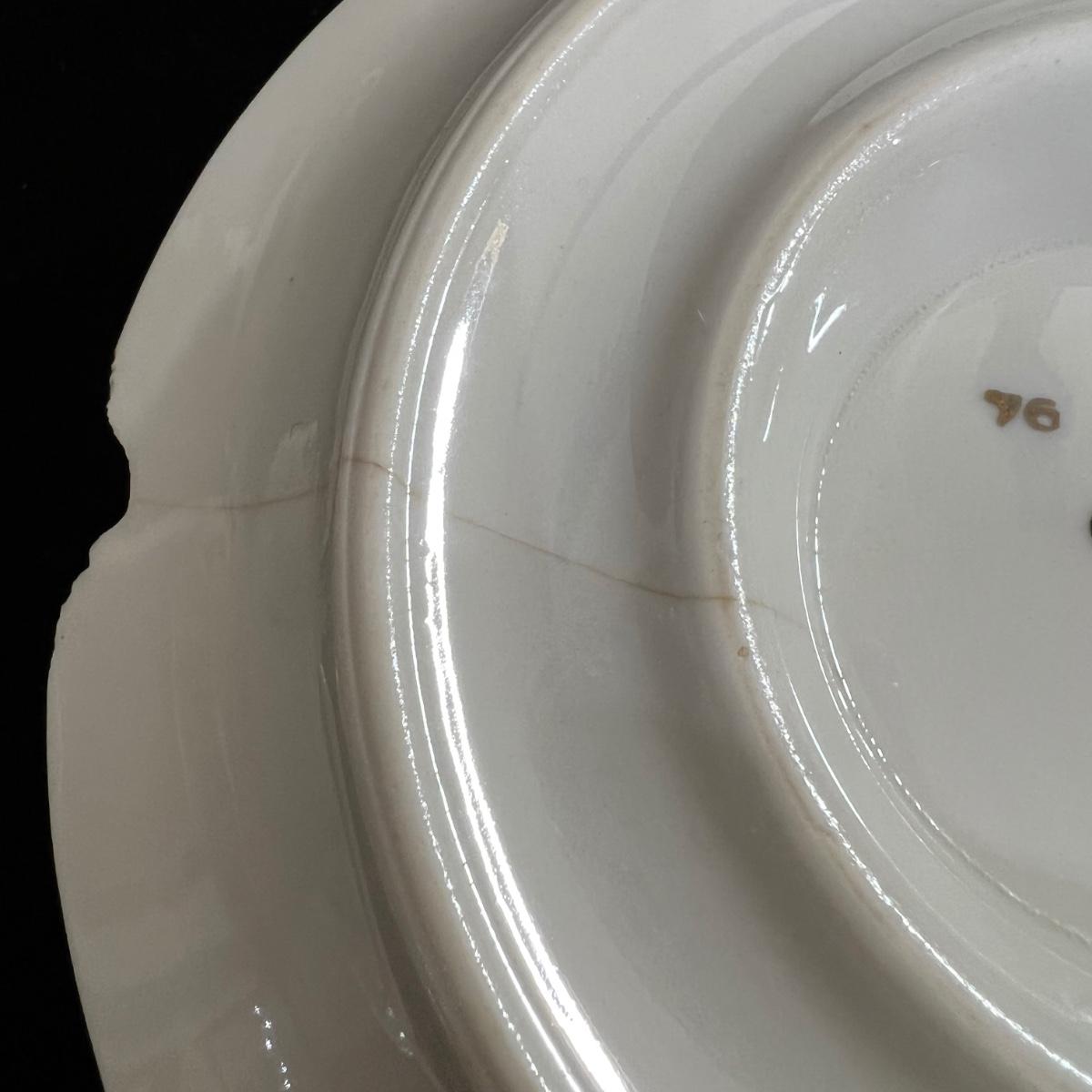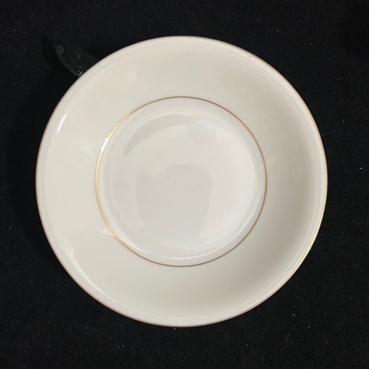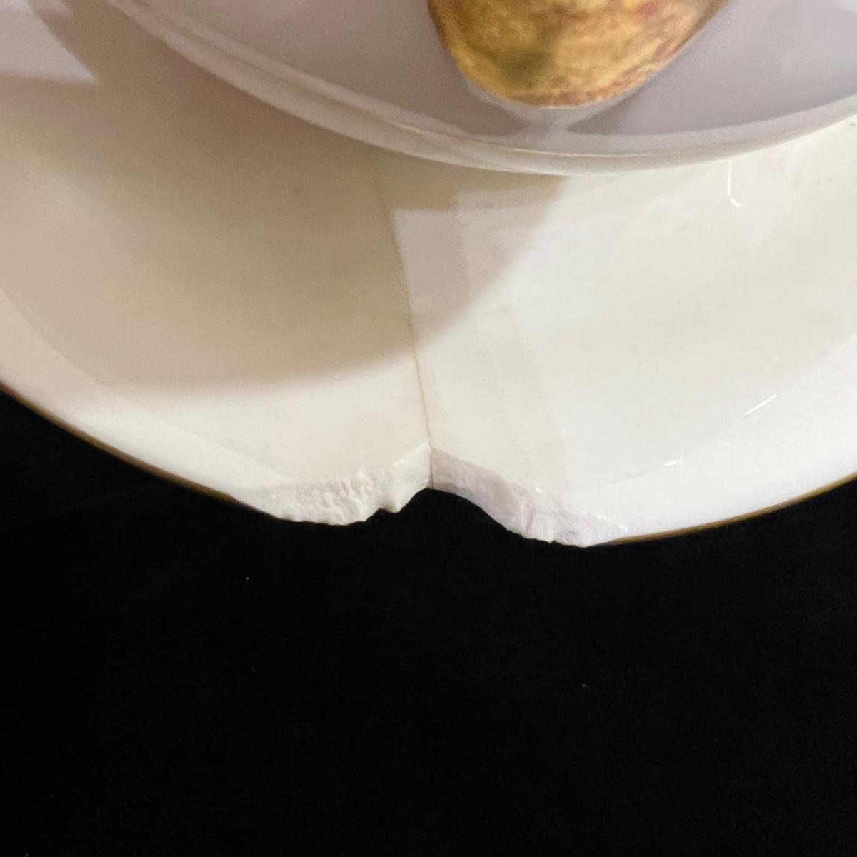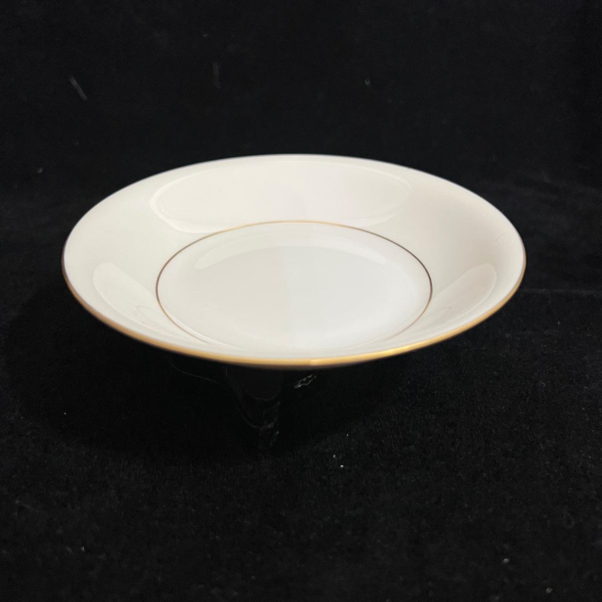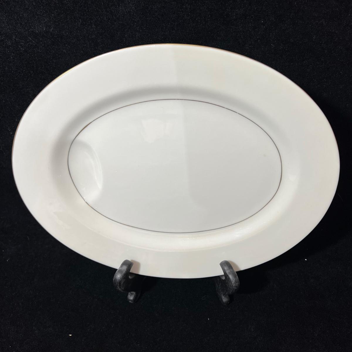 Extensive collection of Theodore Haviland “Gramercy” pattern gold trimmed bone china. Collection is in good condition with some evidence of wear (see photo) and one large chip (see photo of gravy server). Set includes five serving pieces: two oval bowls that are 9.5” L x 7.5” W x 2” H, two oval serving platters, one 11.5” L x 9” W and one 14” L x 11” W. A 9.5” D, a covered serving dish, and a gravy serving bowl with a substantial chip and crack (see photograph). Tea service includes a teapot 5” D x 6” H, sixteen teacups, eight tea saucers, one lidded sugar bowl, and one creamer. The dining service includes eight 7.5” D salad plates, eight 10”D dinner plates, and eight 8” D soup bowls. Two small dish/bowls 5”D x 1”H. Overall all could use a thorough cleaning. Plate stands not included. Shipping available.