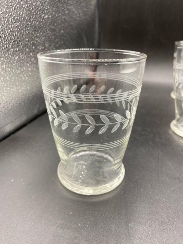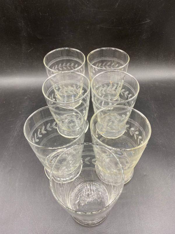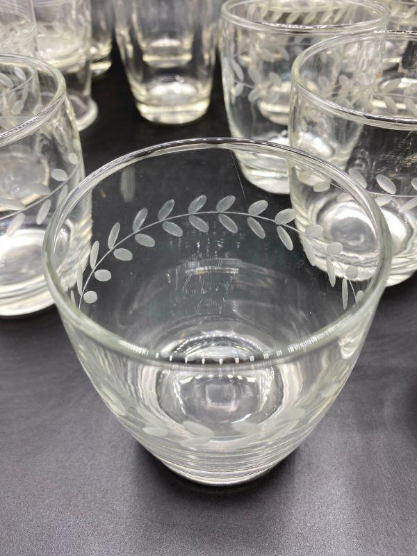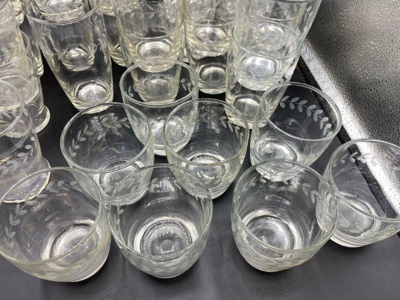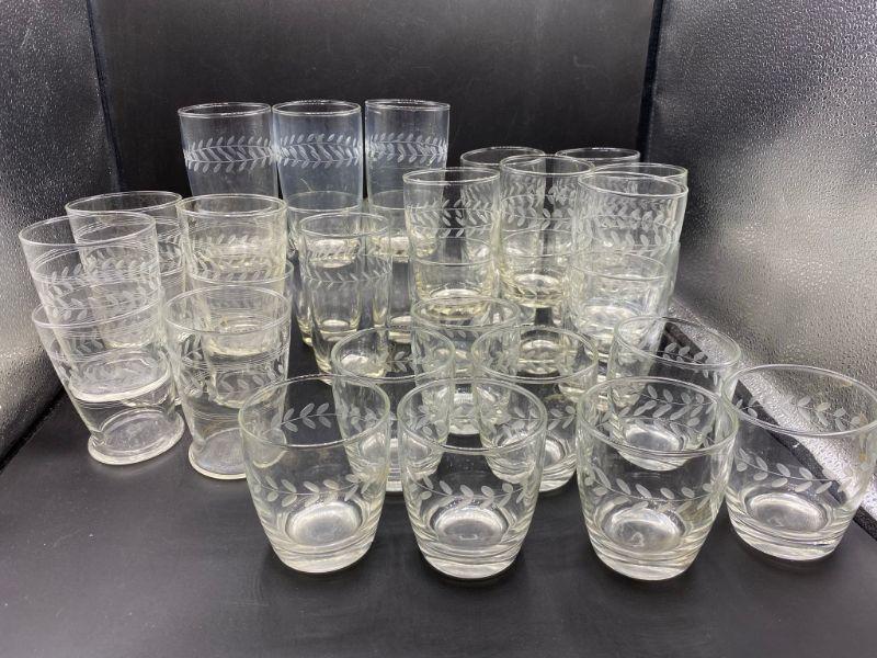 Large set of vintage drink glasses. Etched vine design. Four different size glasses. 34 total. Did not noticed any chipped pieces. Local Pick Up Only.