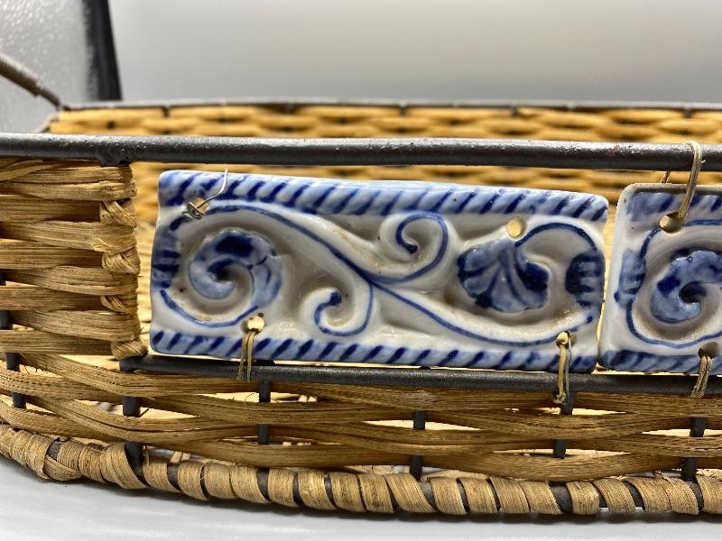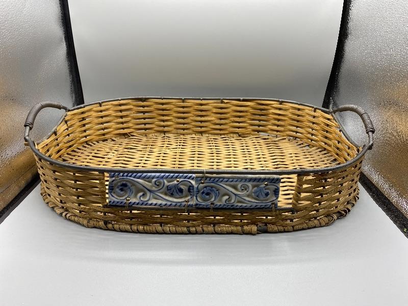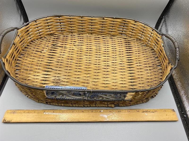 Large shallow oval basket. Made of metal and wicker. Has white and blue tile accent on one side. Tile needs to be reconnected at the top. Measures about 20"x 12" and is 3.5" deep.