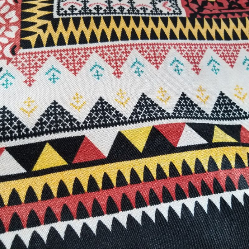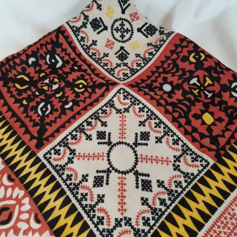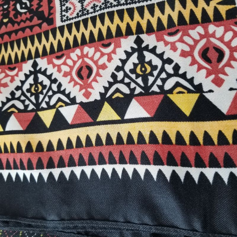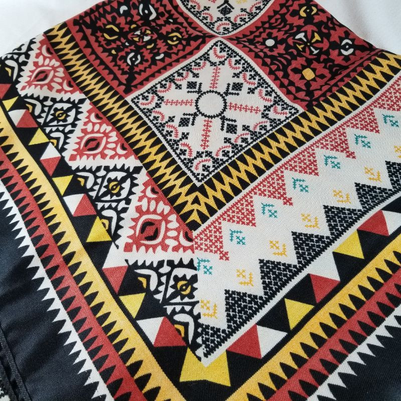 Oblong beautiful shawl or could be used on a table. All four corners have a tassel and is of a wonderful mosaic pattern in black, ivory, goldenrod, burnt red and teal. It's made of acrylic material. Appears to have never been used or worn and in very good condition. It is 68-inches long X 38-inches wide. Very Pretty.