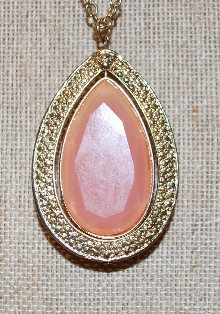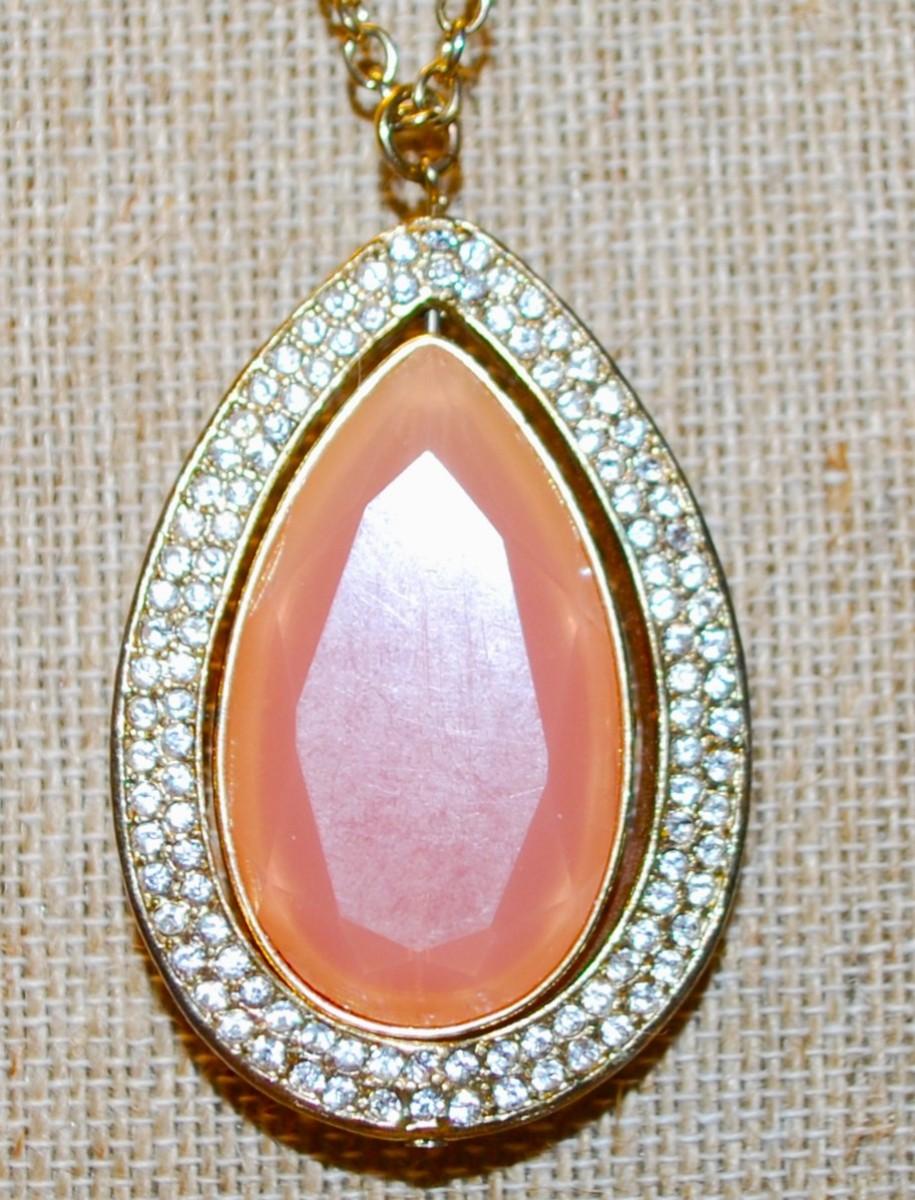 Large Showy Pink Pear Shaped PENDANT (2¼" x 1½") & Double Rows Clear Stone Accents on a Necklace Chain 30" L