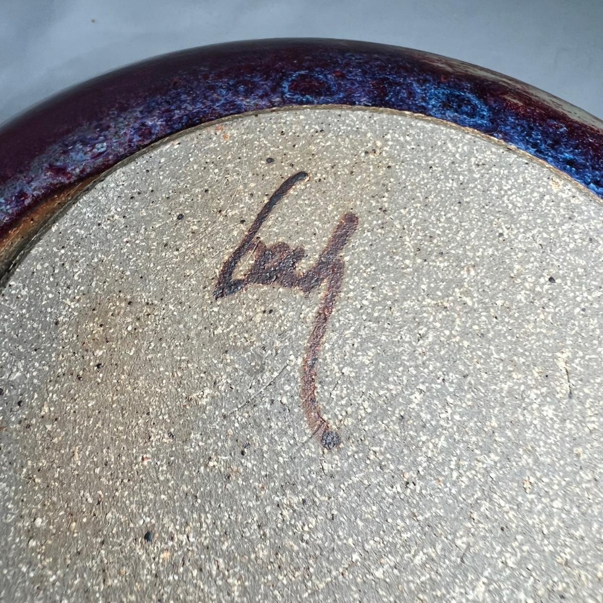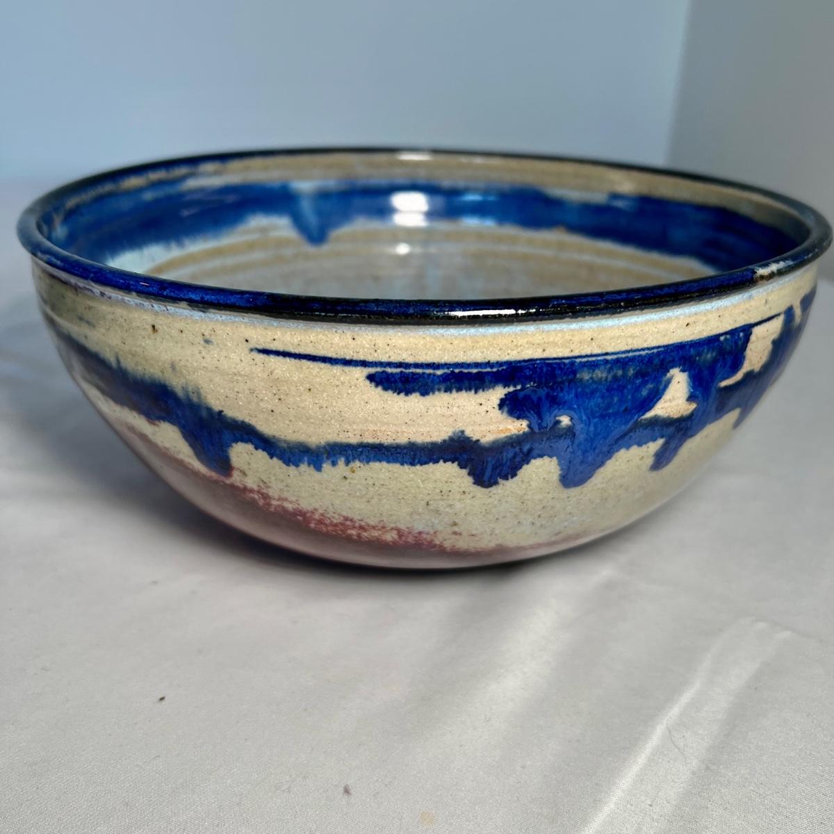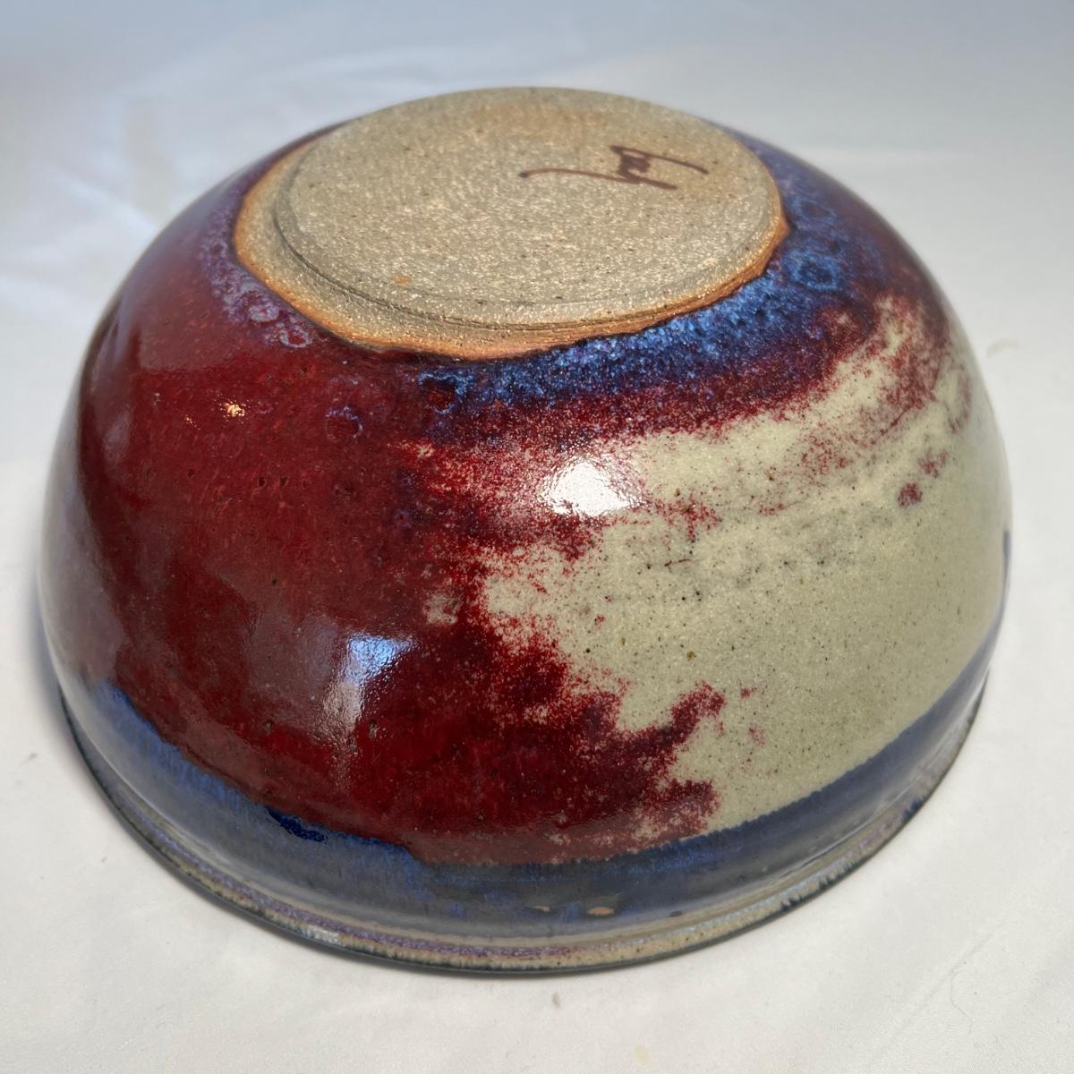 This stunning stoneware bowl is signed by the potter and appears to read "bach". Its dramatic glaze includes cobalt blue, purples and iron oxide red. In excellent condition with no chips, cracks or crazing, it measures 9” diameter x 4” tall.