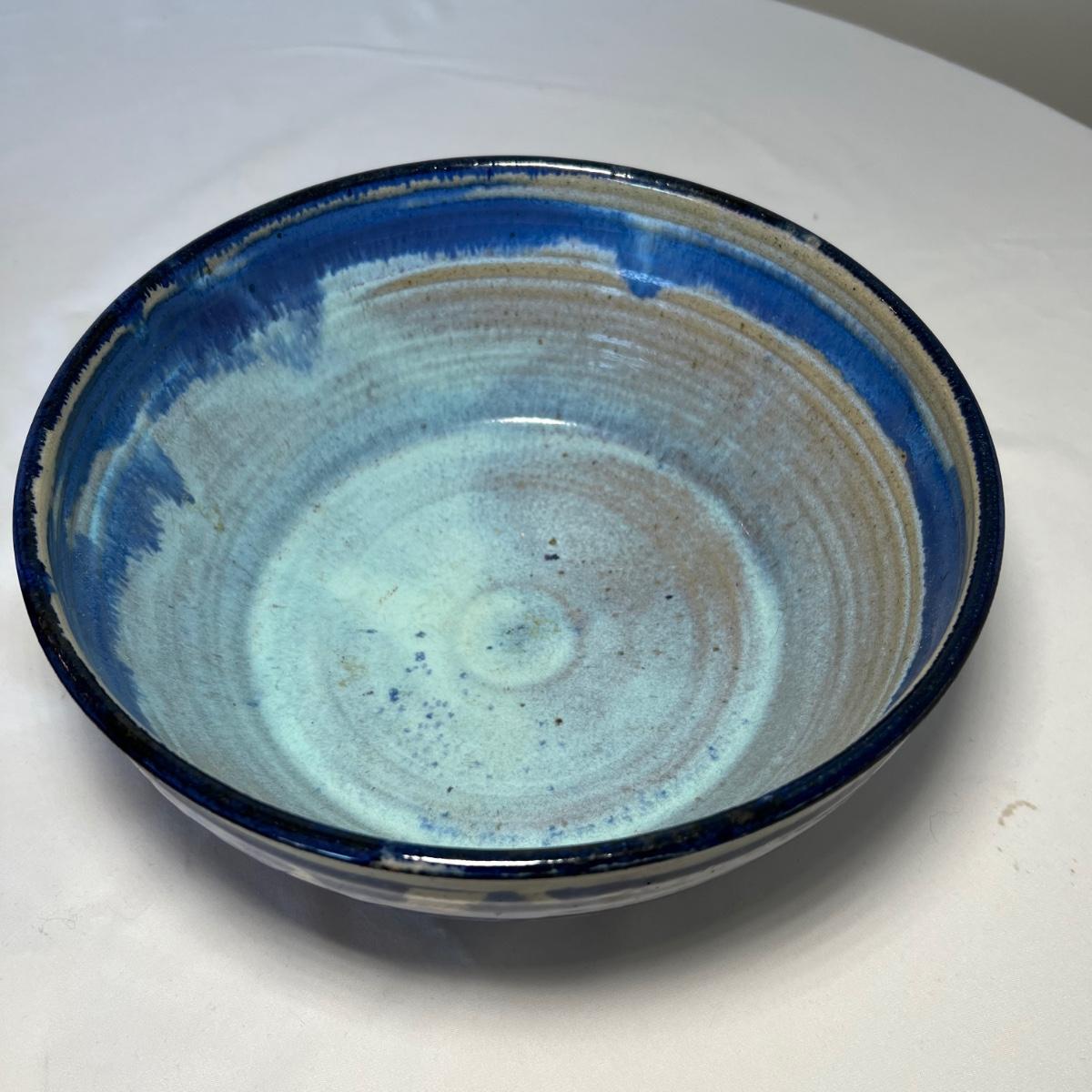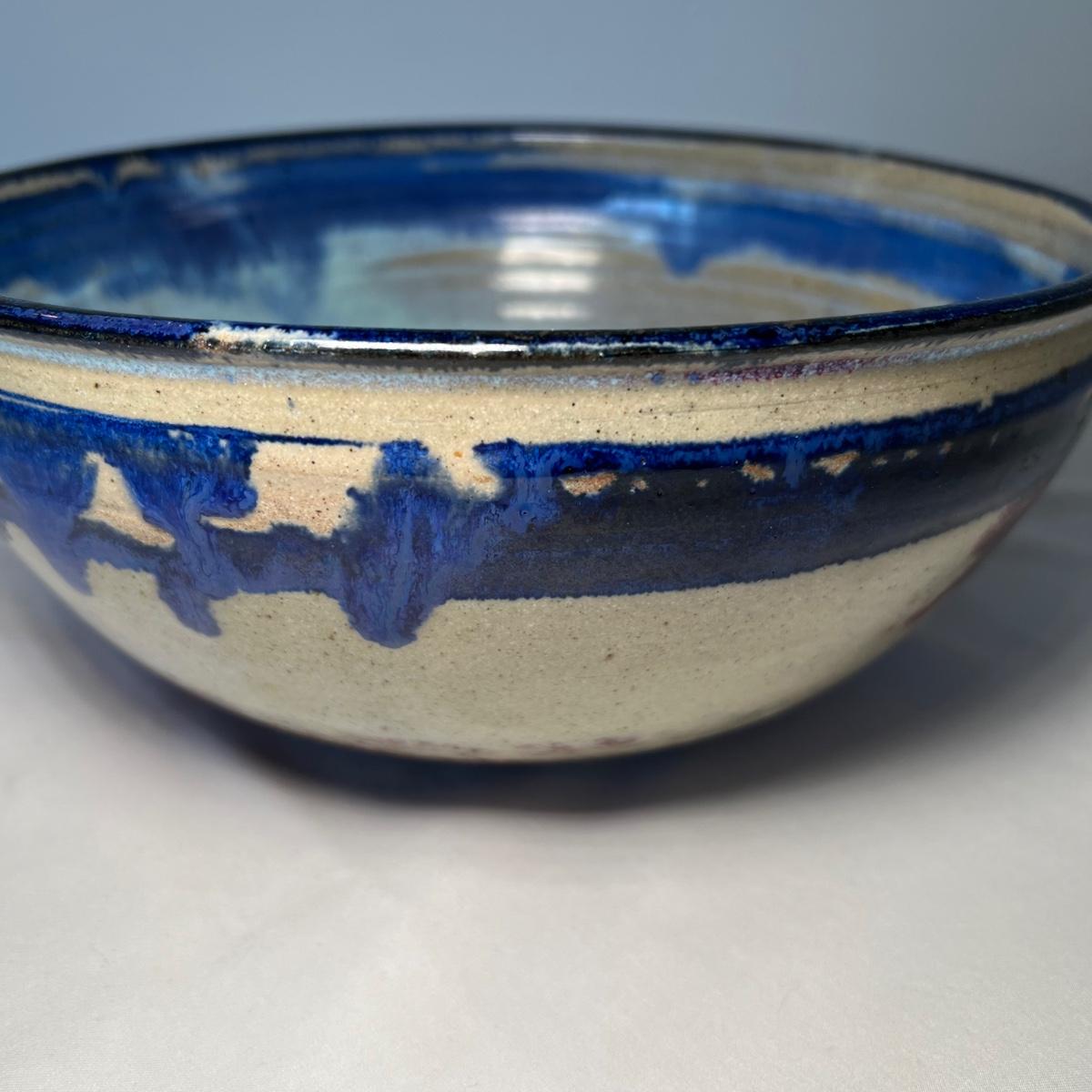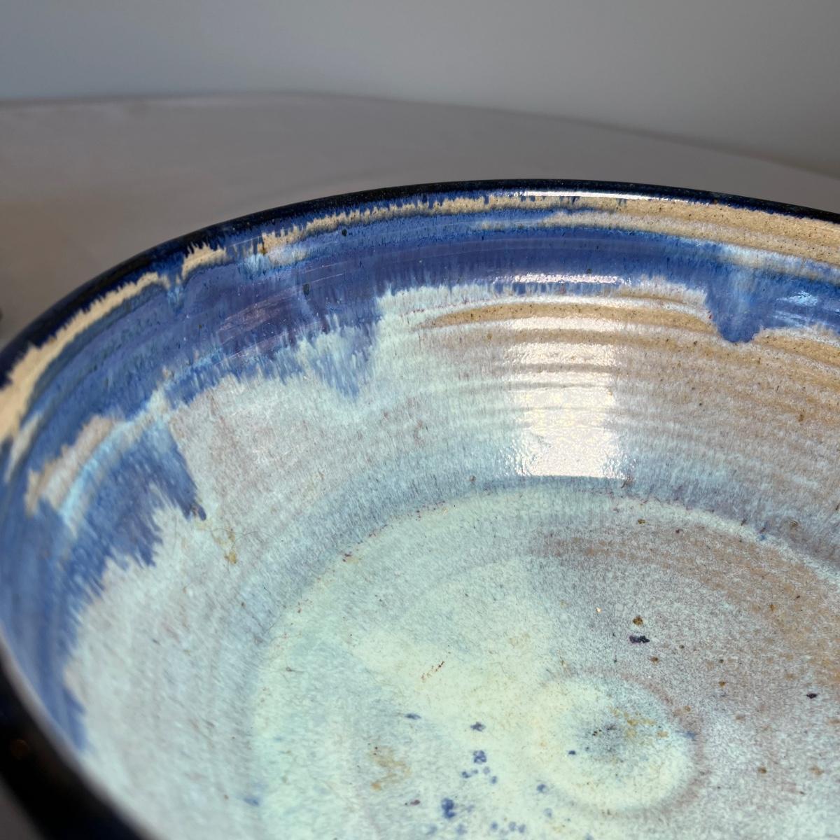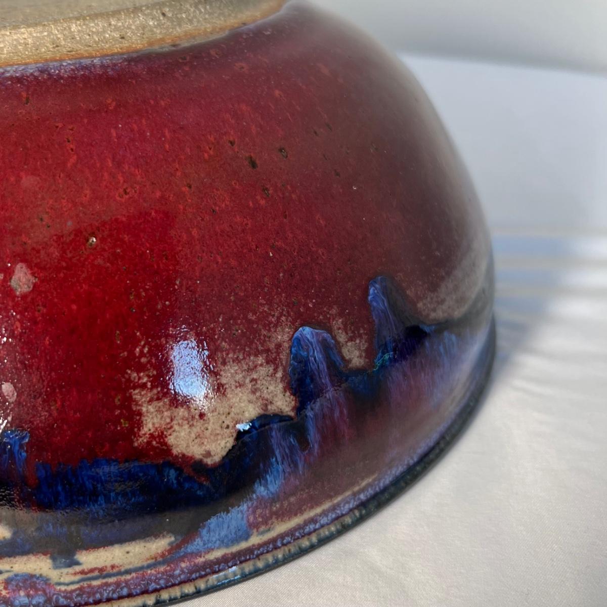 This stunning stoneware bowl is signed by the potter and appears to read "bach". Its dramatic glaze includes cobalt blue, purples and iron oxide red. In excellent condition with no chips, cracks or crazing, it measures 9” diameter x 4” tall.