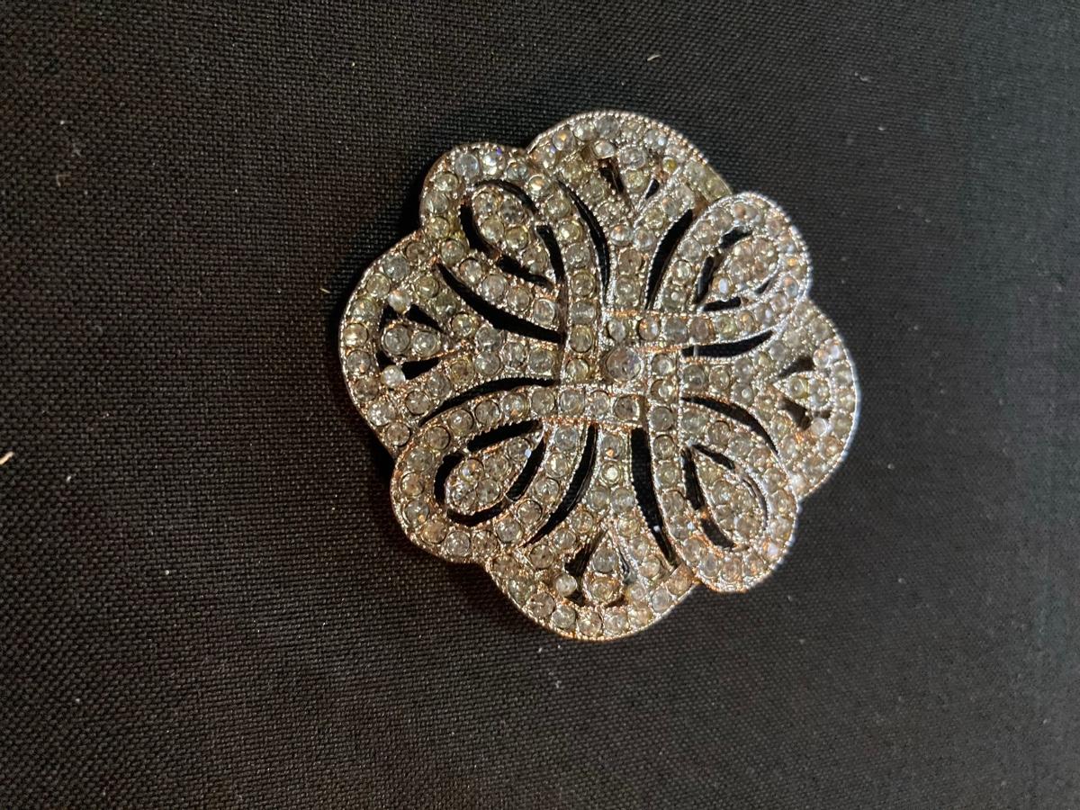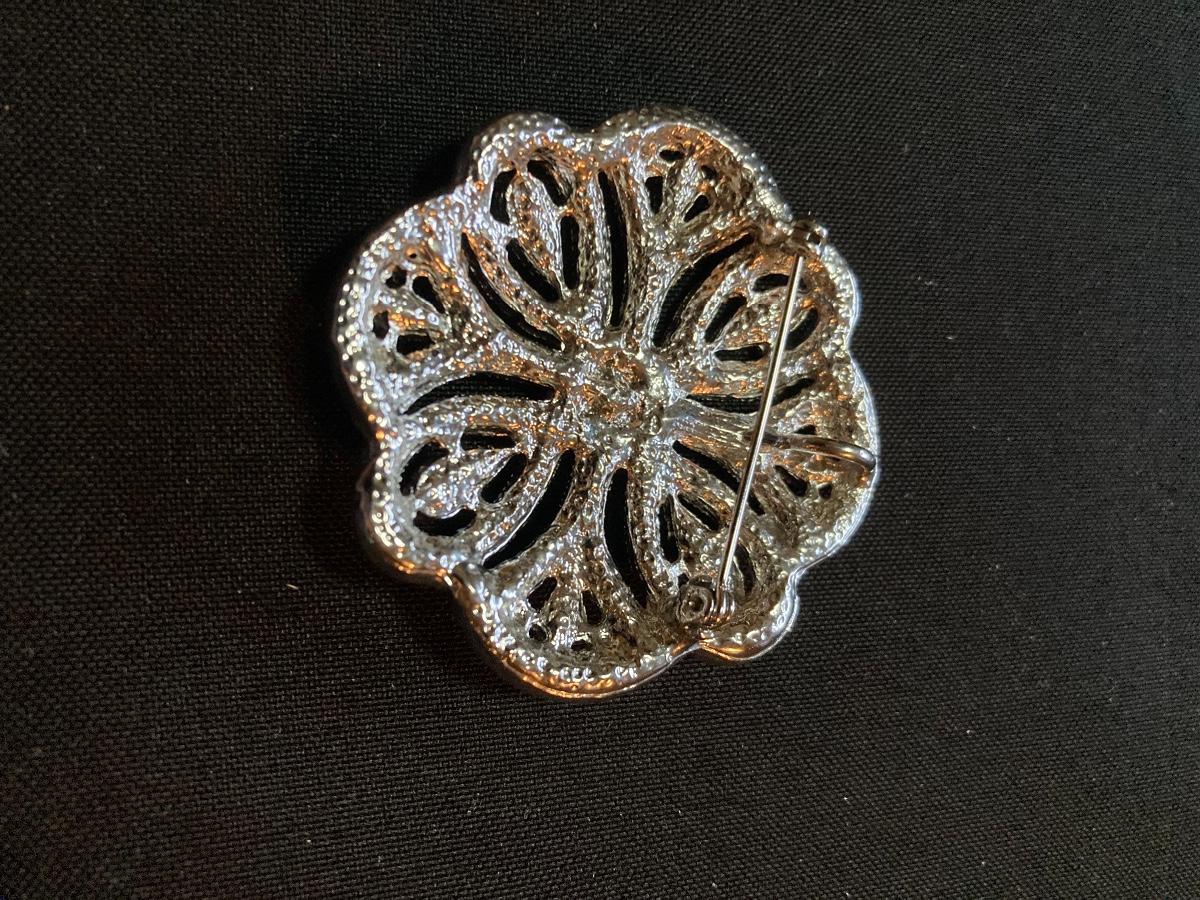 Large Silver Brooch with Rhinestone Style Floral Decor