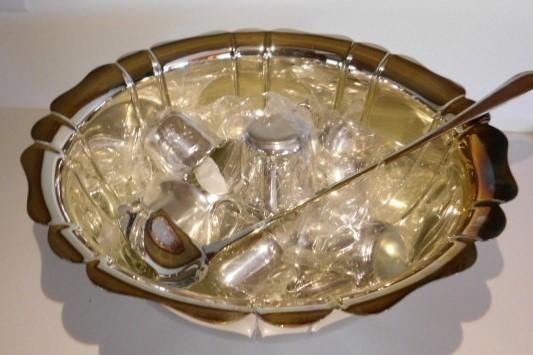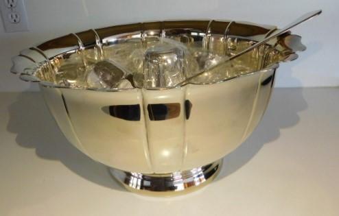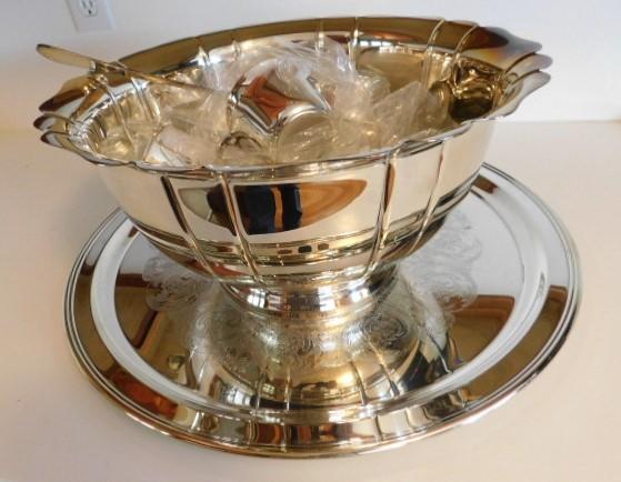 Large Silver Plate Punch Bowl with 12 Cups, Platter, and Ladel