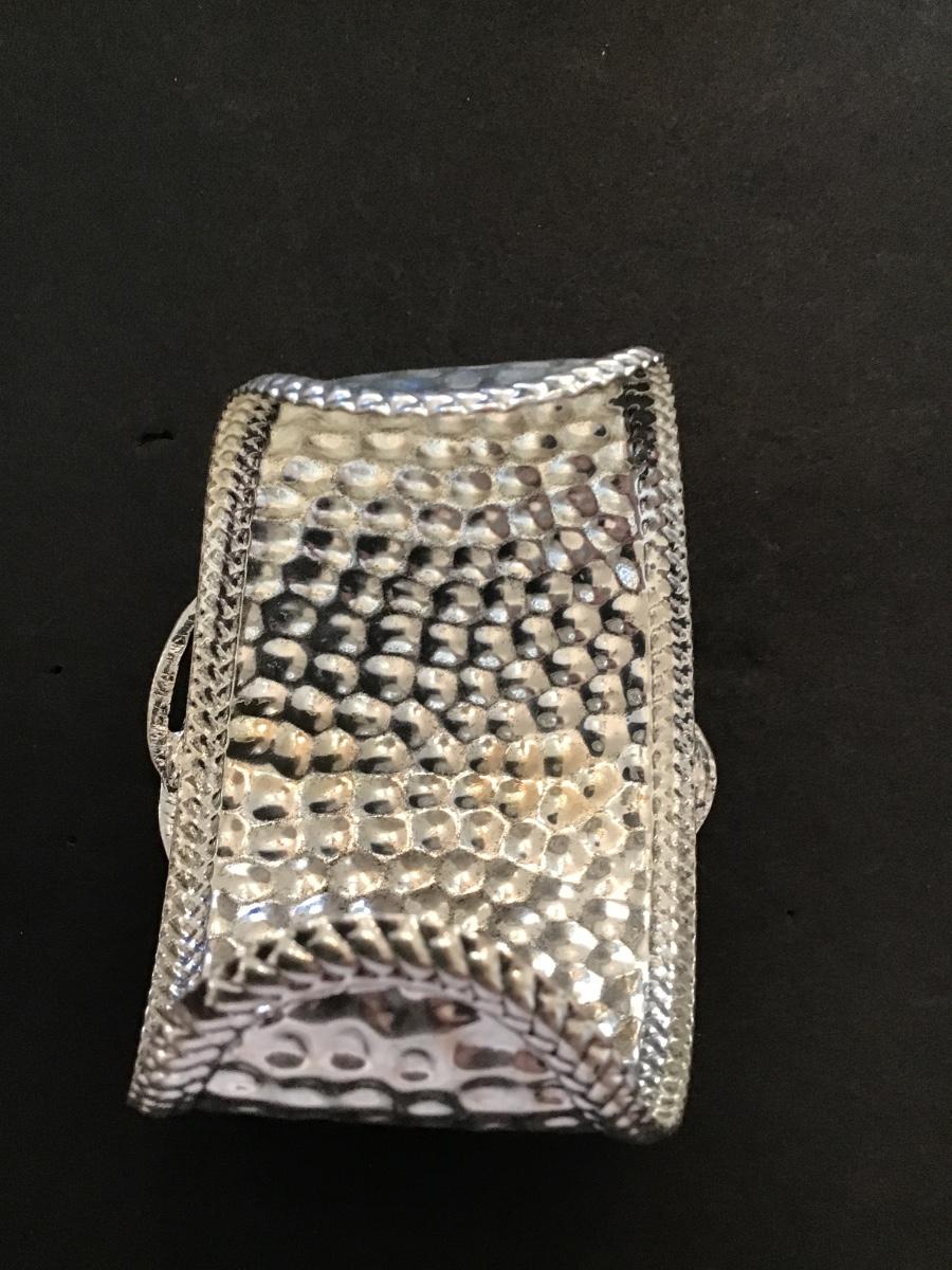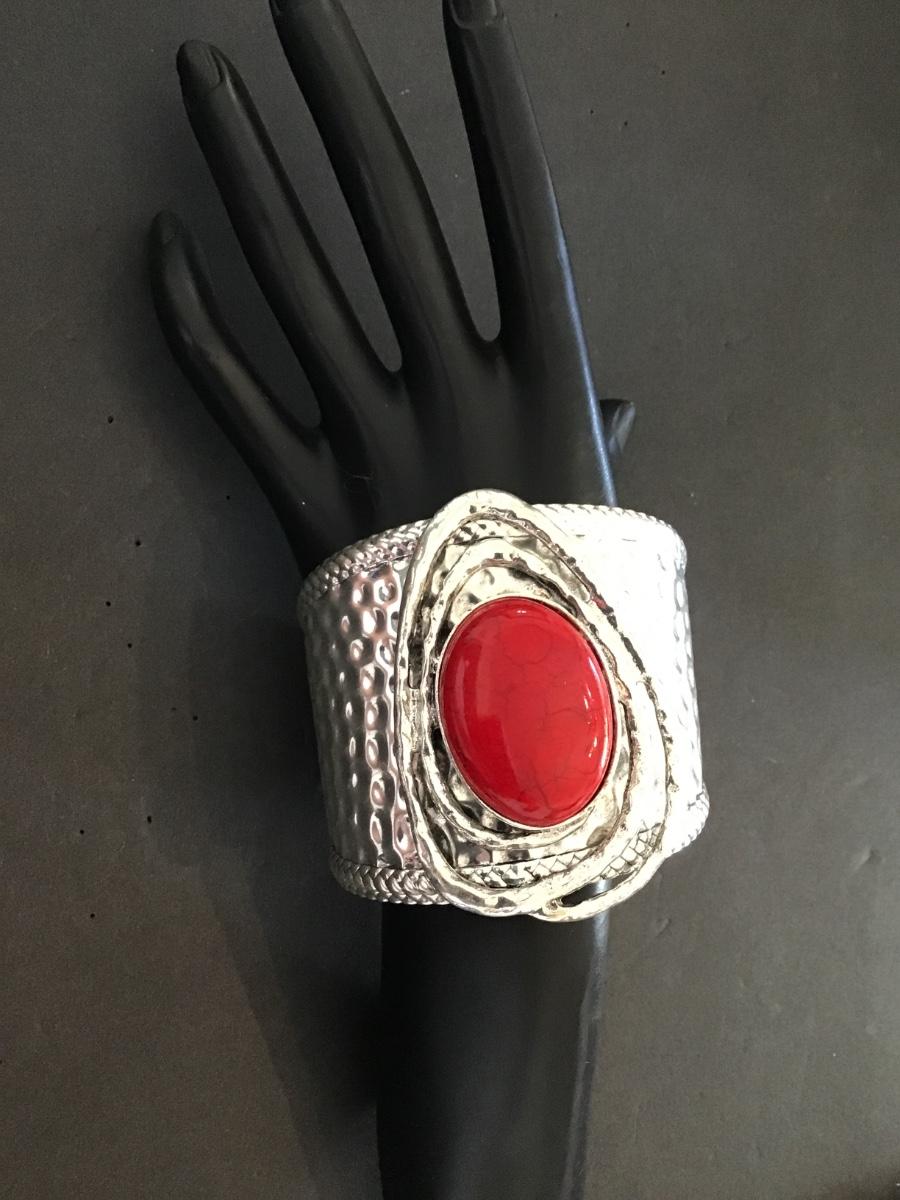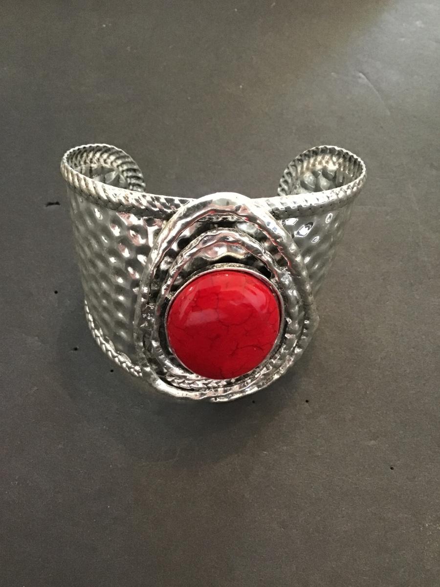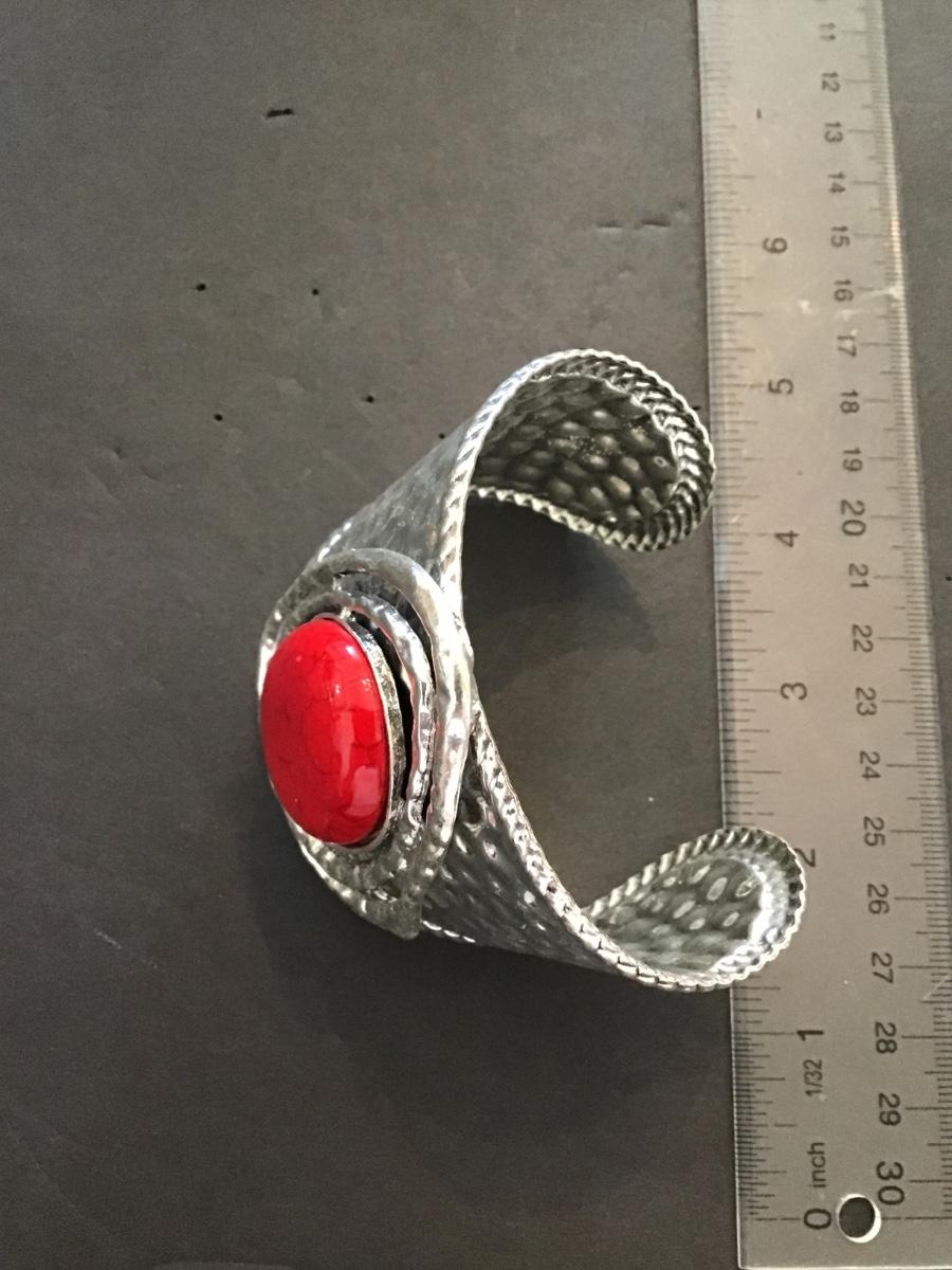 Large silver tone cuff with red faux stone. Please see attached photos.